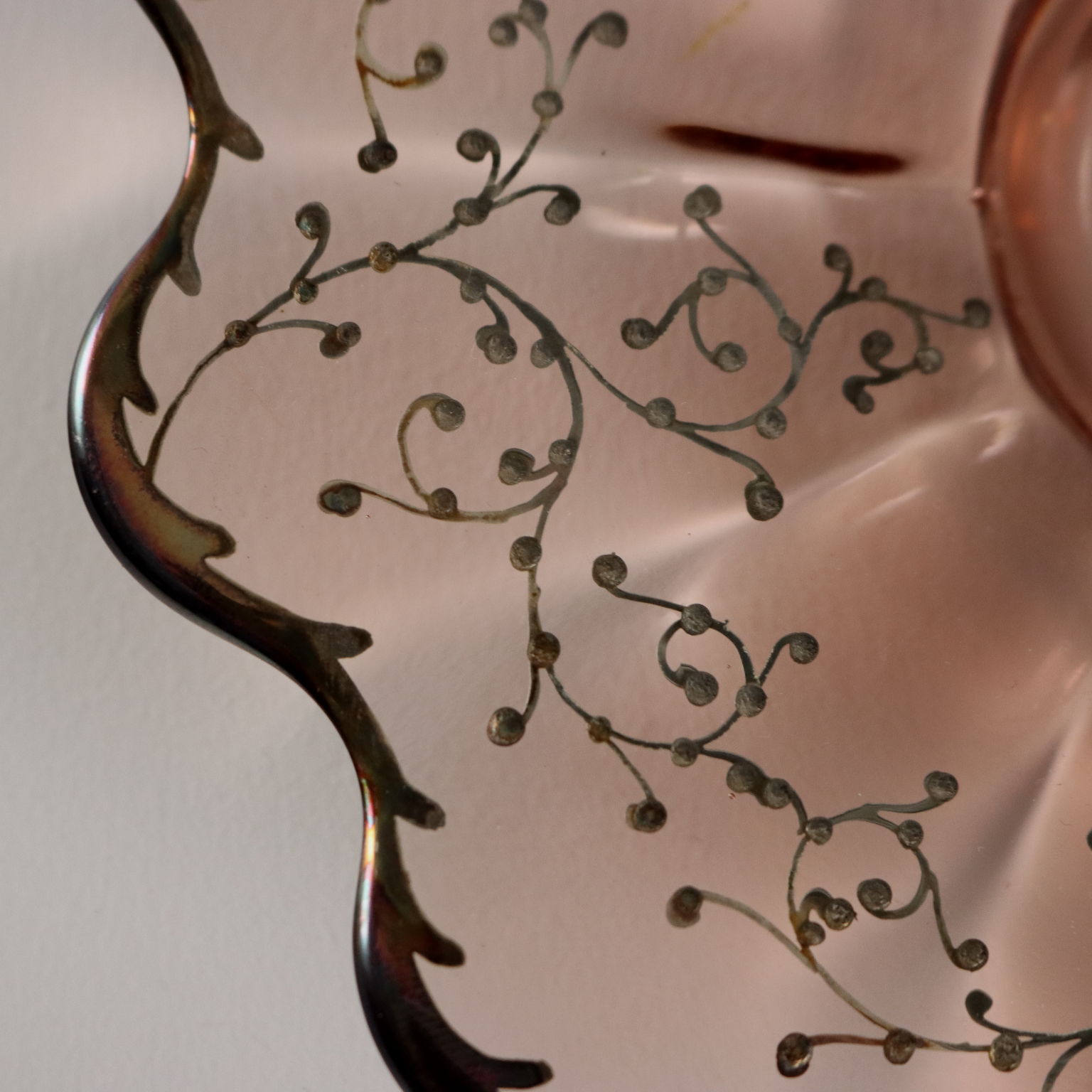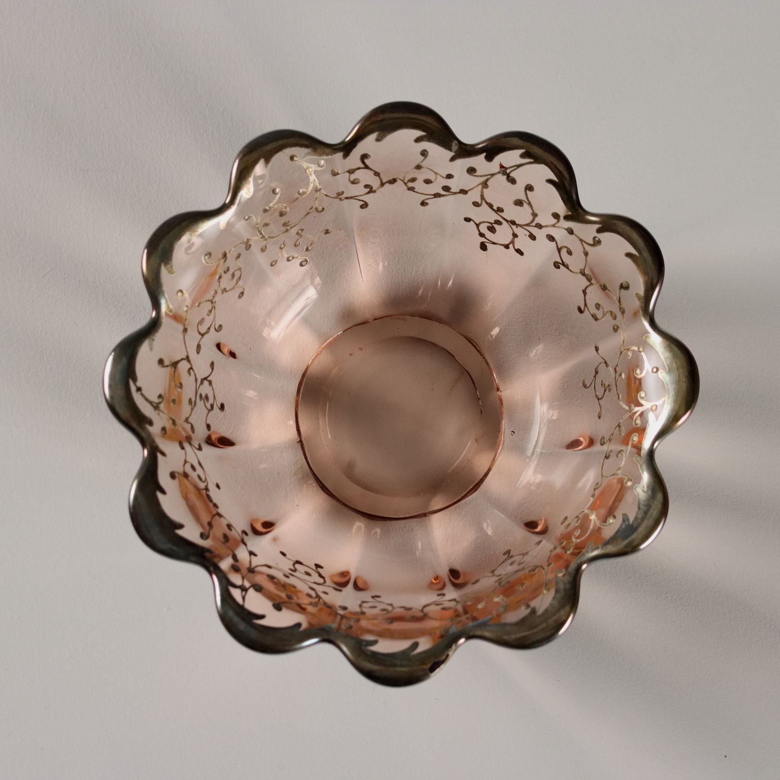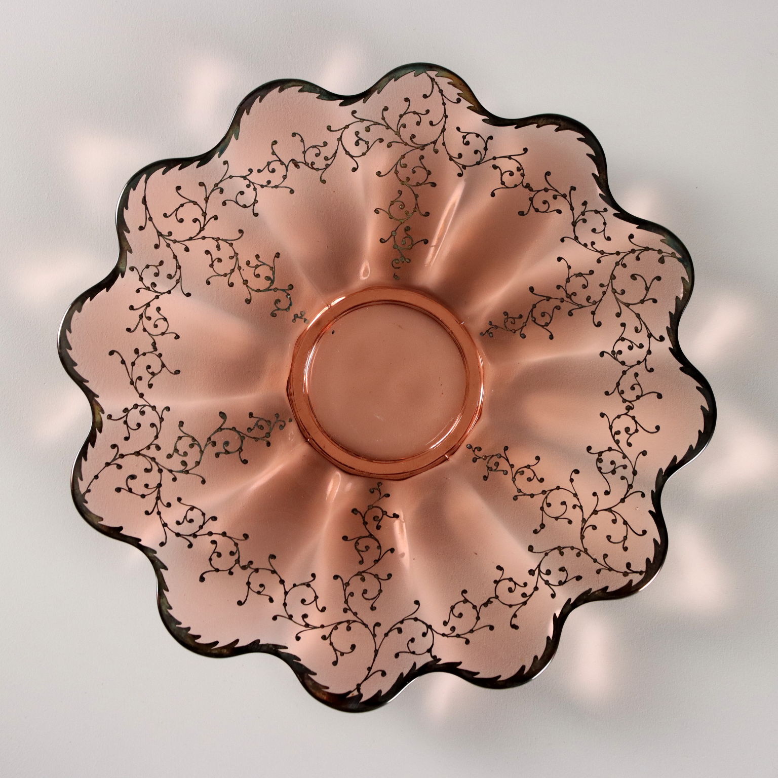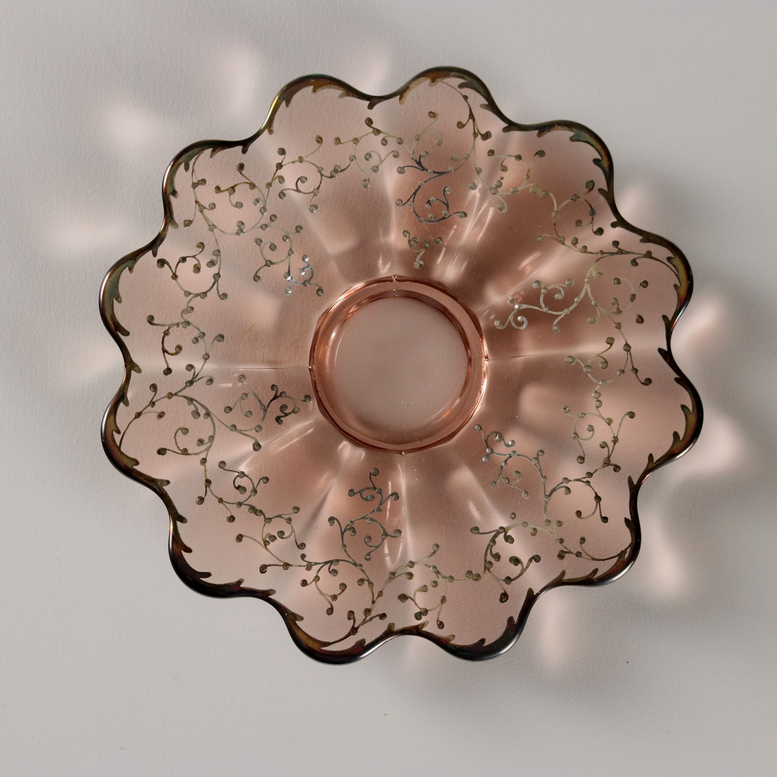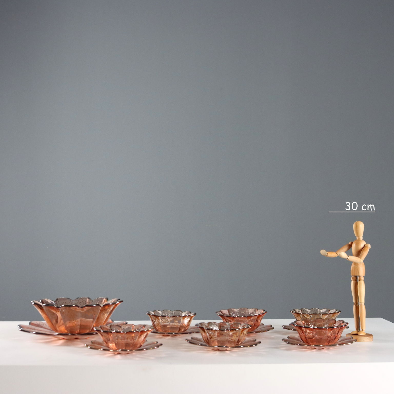 Glass dessert and fruit salad set, finely decorated with silver on the edges and along the rim with plant motifs. The set for six consists of bowls and saucers, a large plate, and a large bowl.