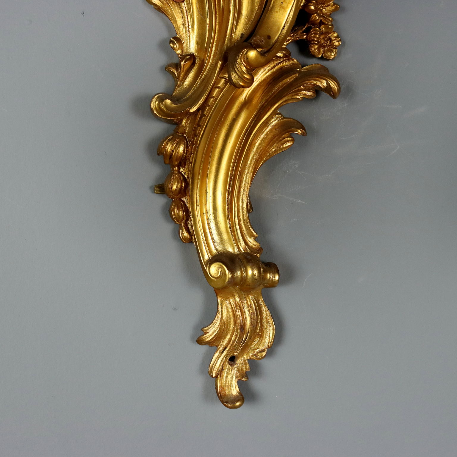 Pair of gilded bronze wall lamps. Finely crafted structure with Rocaille motifs, two lights supported by intertwined arms, with flower-patterned opaline glass lampshades. Italy, late 19th century.