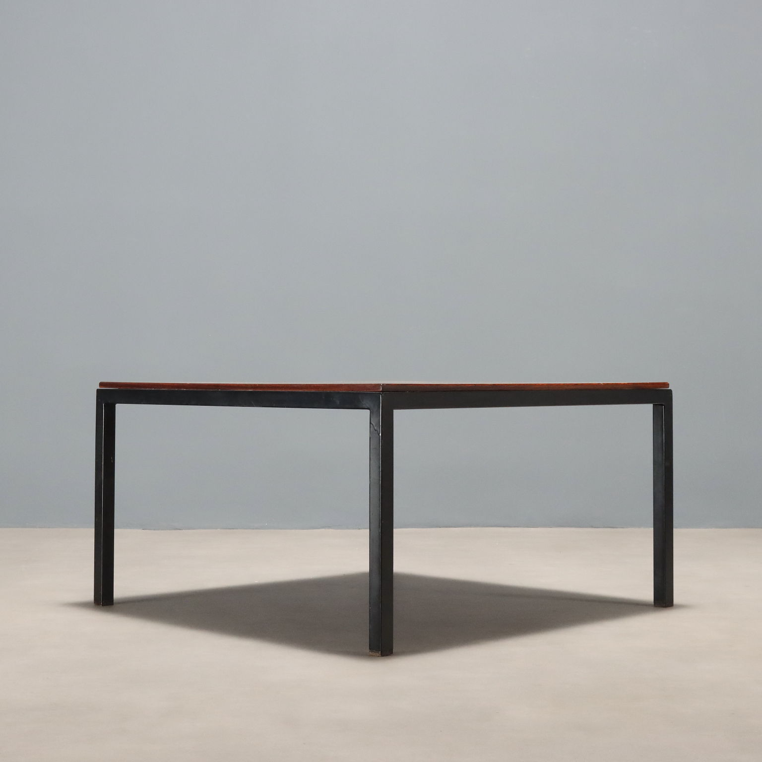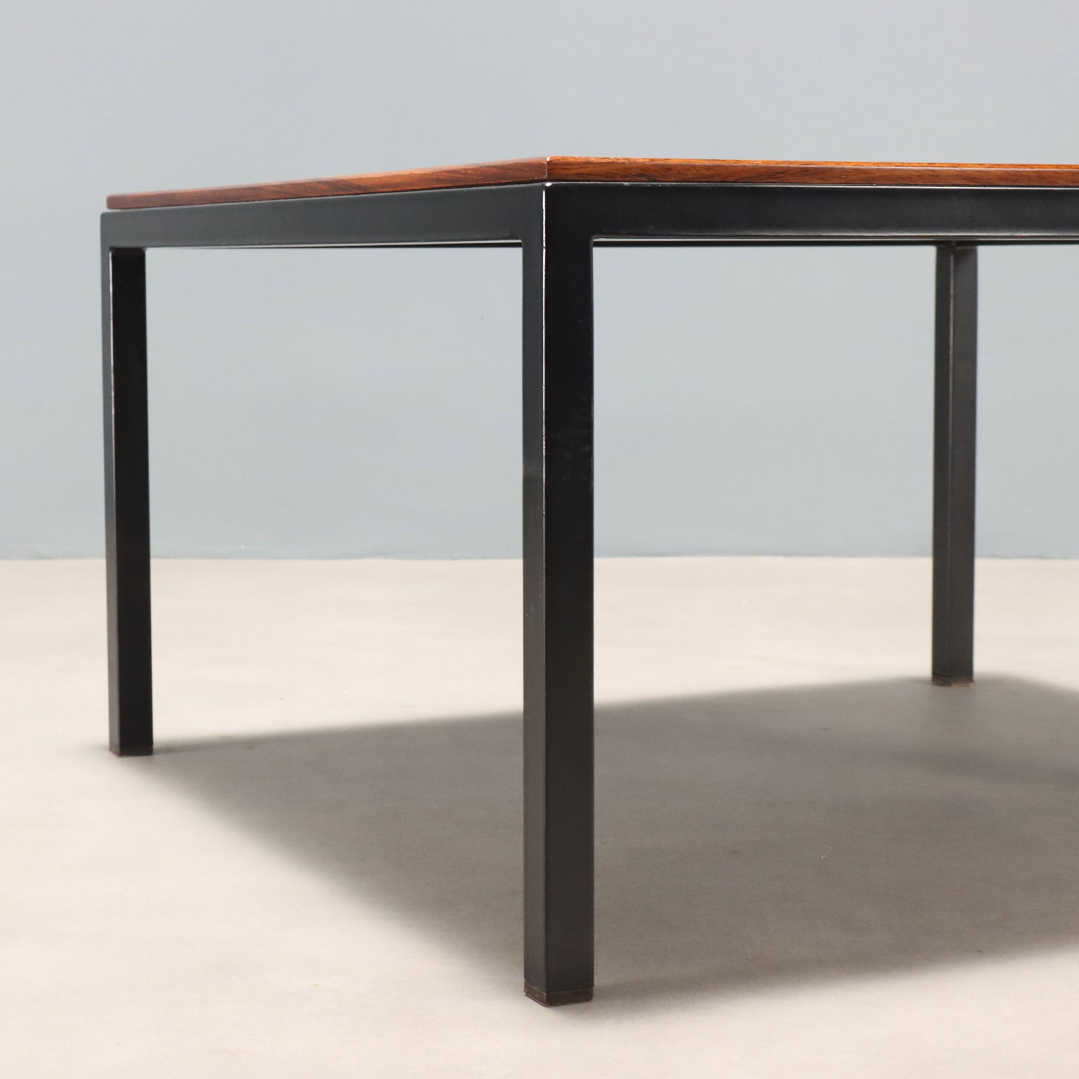 Coffee table with enamelled metal base and square top with exotic wood veneer.