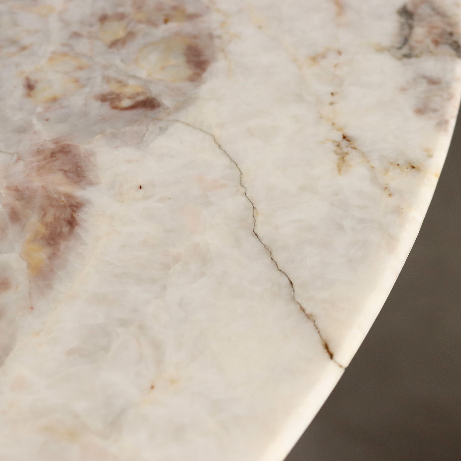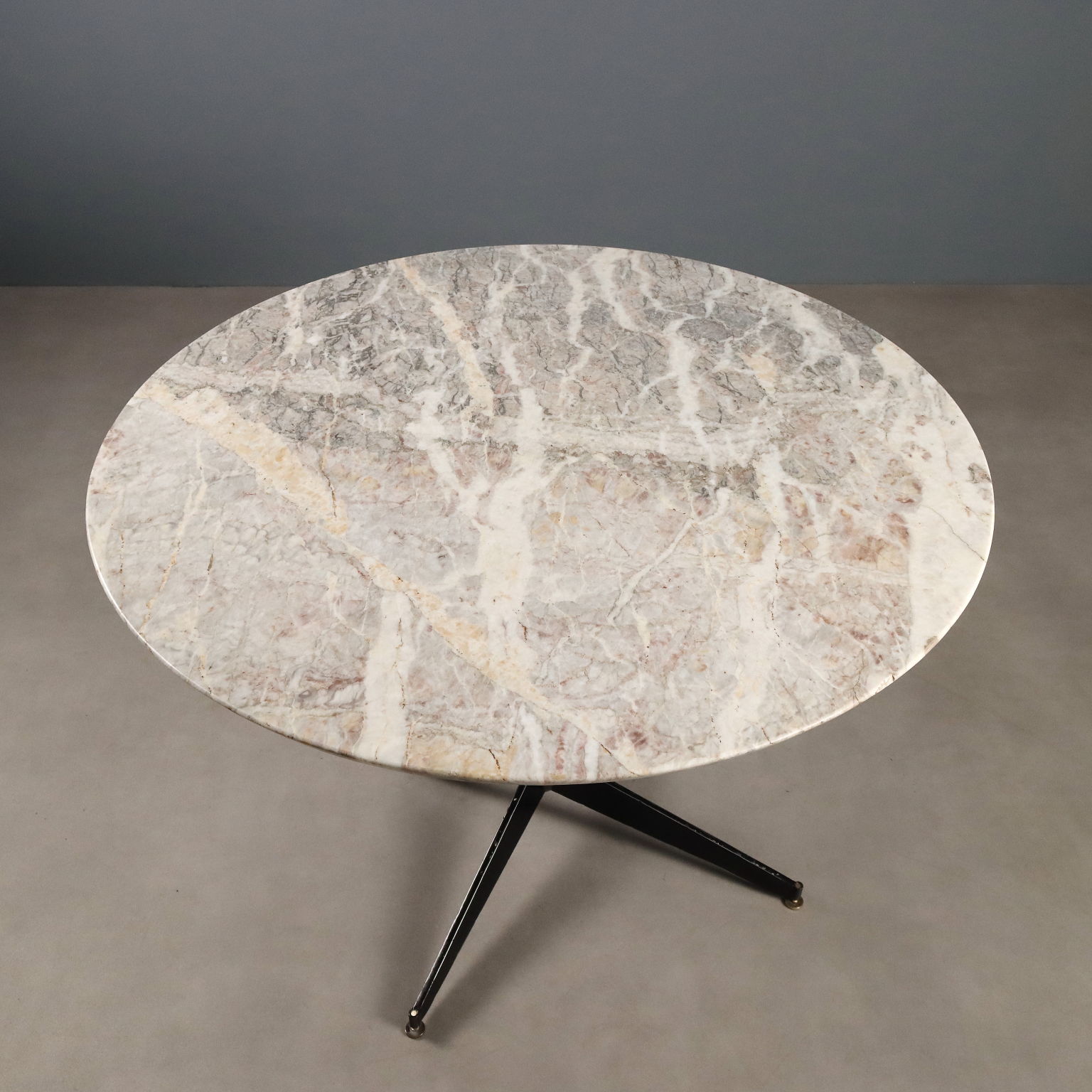 Table with enamelled metal base with adjustable brass feet, marble top.