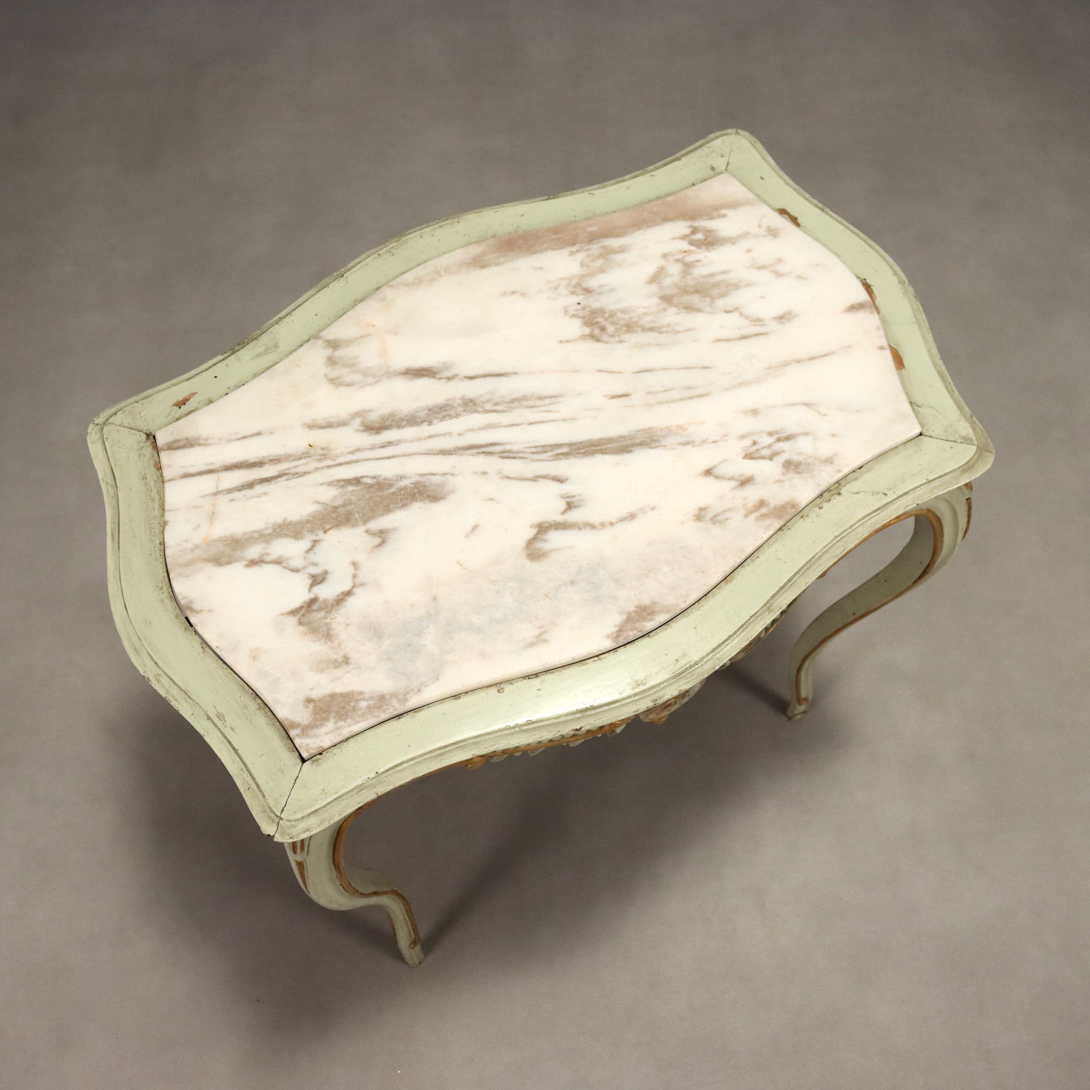 Period coffee table in lacquered wood. Marble top supported by four curved legs, rocaille carvings on the band below the top, gilded details. Italy, early 20th century.