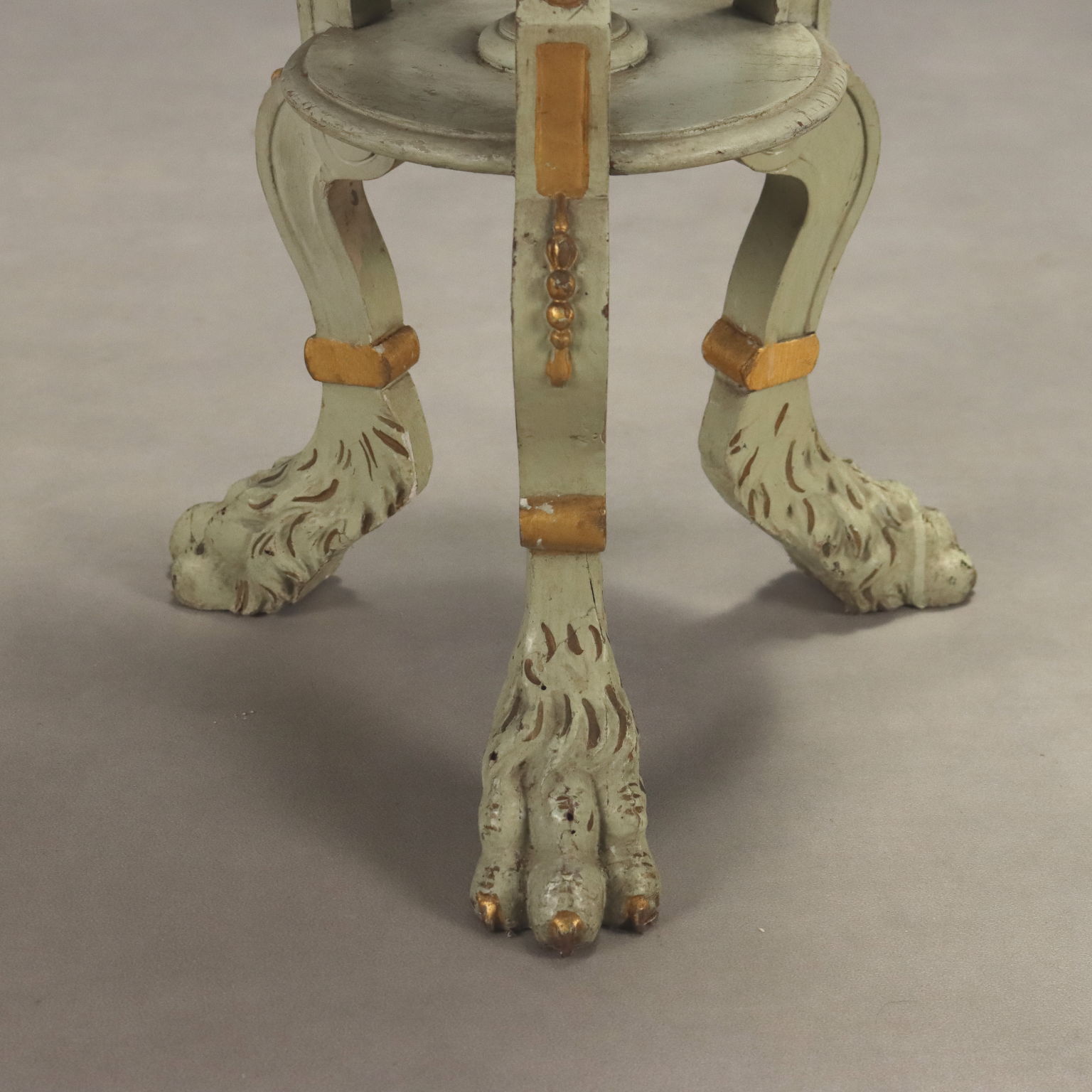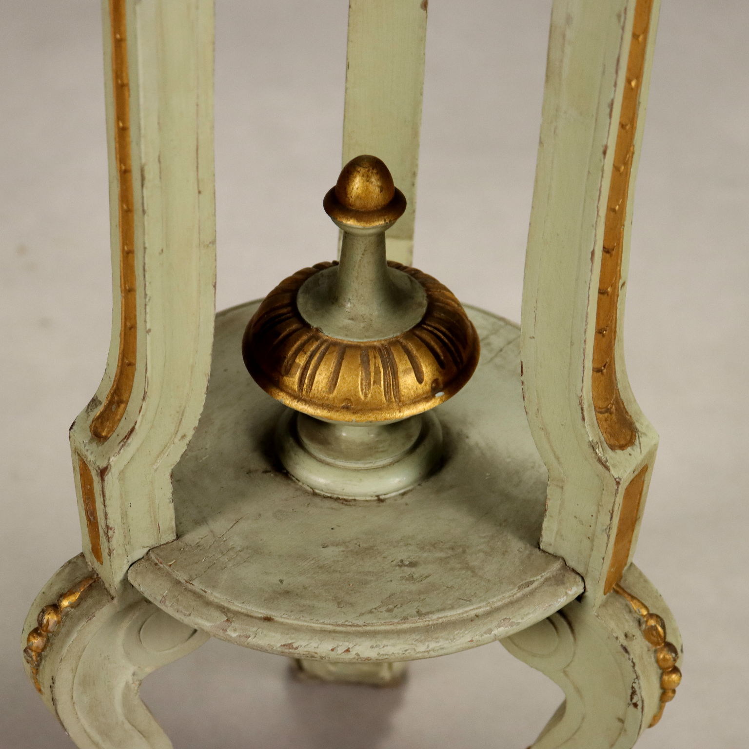 Neoclassical-style lacquered vase stand. Floral carvings, gilded festoons and plume, and feral feet. Italy, late 19th century.