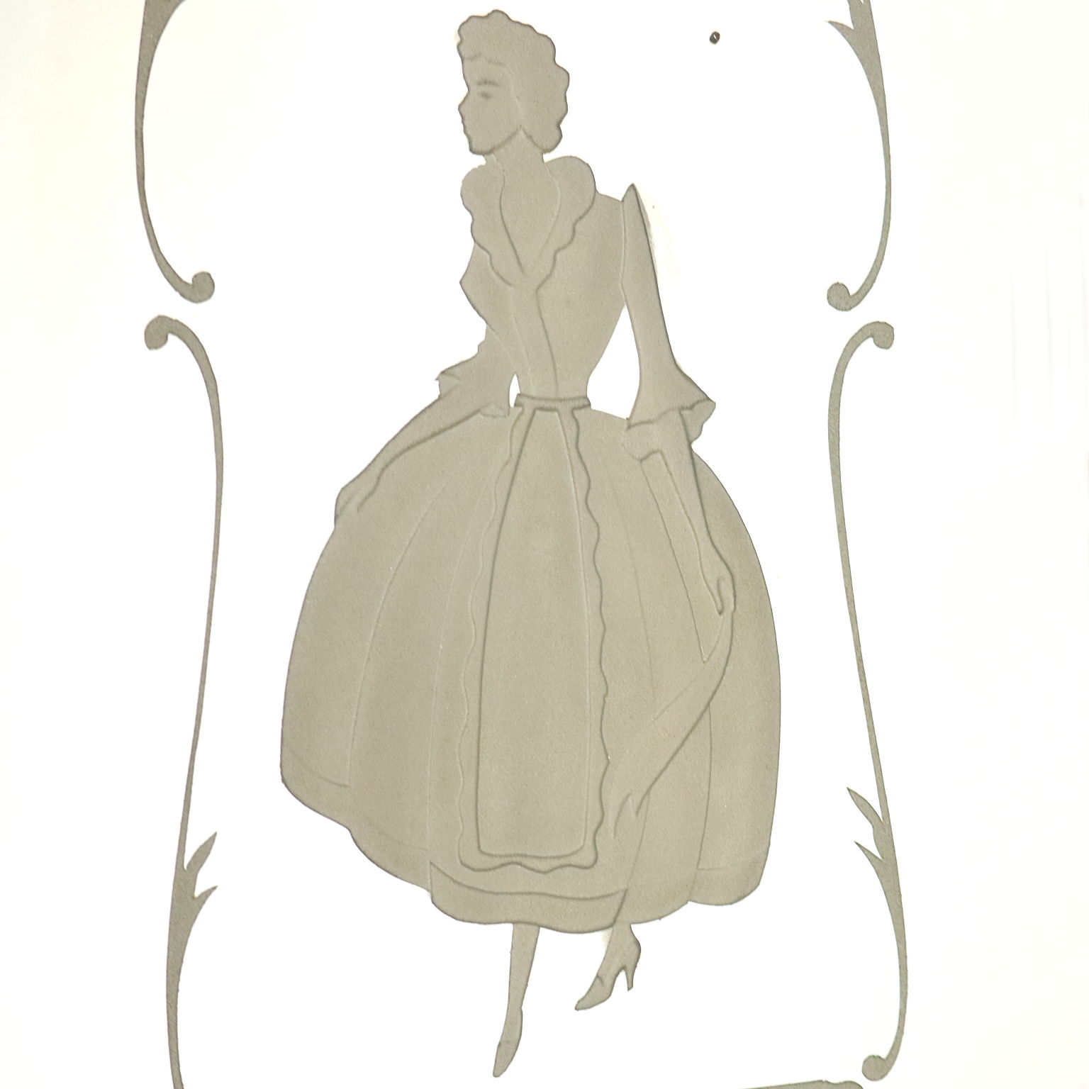A late Baroque-style walnut veneered trumeau. The front features curved sides, a base with three drawers and a drop-down door concealing an internal cabinet with four drawers and a central door. The upper part features a pair of small drawers surmounted by mirrored doors engraved with a lady and knight, and adjustable shelves inside. Fir interior. Veneto, early 20th century.