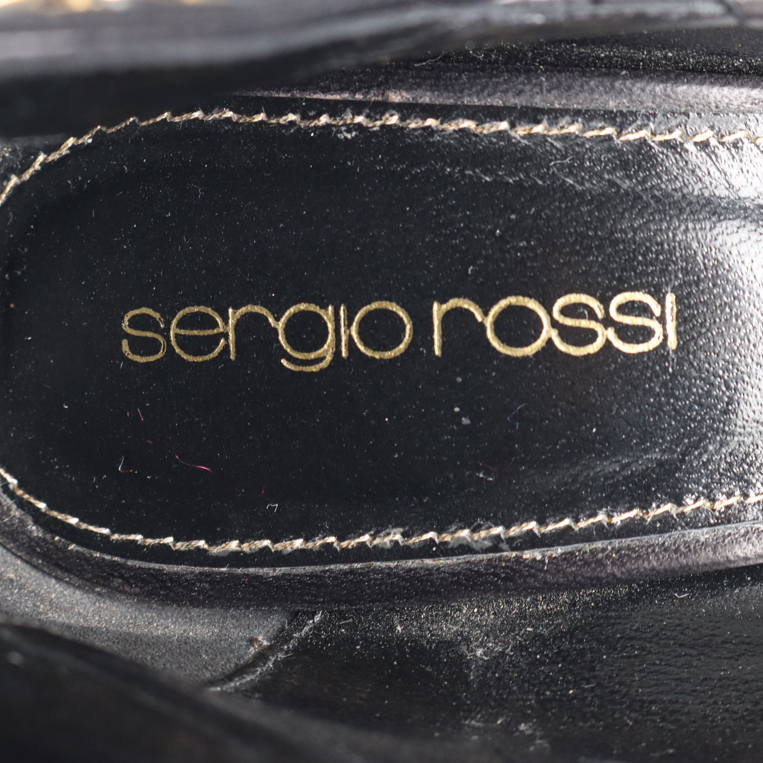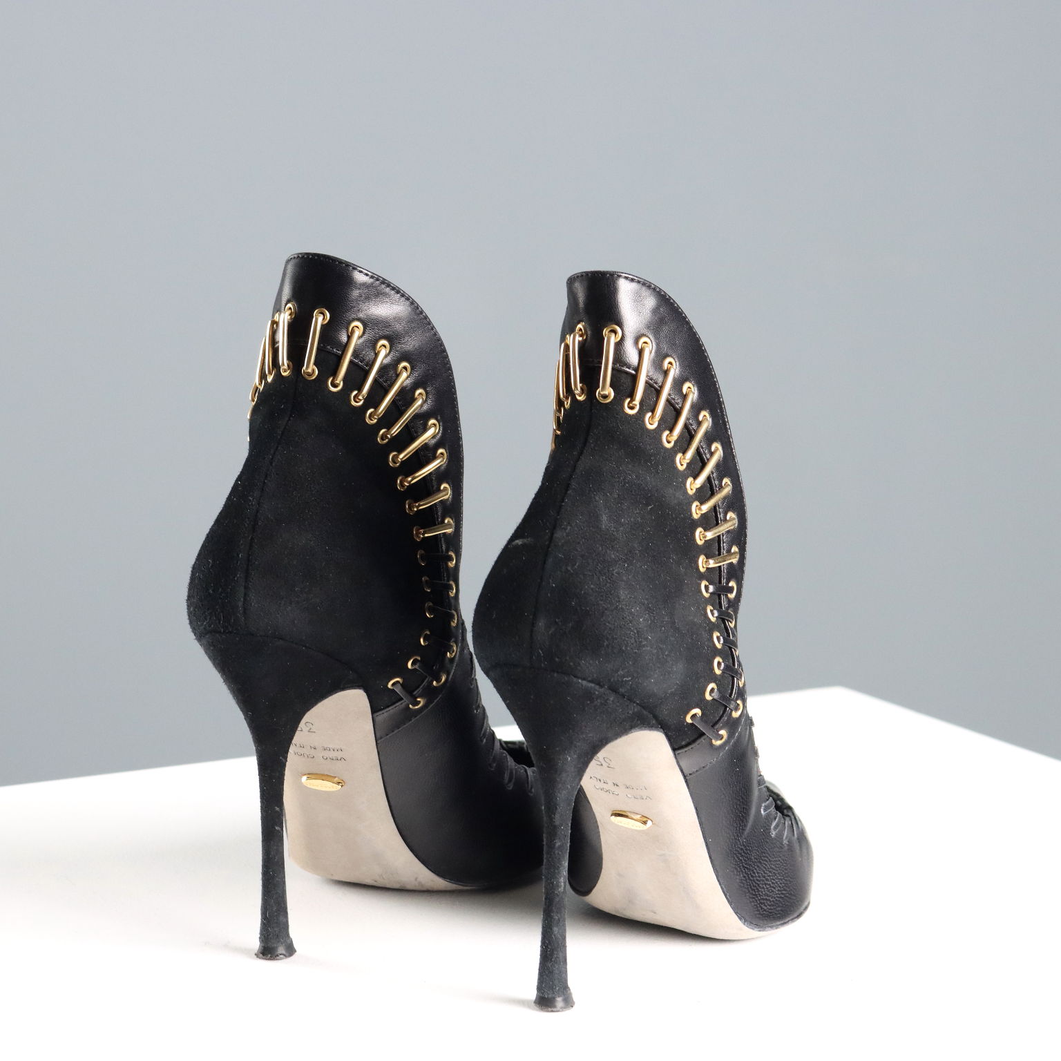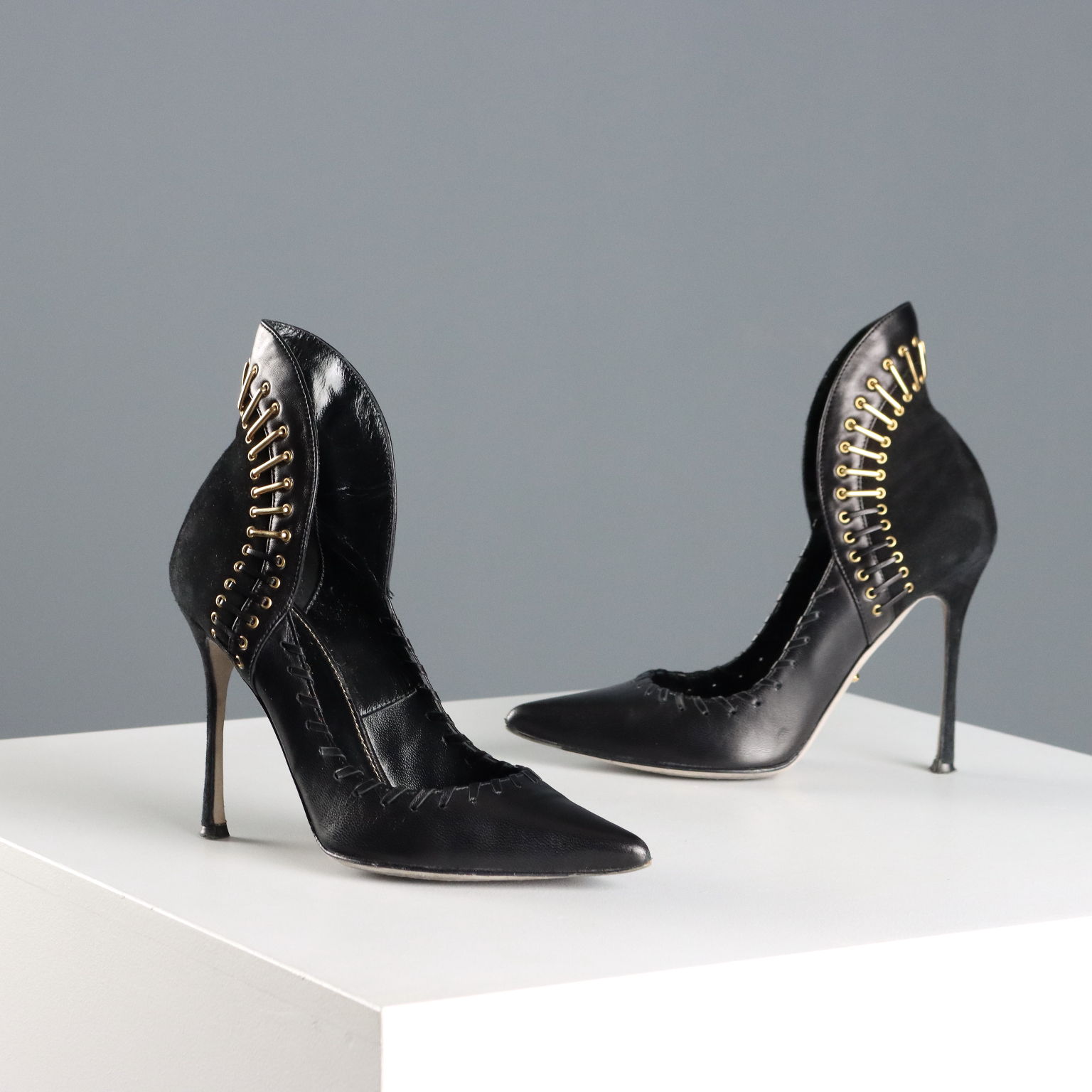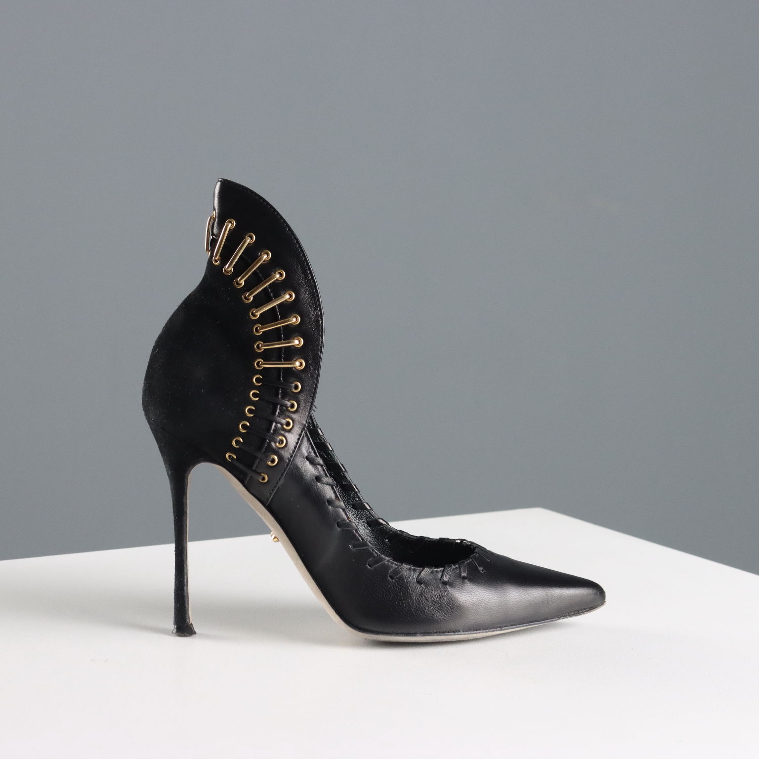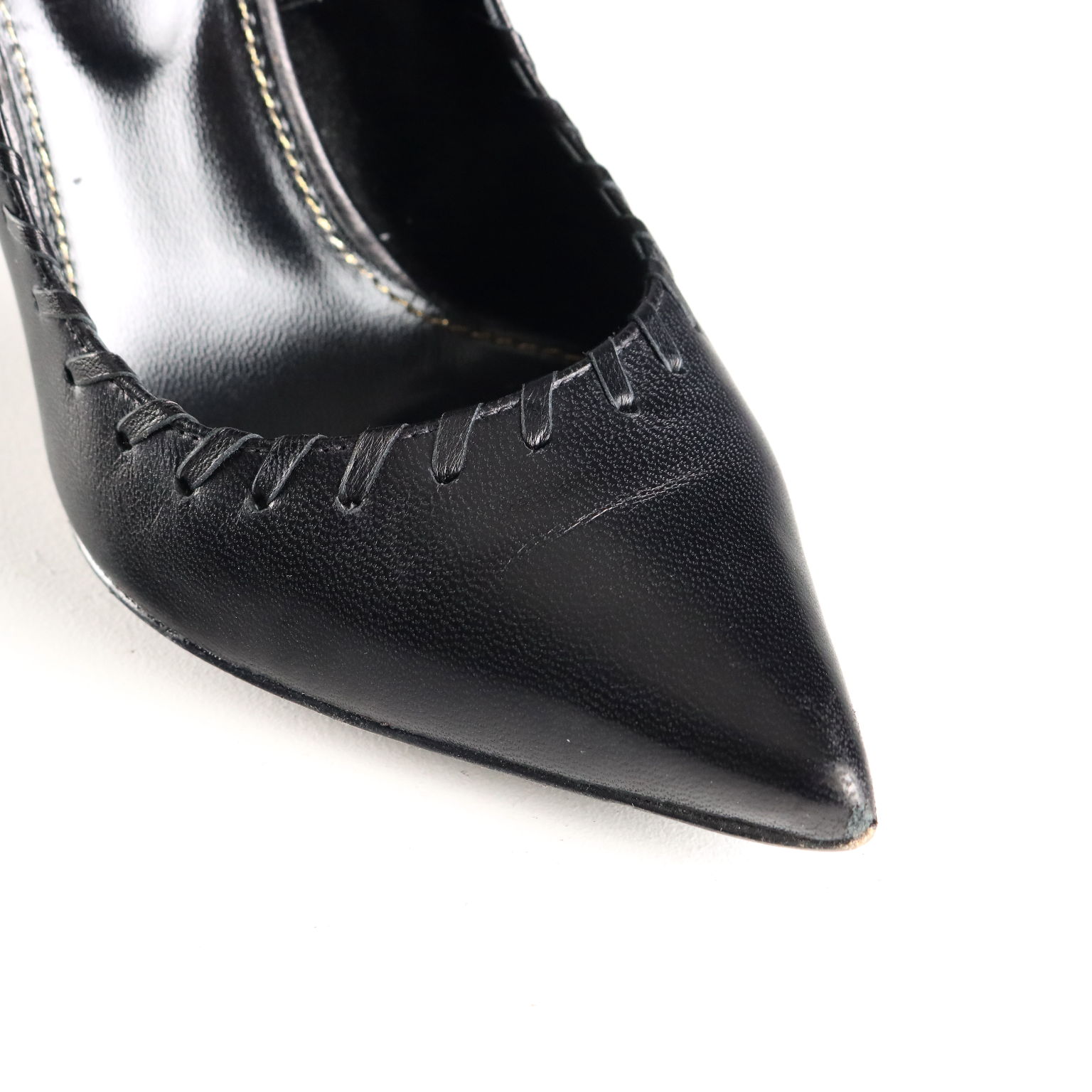 Black leather pumps with suede heel and back. The gold-tone metal detail is distinctive. Heel height: 9.5 cm. Comes with a box, dust bag, and spare rubber heel tips.