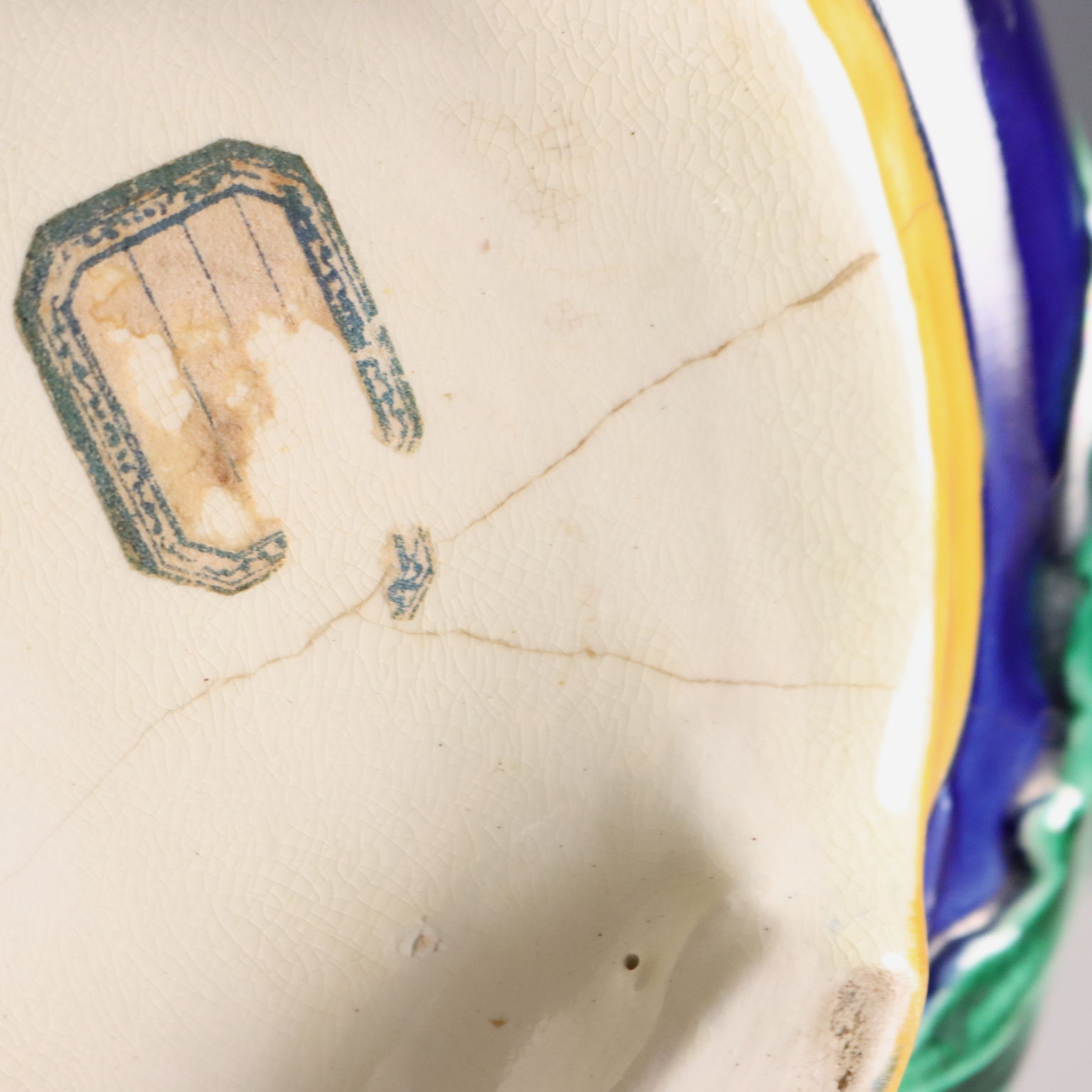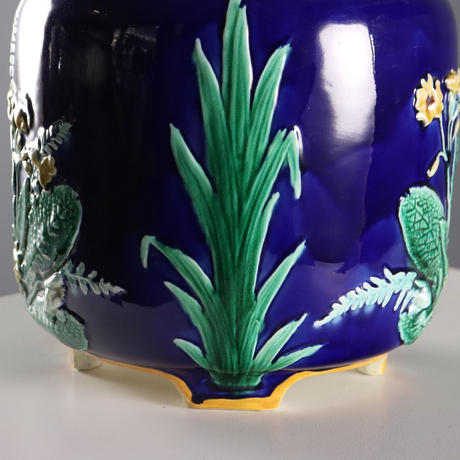 Cobalt blue majolica cachepot with a polychrome relief decoration depicting primroses and alternating herbaceous plants. Sunflower yellow rim. The base features a printed manufacturer's mark and an underglaze production number.