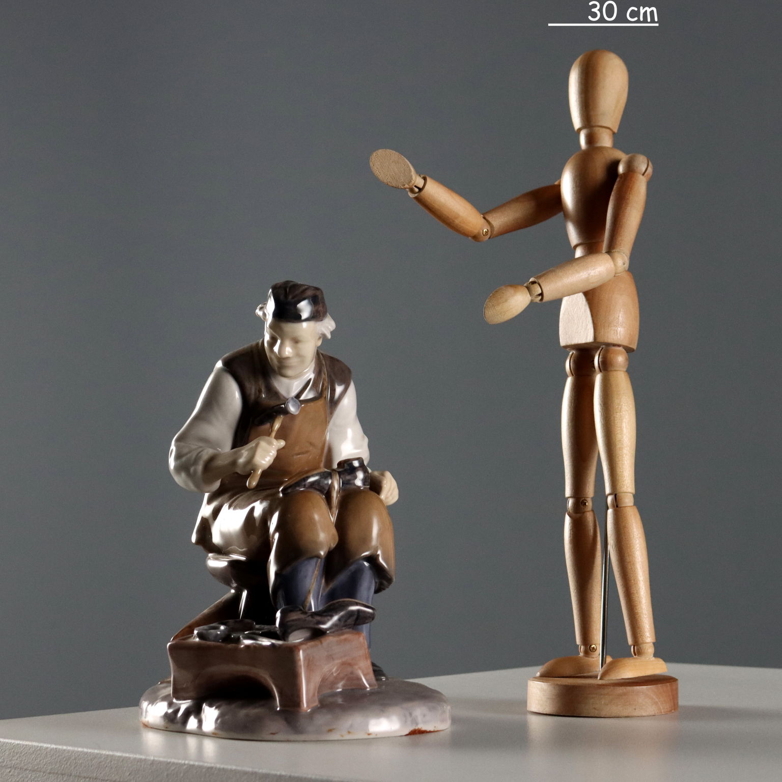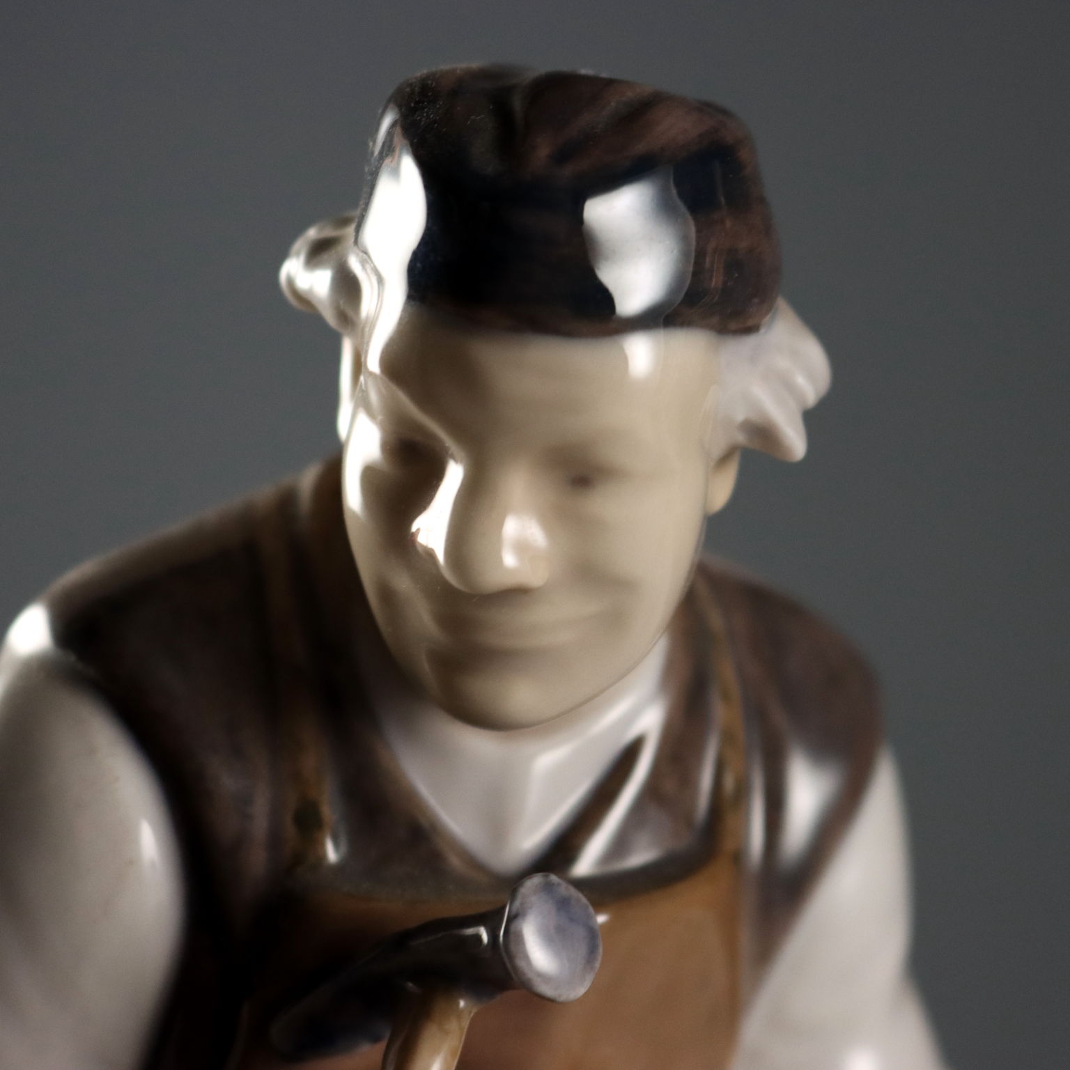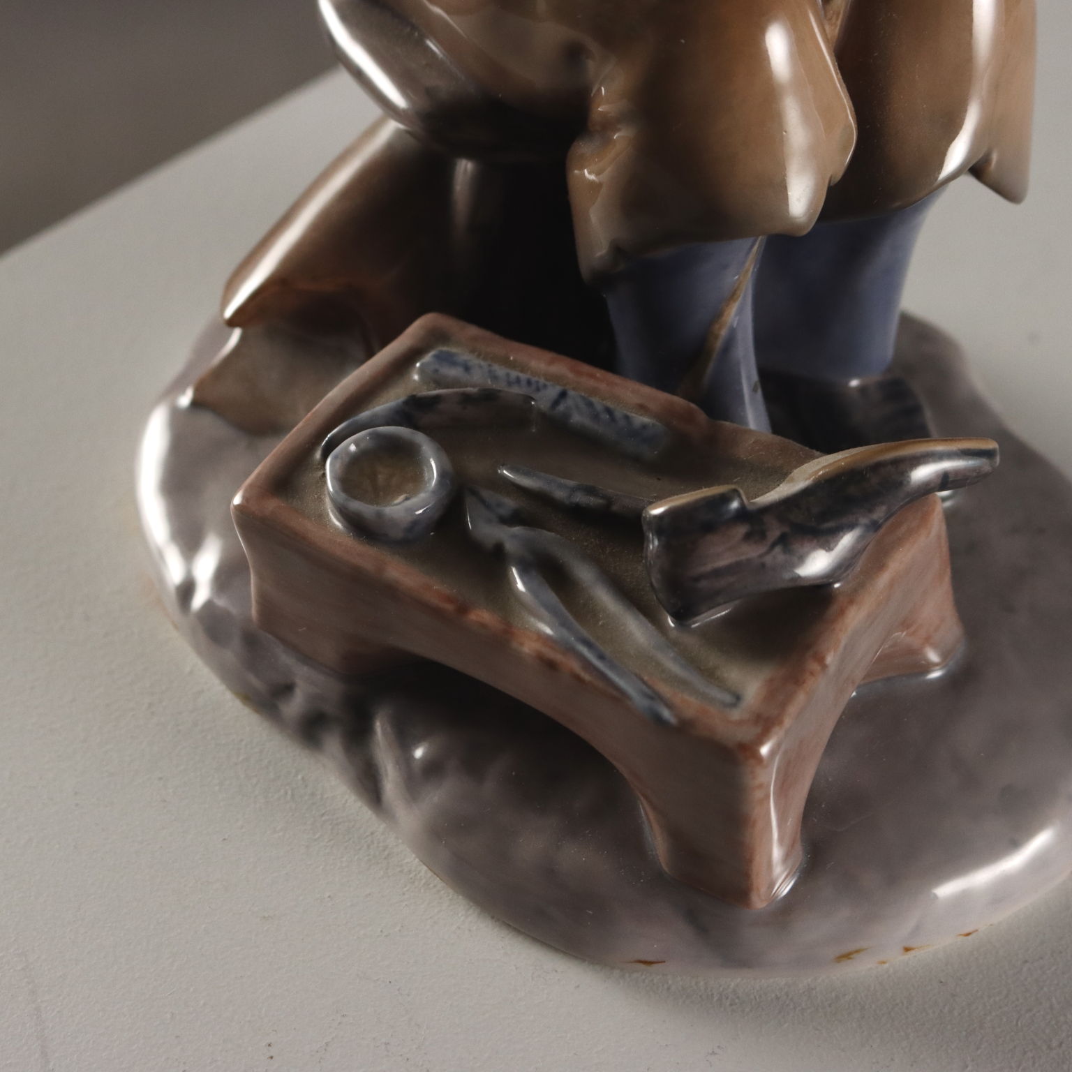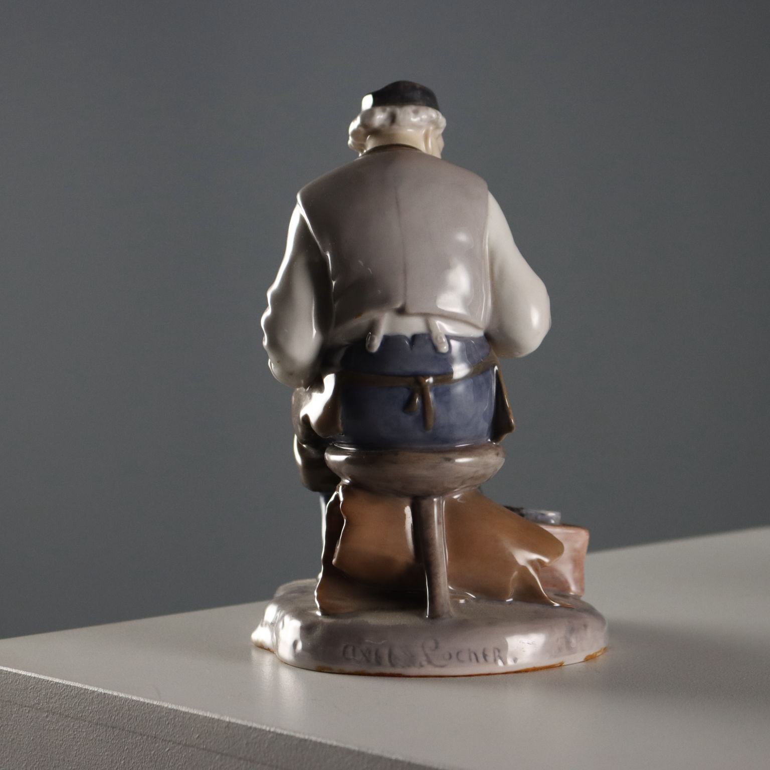 Porcelain sculpture depicting a shoemaker at work. Numbered 2228. Artist's signature engraved on the back. Manufacturer's mark under the base.