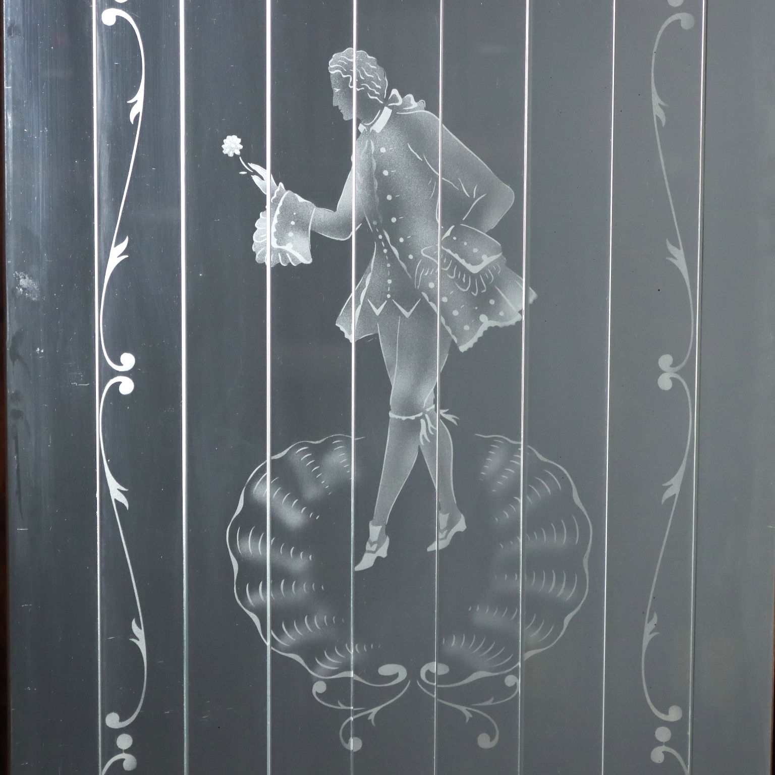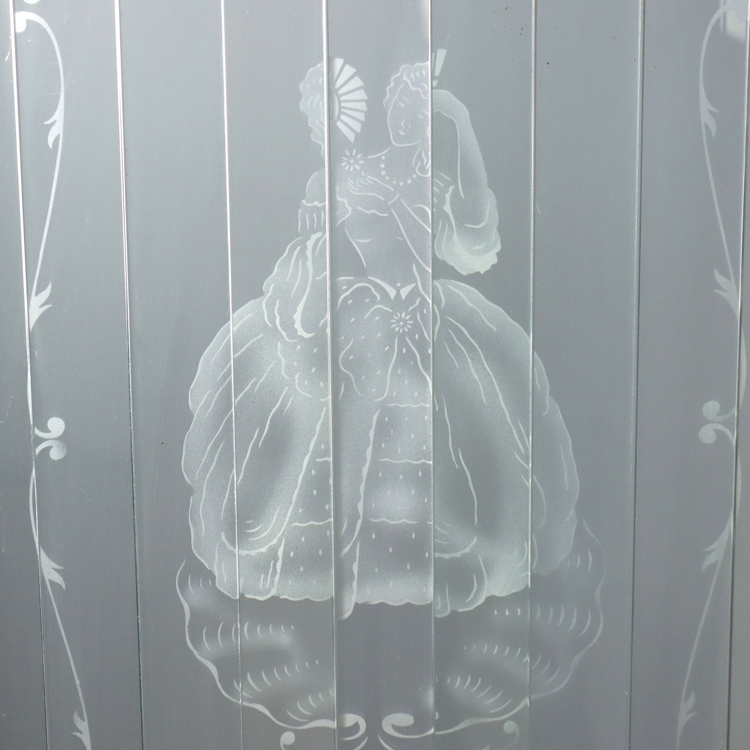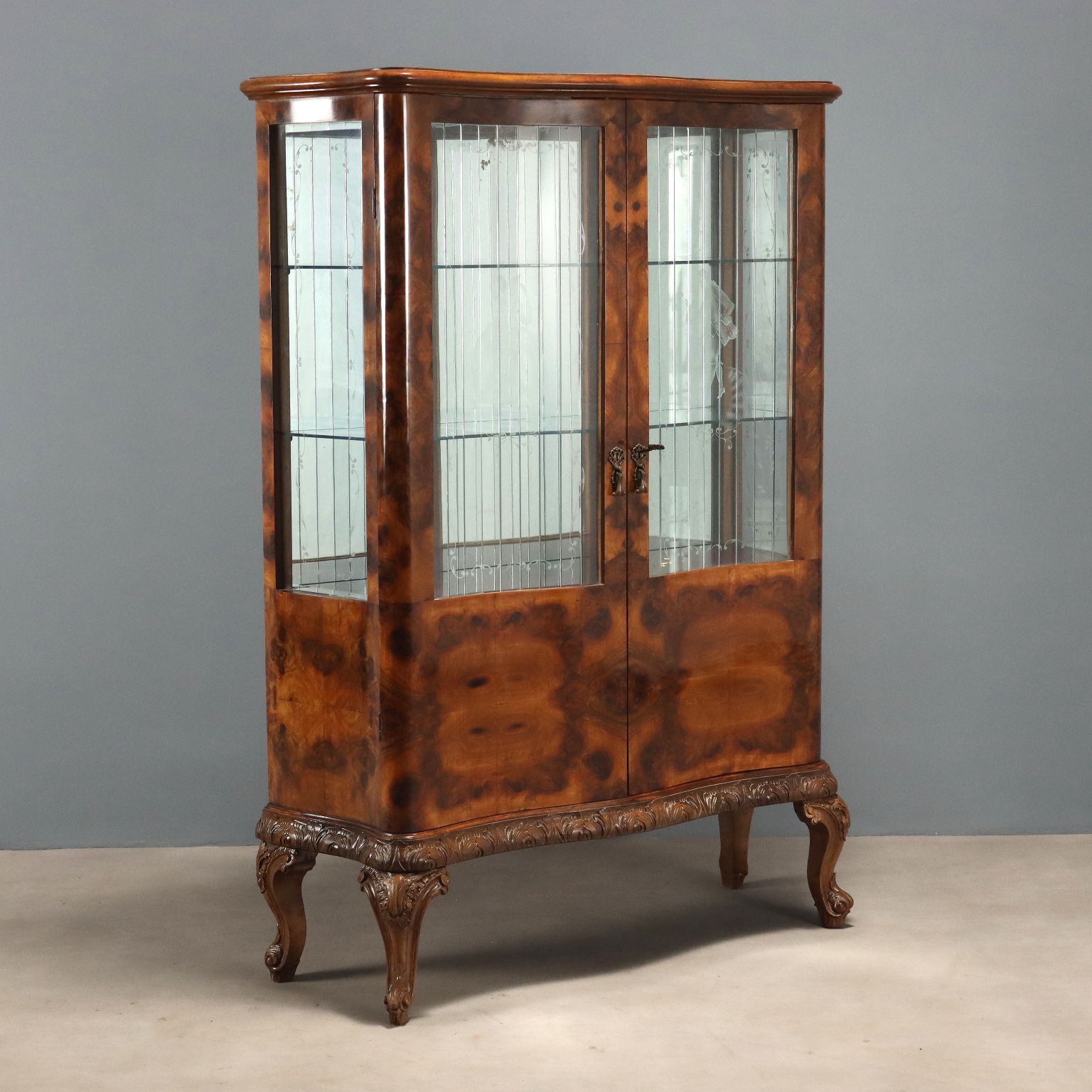 Walnut burl veneered display cabinet. Curved front and sides, doors with slatted glass engraved with a lady and knight. Italy, first half of the 20th century.