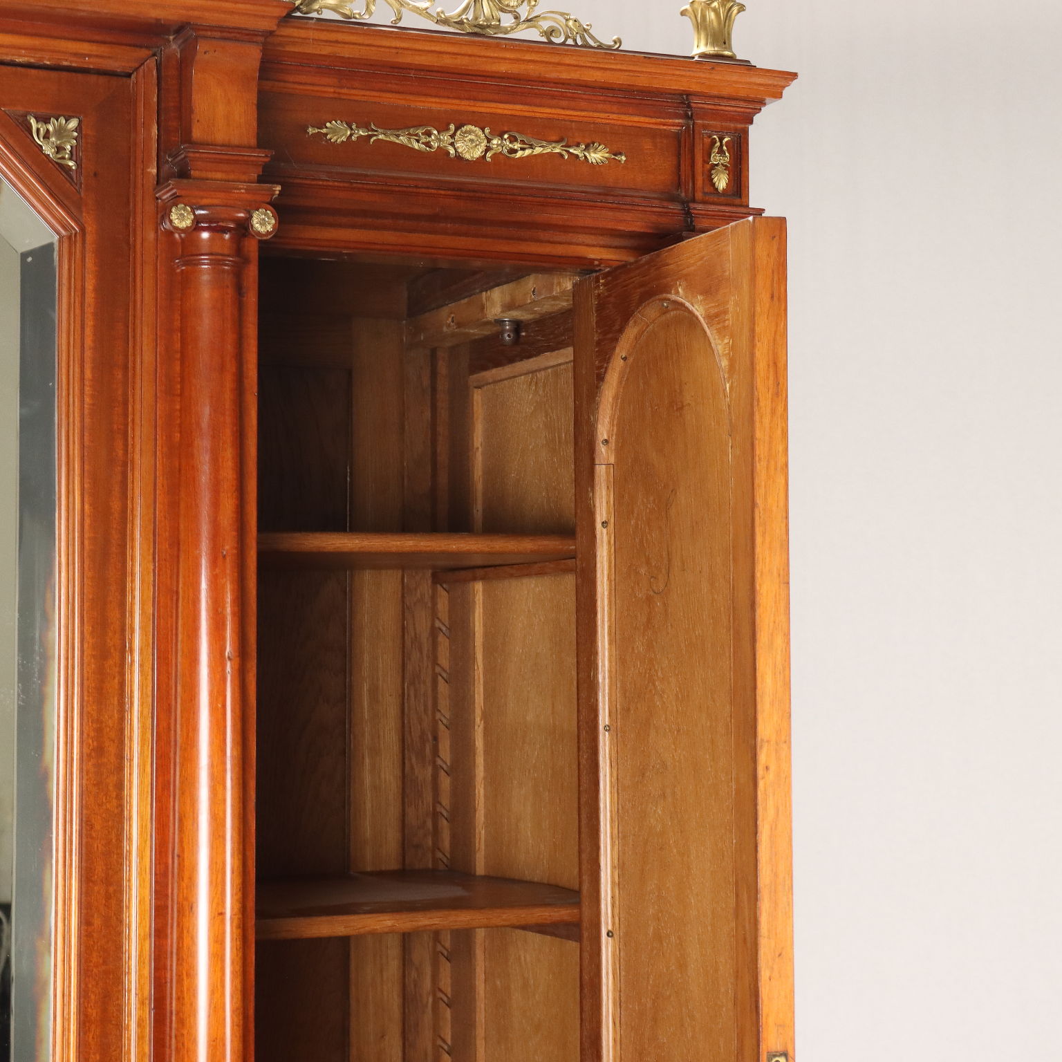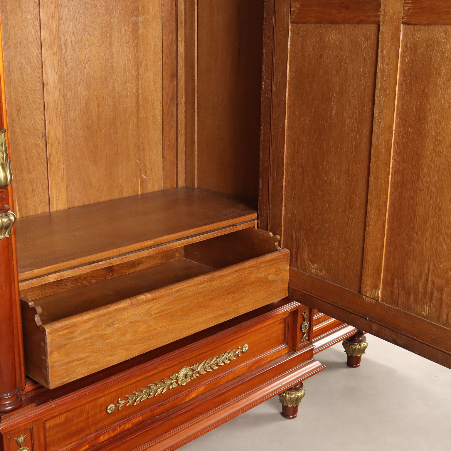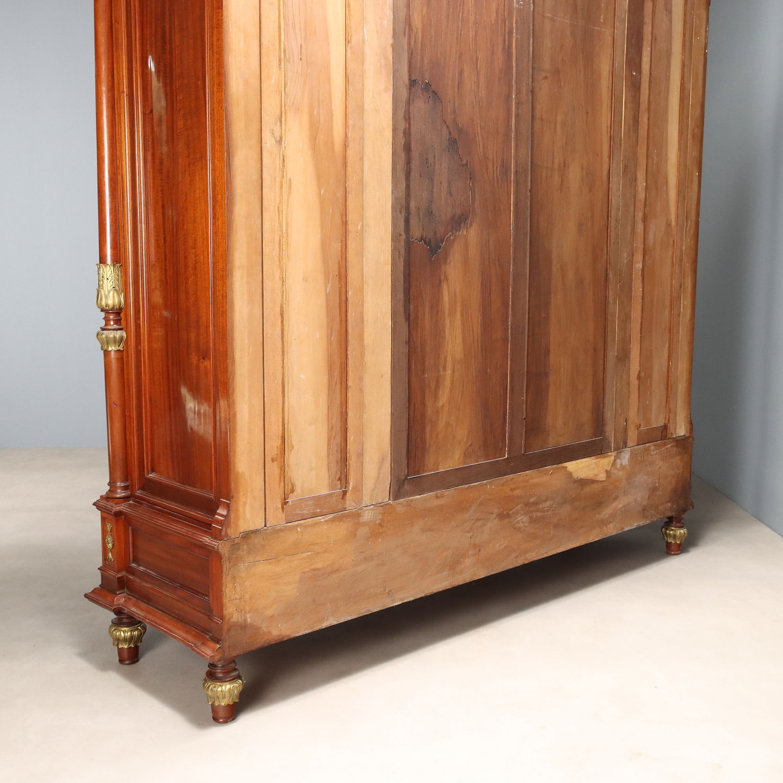 Mahogany wardrobe embellished with chiseled and gilded bronze appliques and a cornice. The central door features a beveled mirror that projects beyond the two paneled side doors. Three drawers in the base, turned column uprights, and tapered legs. Oak interior. France, early 20th century.