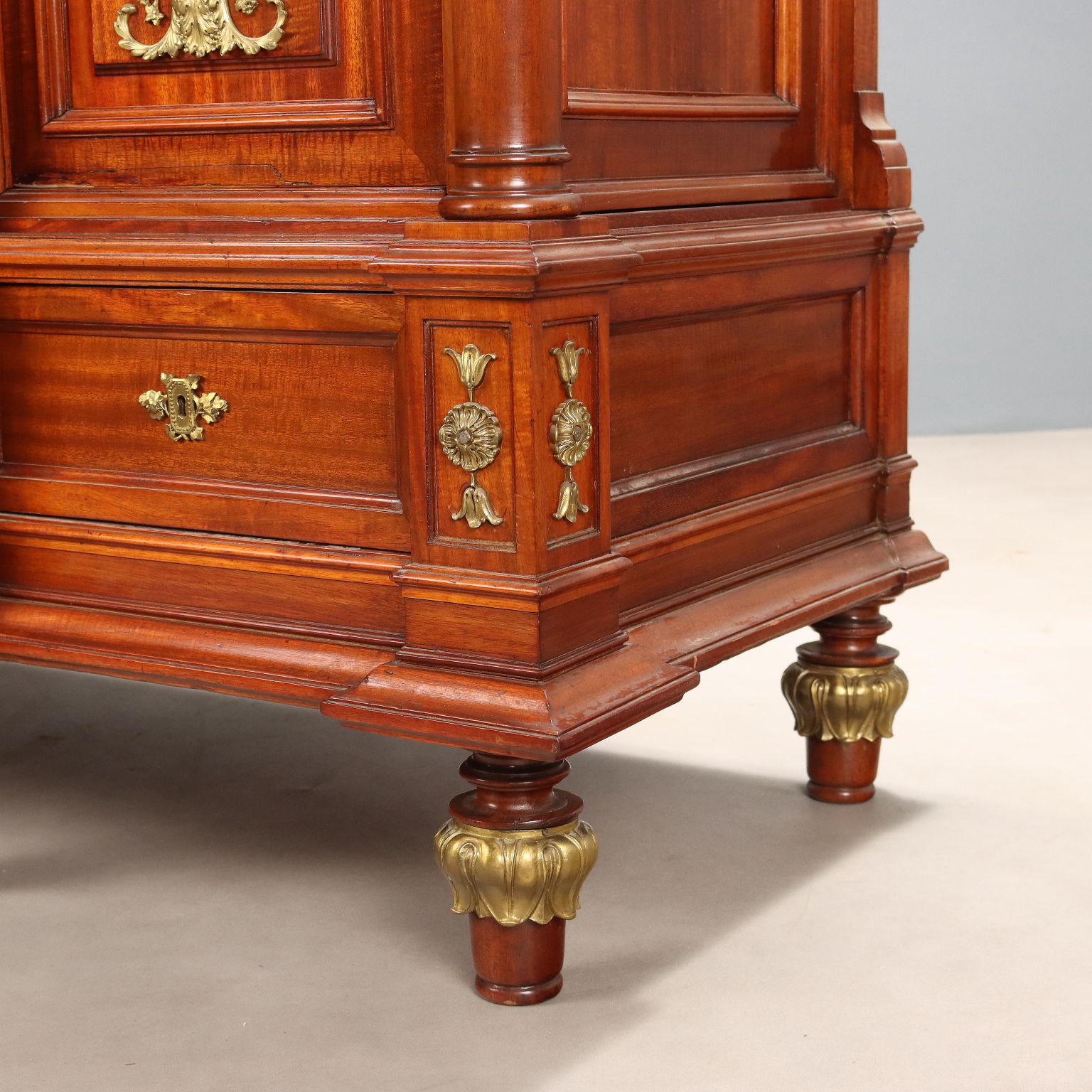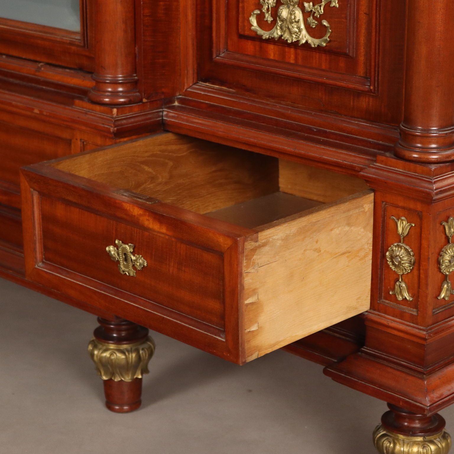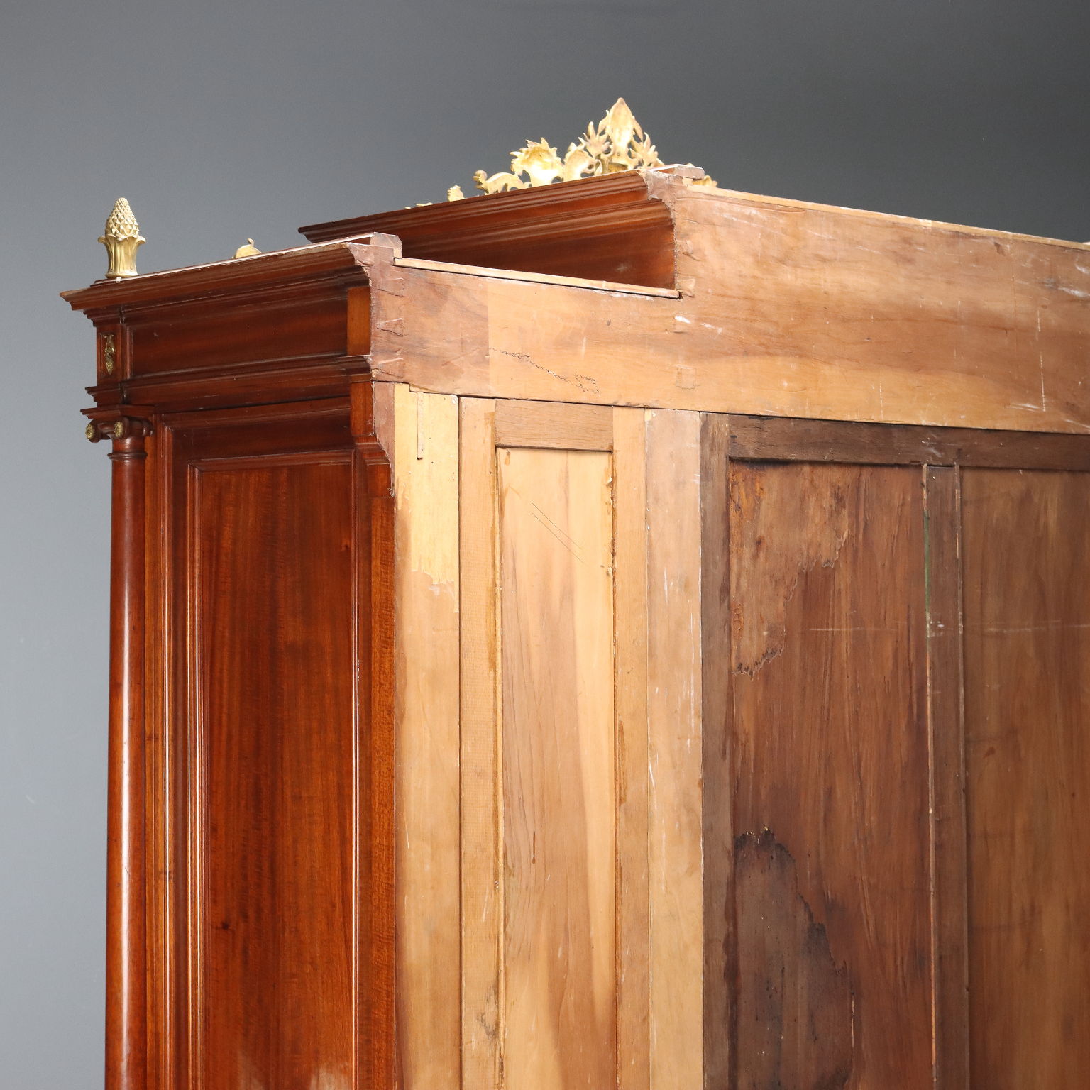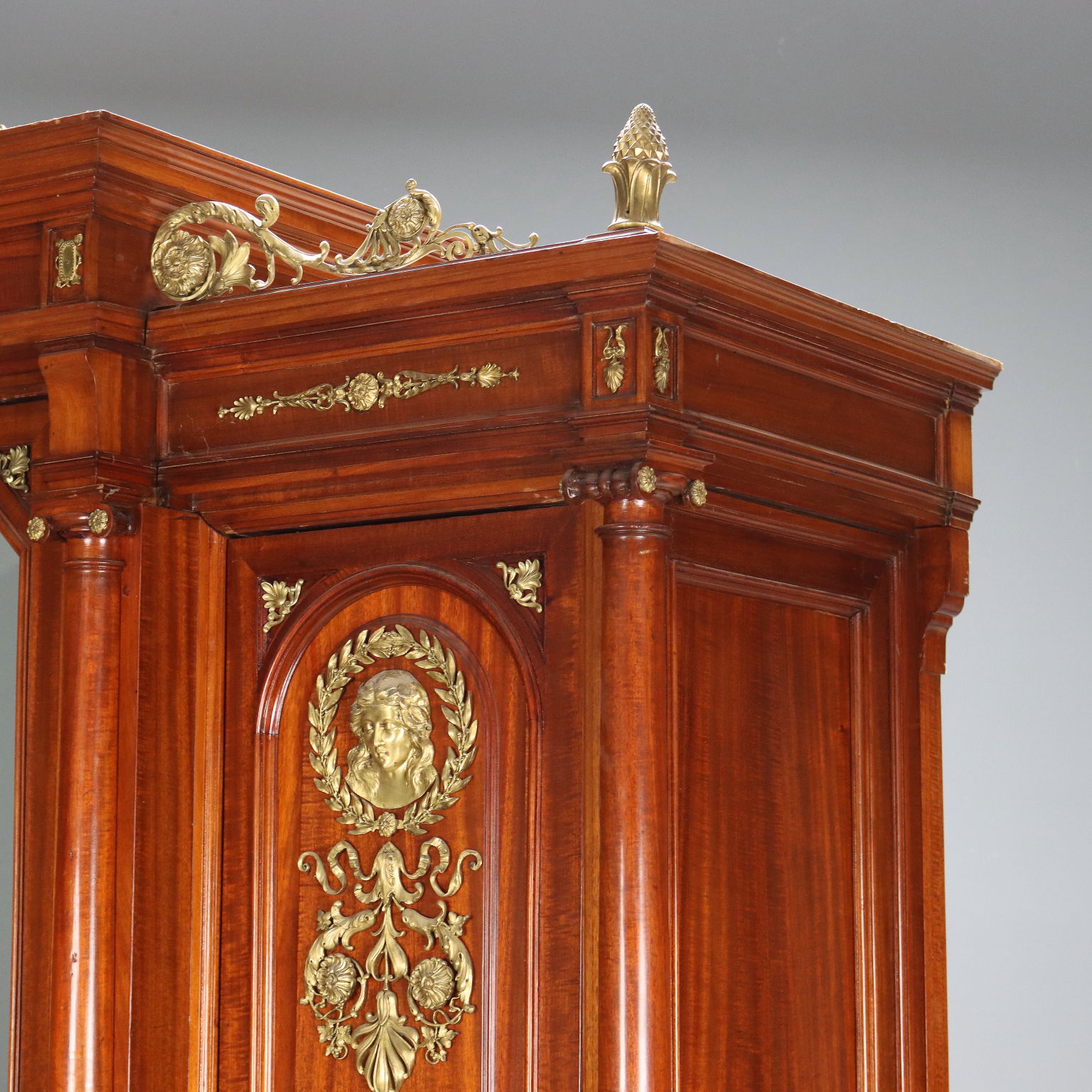 Mahogany wardrobe embellished with chiseled and gilded bronze appliques and a cornice. The central door features a beveled mirror that projects beyond the two paneled side doors. Three drawers in the base, turned column uprights, and tapered legs. Oak interior. France, early 20th century.