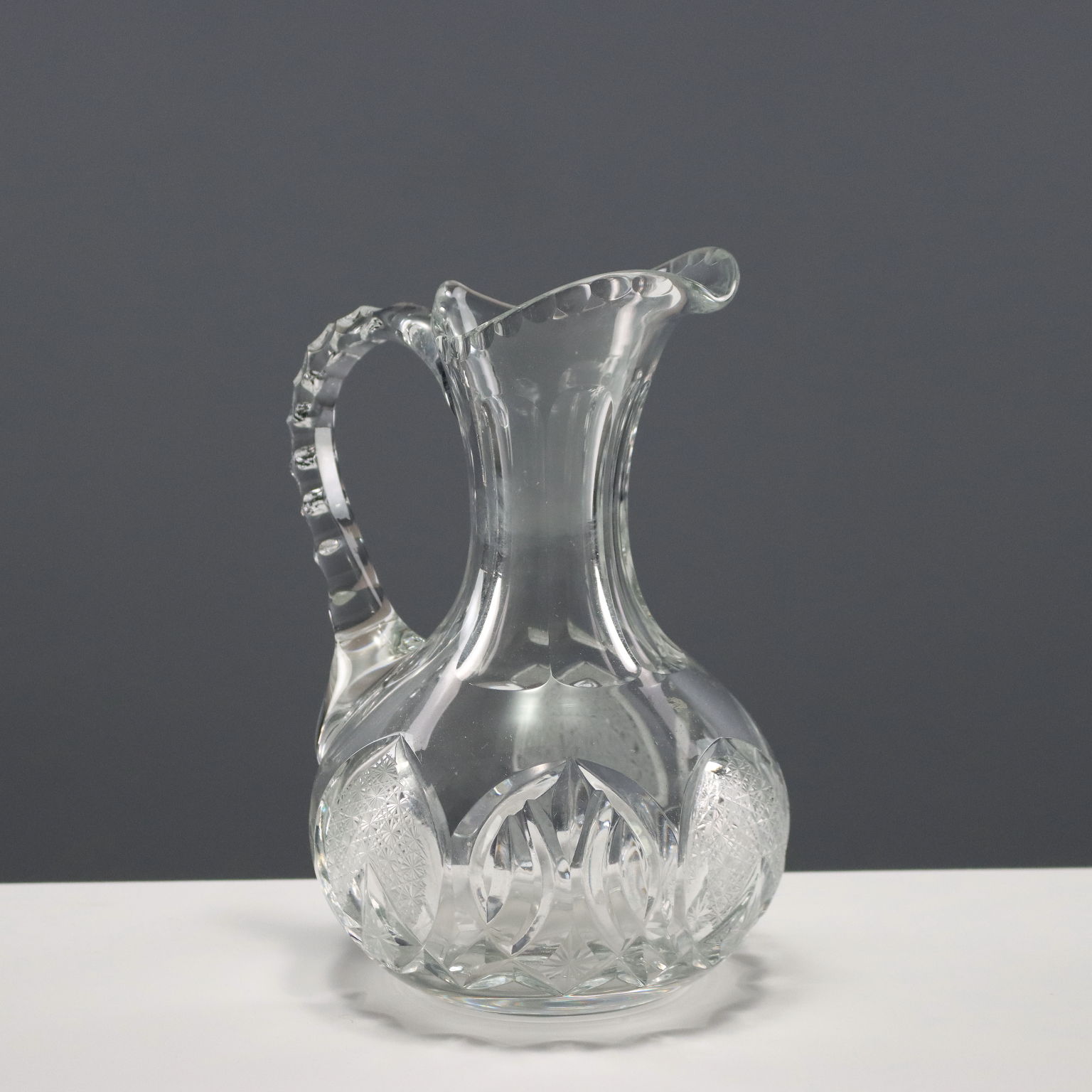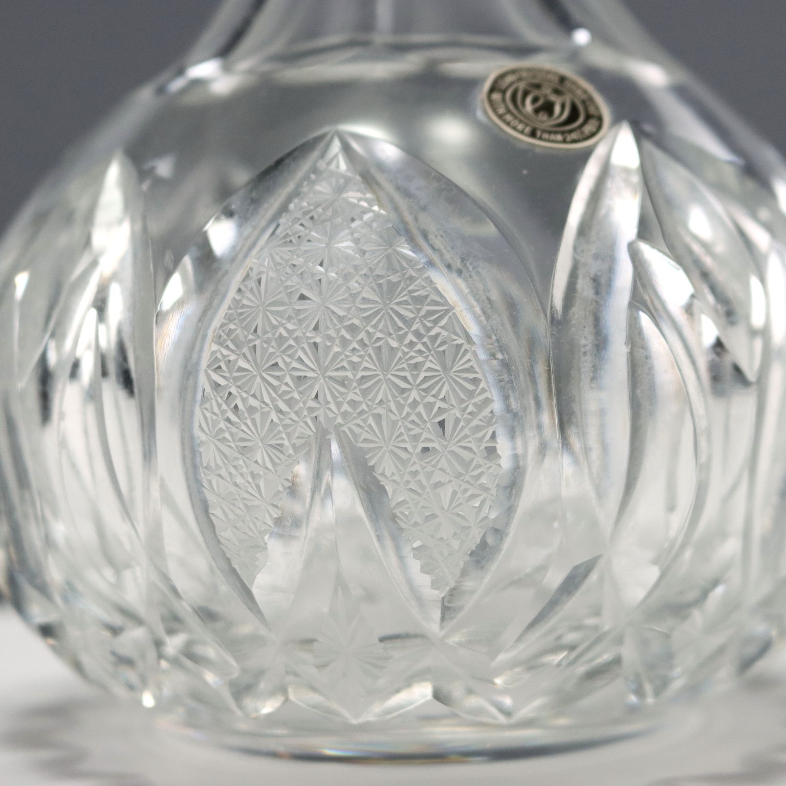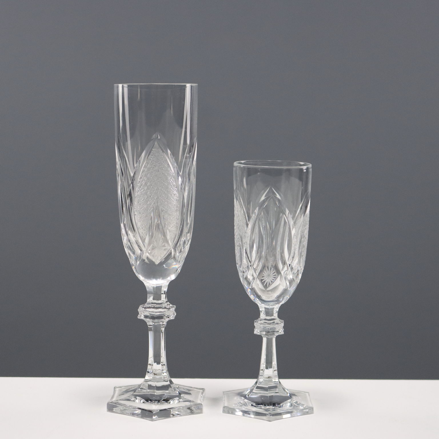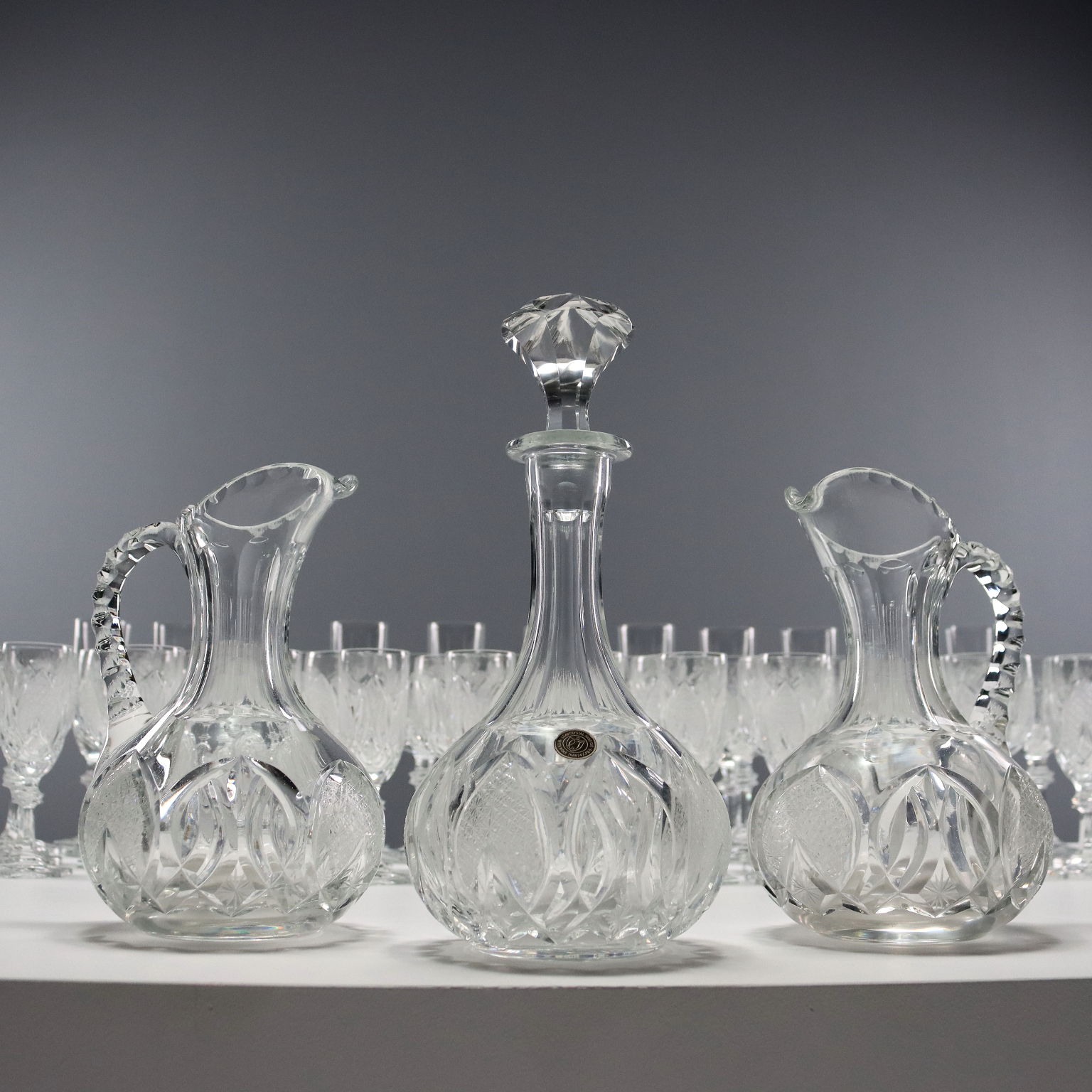 Hand-cut lead crystal glassware set. The set includes 1 bottle, 2 jugs, 13 water glasses, 13 wine glasses, 12 dessert wine glasses, and 11 flutes. 52 pieces in total. The bottle comes with a manufacturer's sticker.