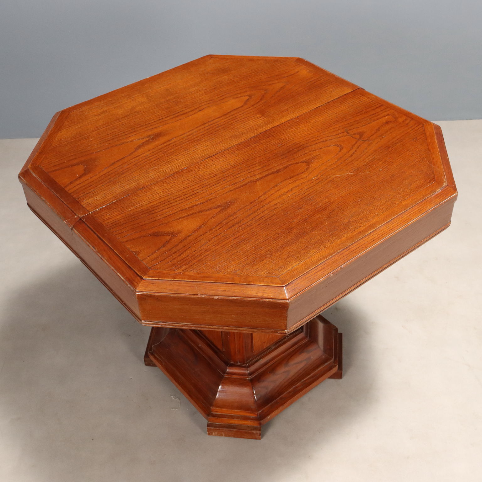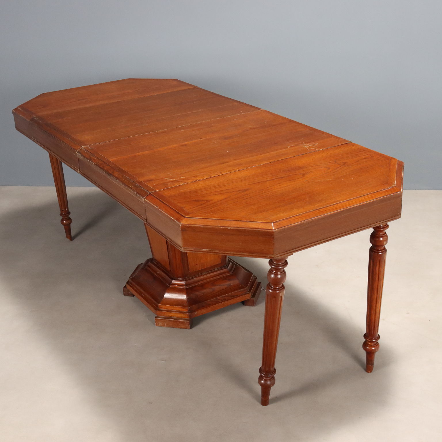 Extendable oak table. Hexagonal top supported by a central inverted truncated pyramid leg, resting on a molded base. Folding legs concealed in the band beneath the tabletop; two extension leaves included. Italy, first half of the 20th century.