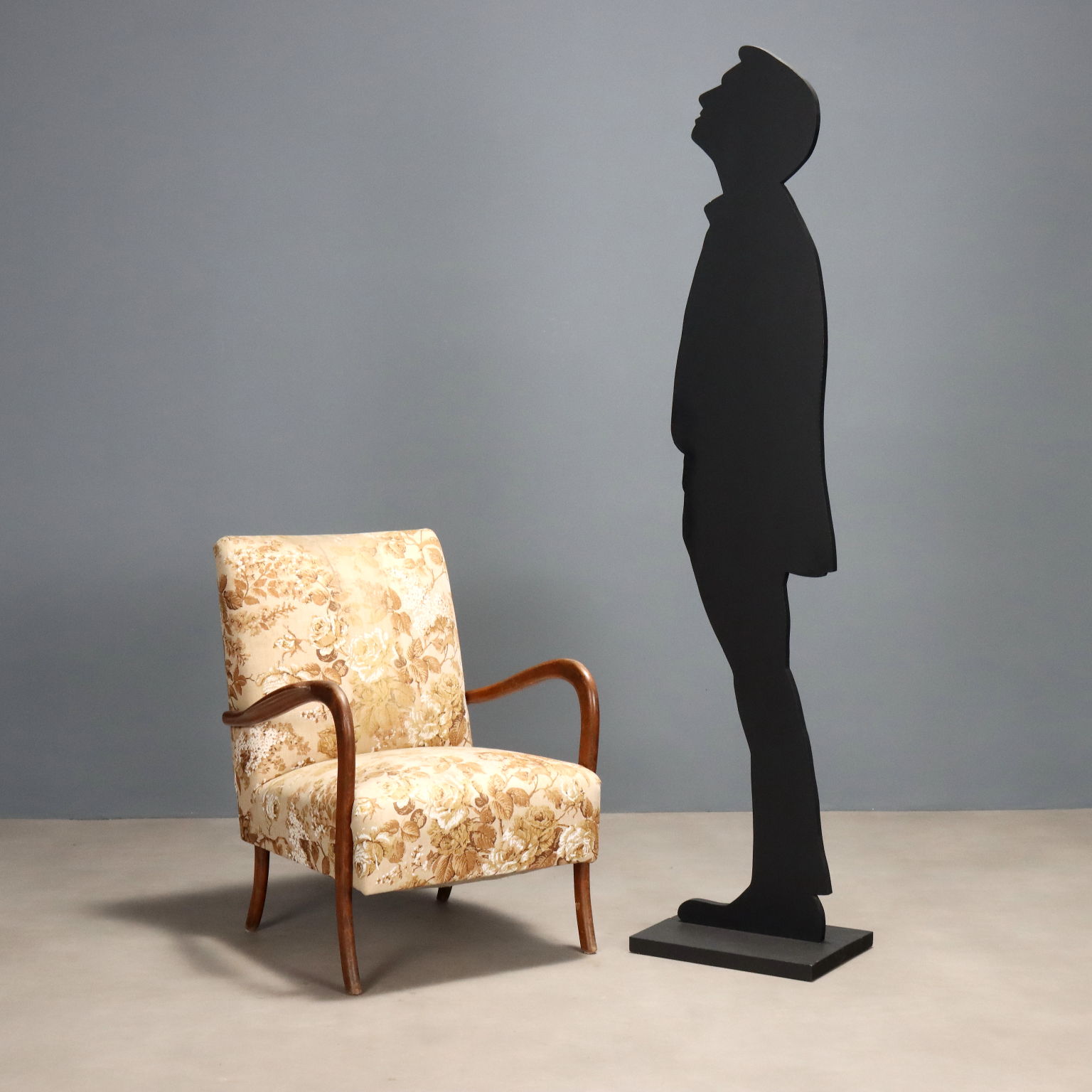 Vintage armchairs with exposed beech wood armrests, spring and foam padding, and fabric upholstery. This seat lends itself to upholstery renewal, choosing from the many options available in our workshops.