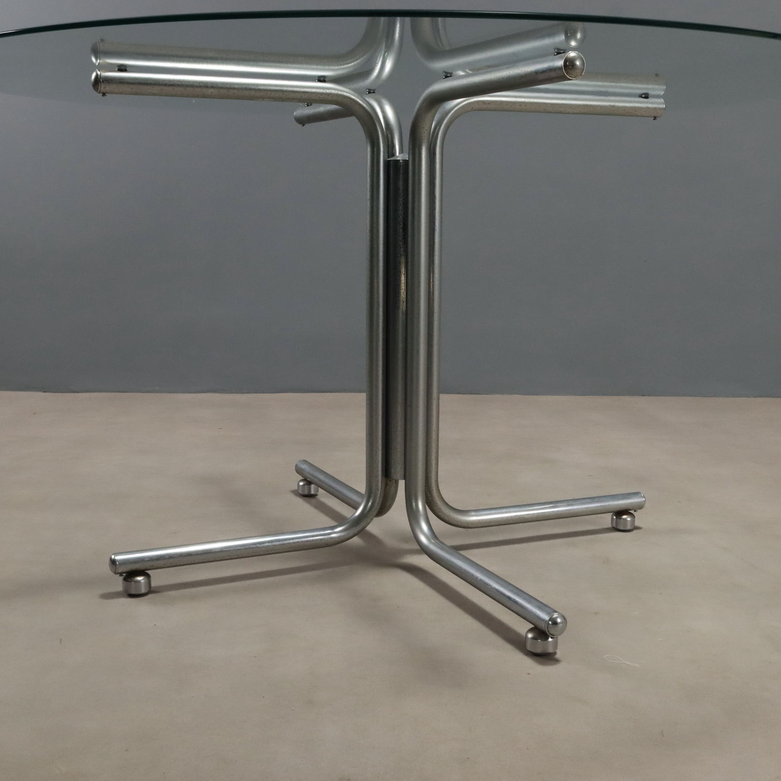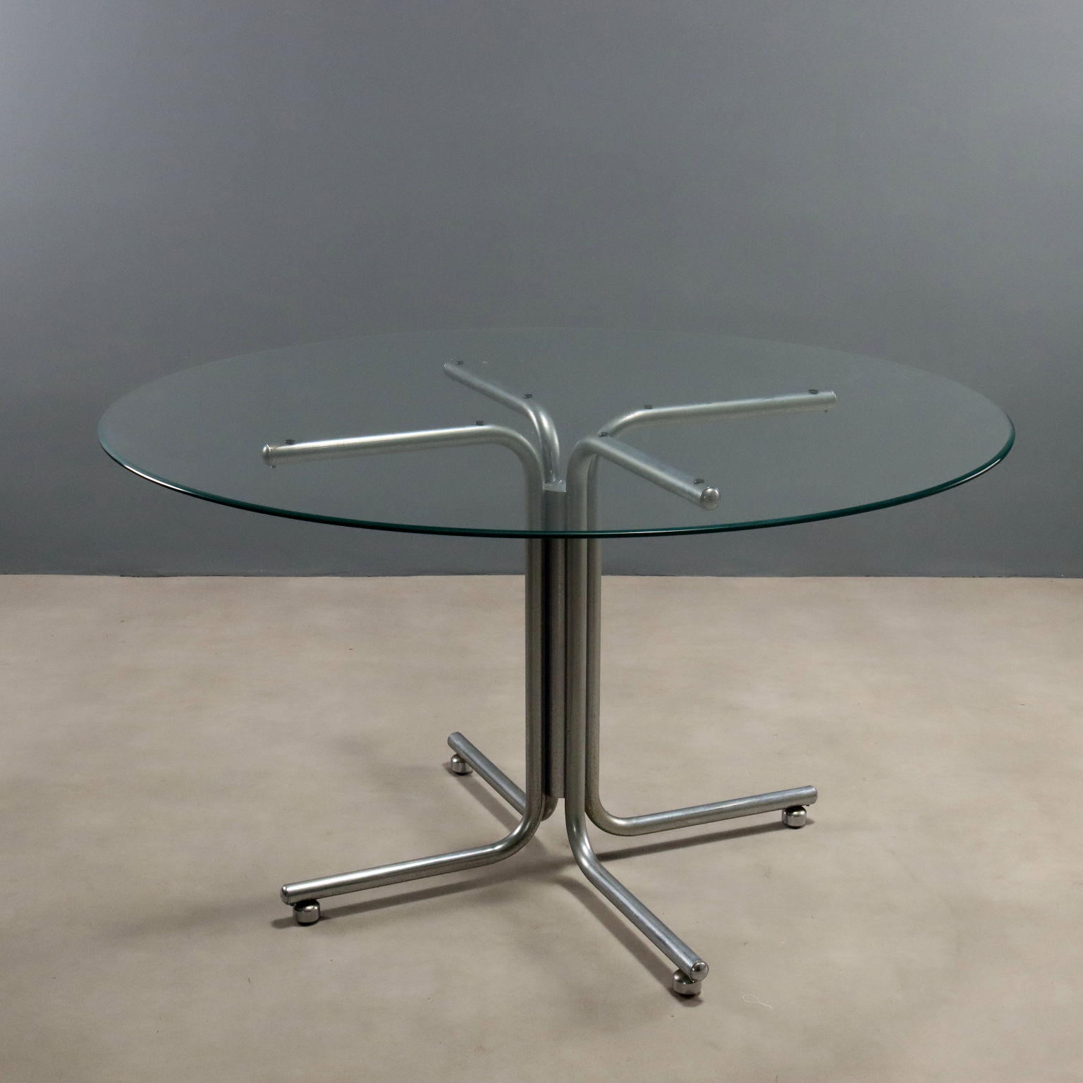Vintage dining table with chromed metal frame and round glass top.