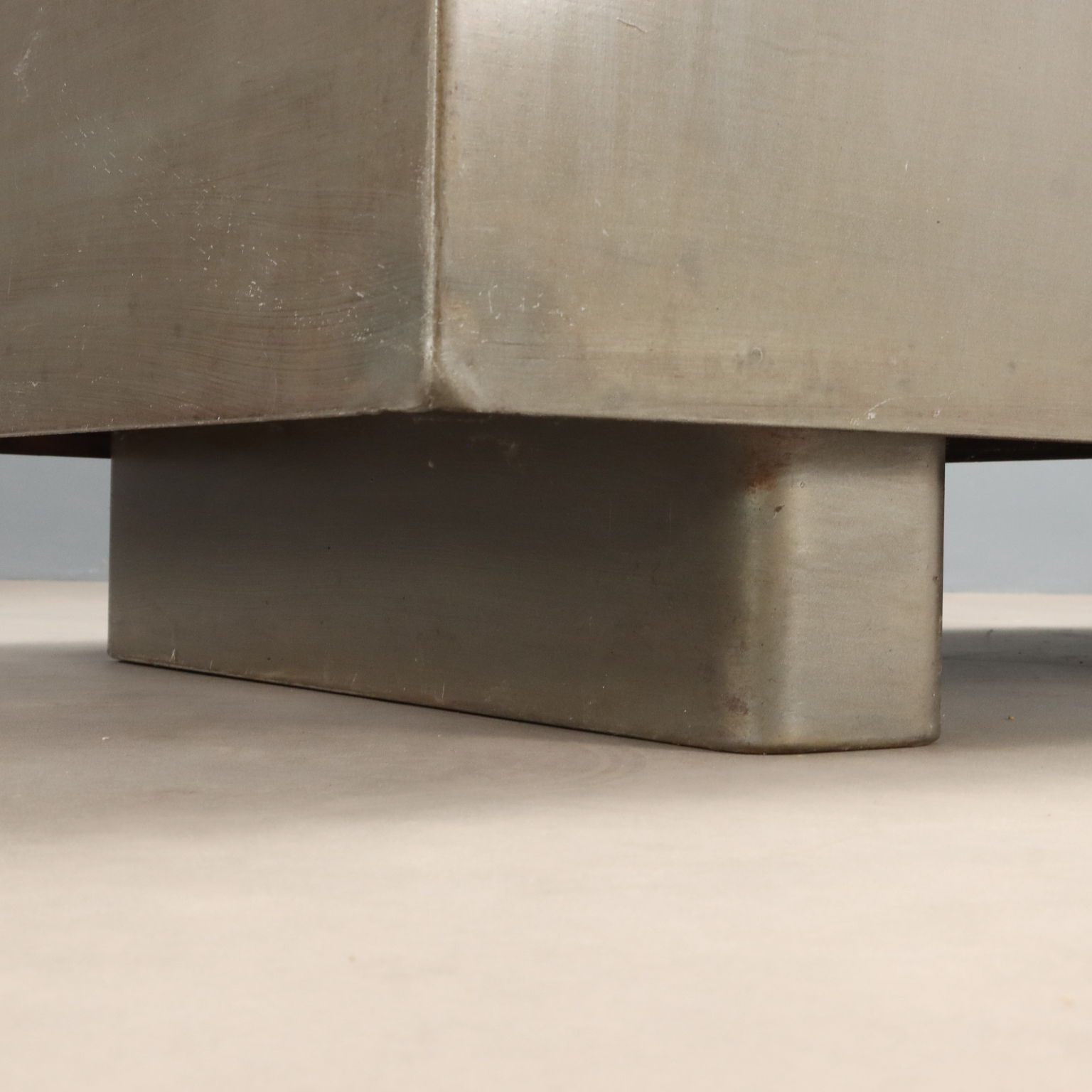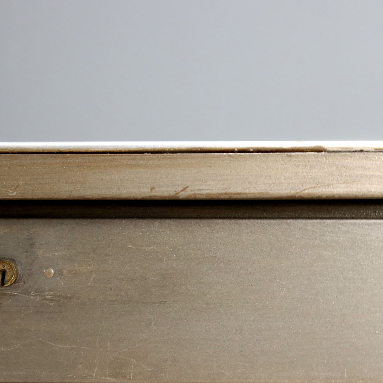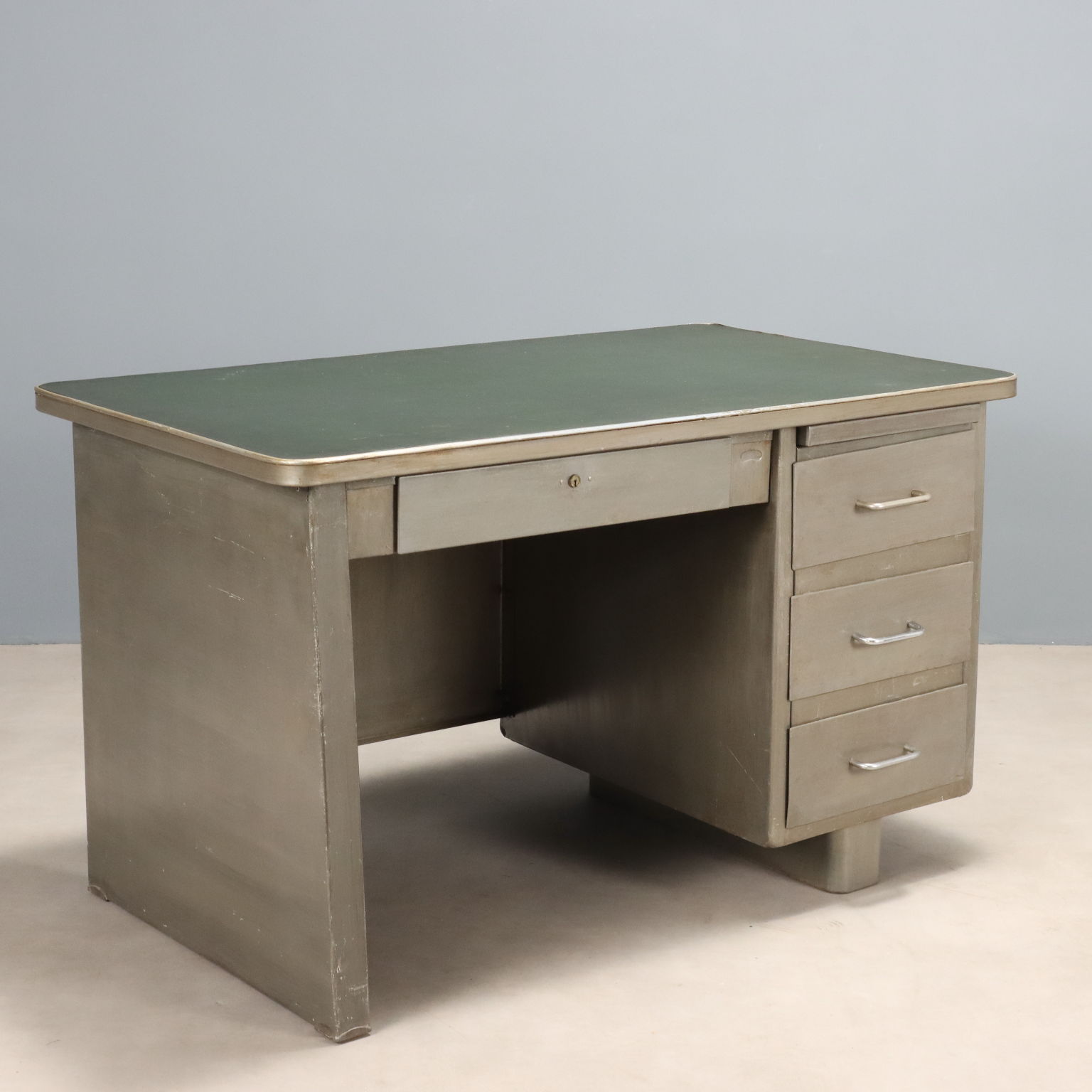 Vintage metal desk with green enamel top, small drawer under the top and a row of three side drawers.