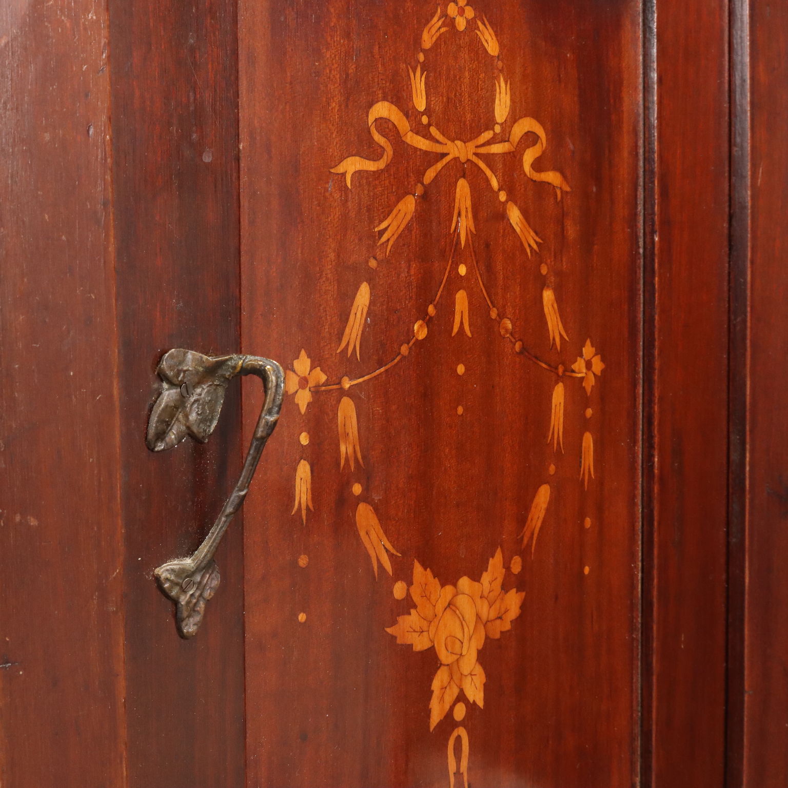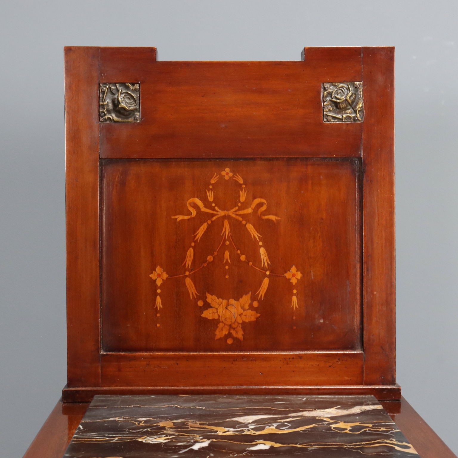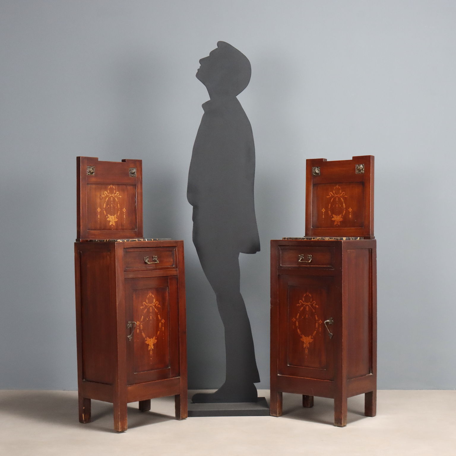 Pair of Art Nouveau mahogany bedside tables. Maple inlays on the backsplash and base door, marble top, and drawer underneath. Italy, early 20th century.