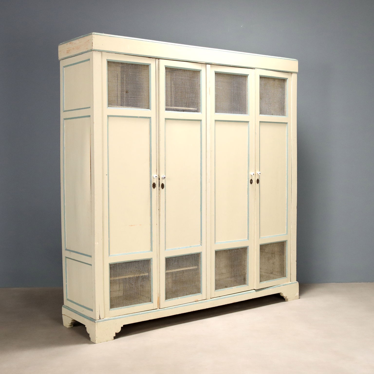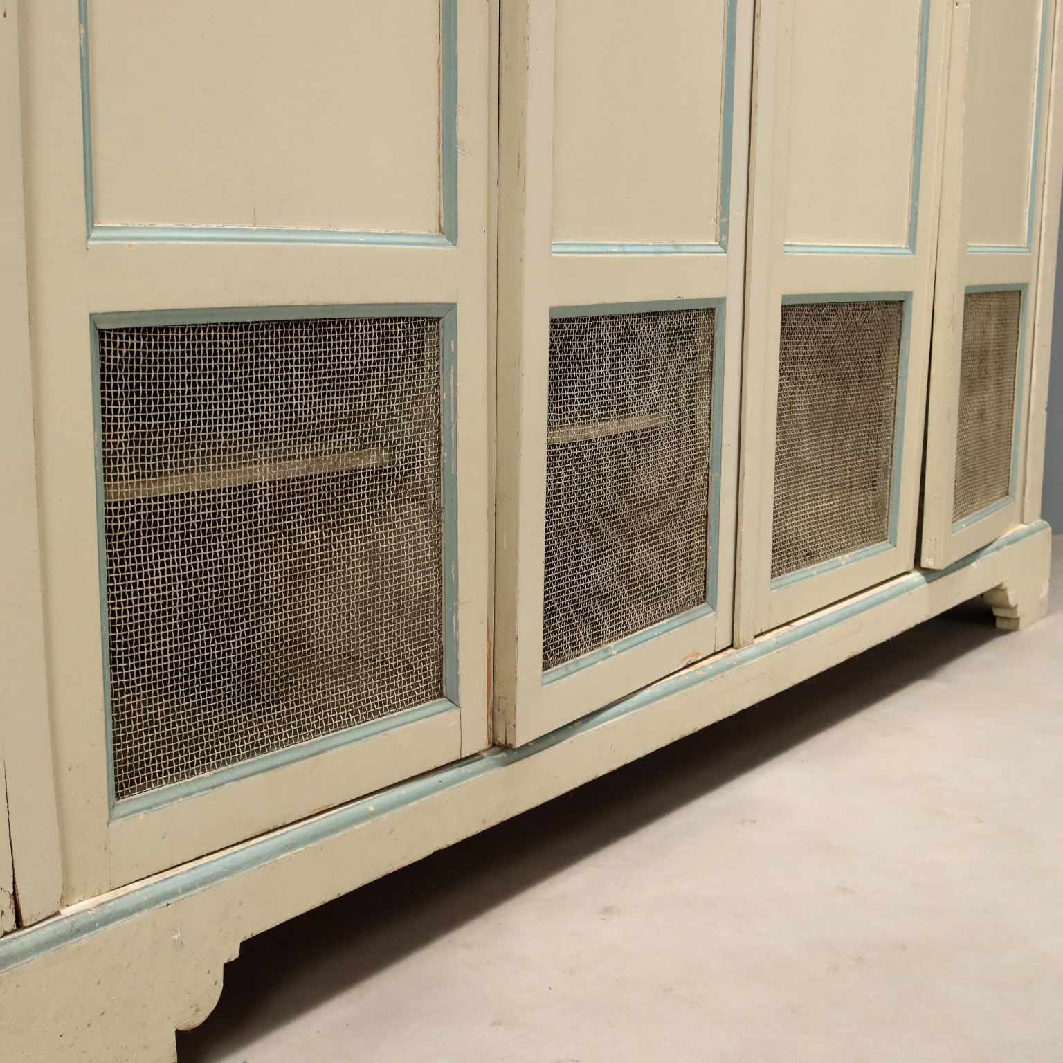 Lacquered fir pantry cabinet. Front with four tripartite doors, central wooden panel, upper and lower with mesh. Italy, early 20th century.