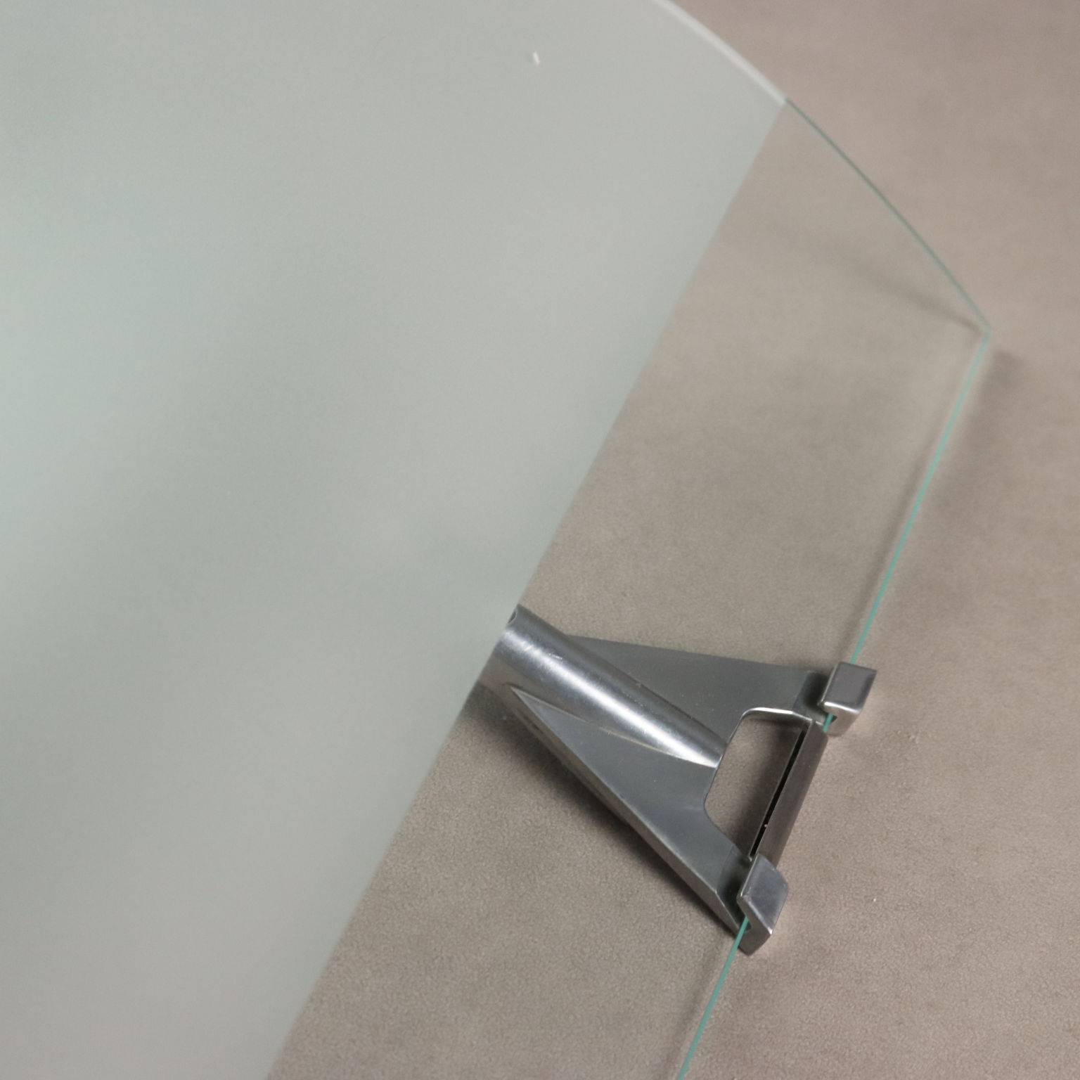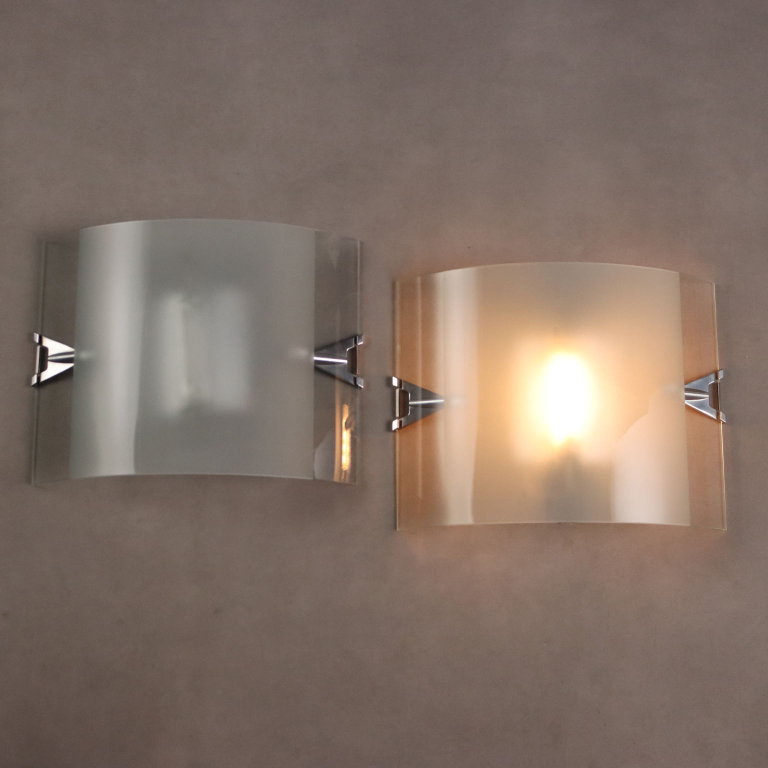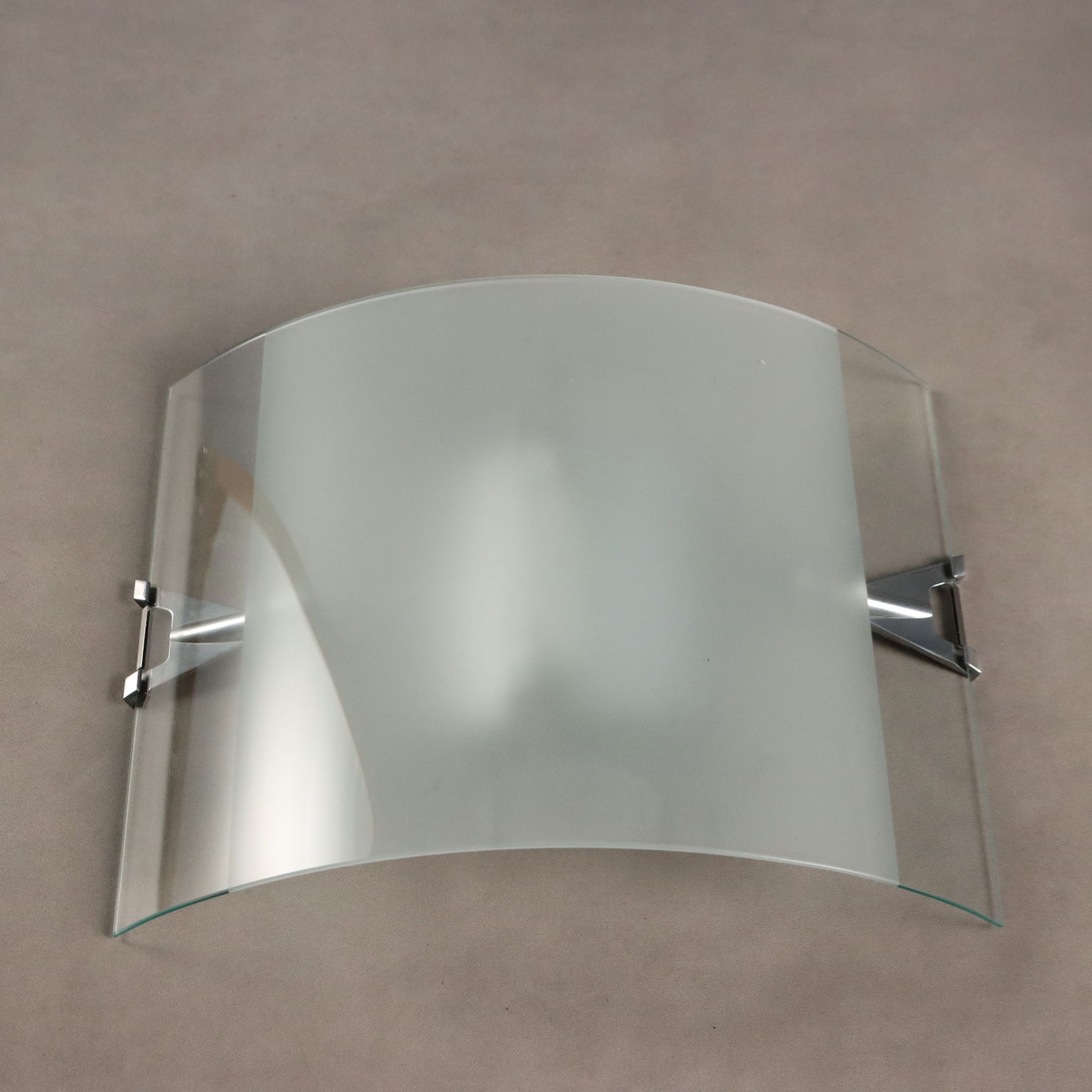 Pair of wall lamps with curved glass diffuser sandblasted in the central part and aluminium and steel hooks.