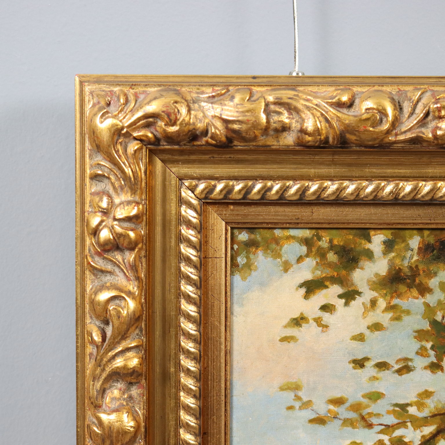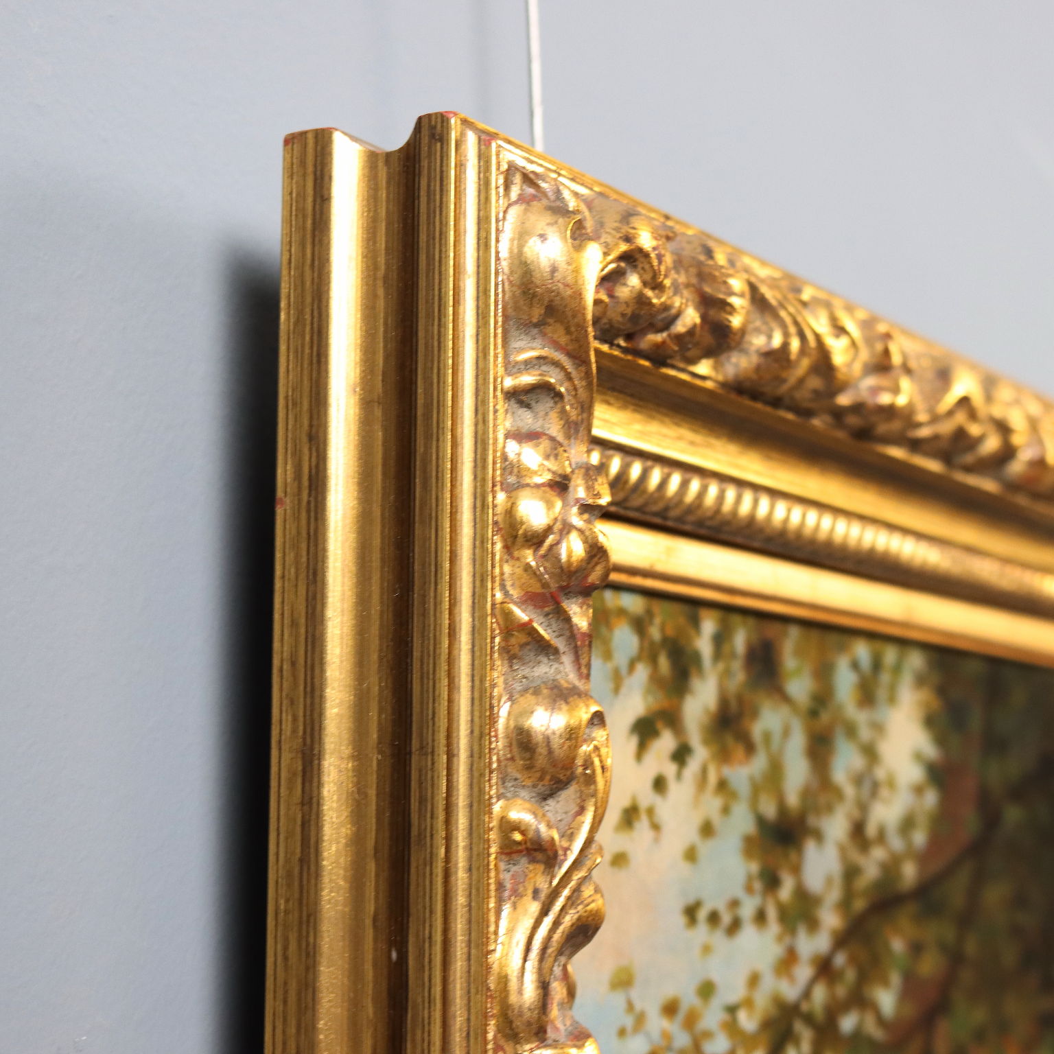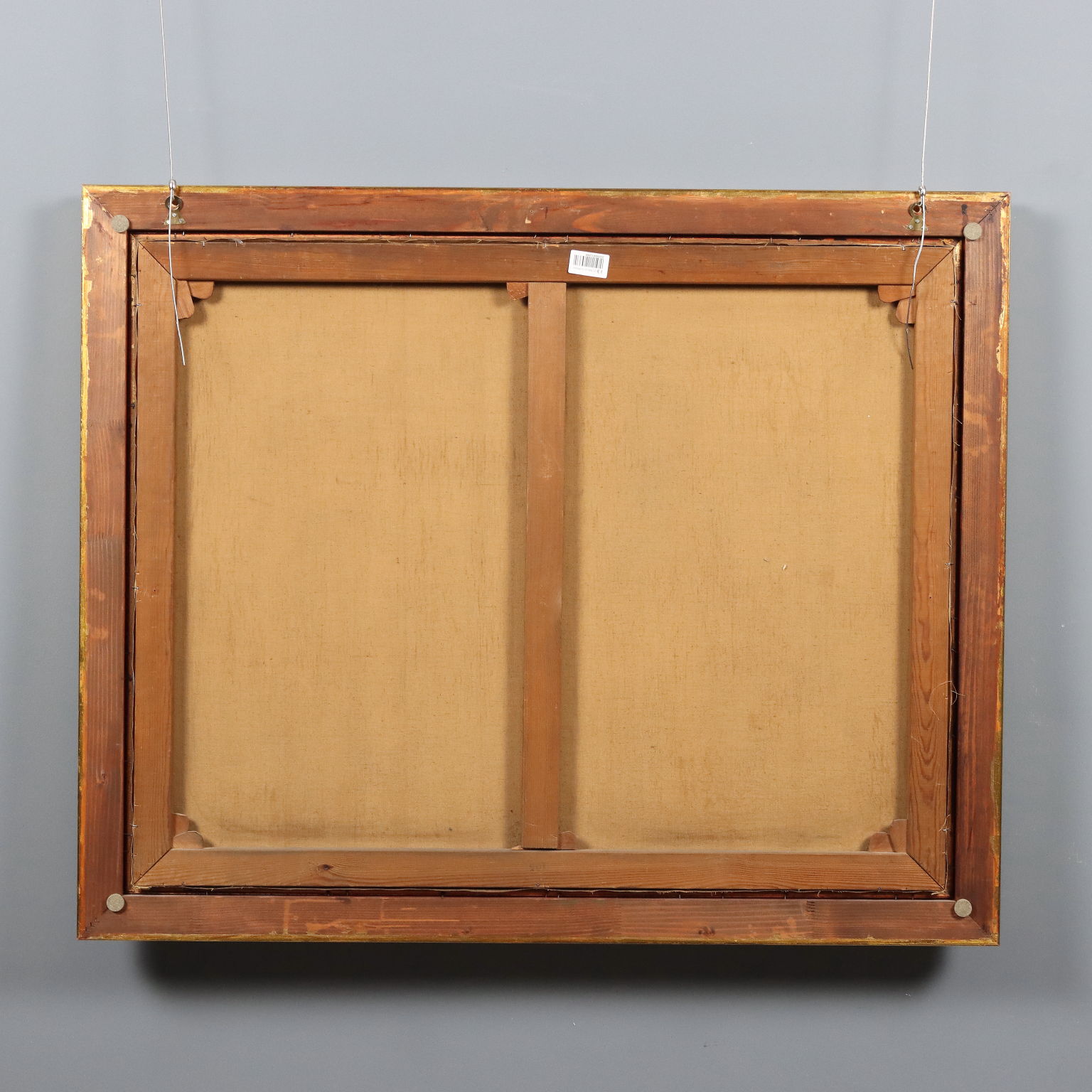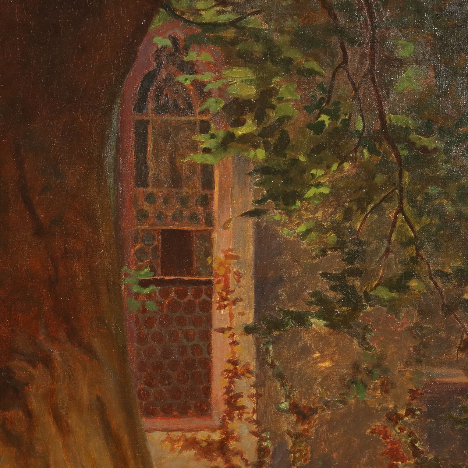 Oil on canvas. This is a copy of a painting by Benjamin Vautier from 1881, sold at a Sotheby's auction in 1998. The Swiss artist specialized in popular genre scenes: in this painting, two young women walking along the path leading out of the little church behind them exchange secrets, unaware of the priest sitting reading his breviary on the bench behind the tree! The work is presented in a period frame.