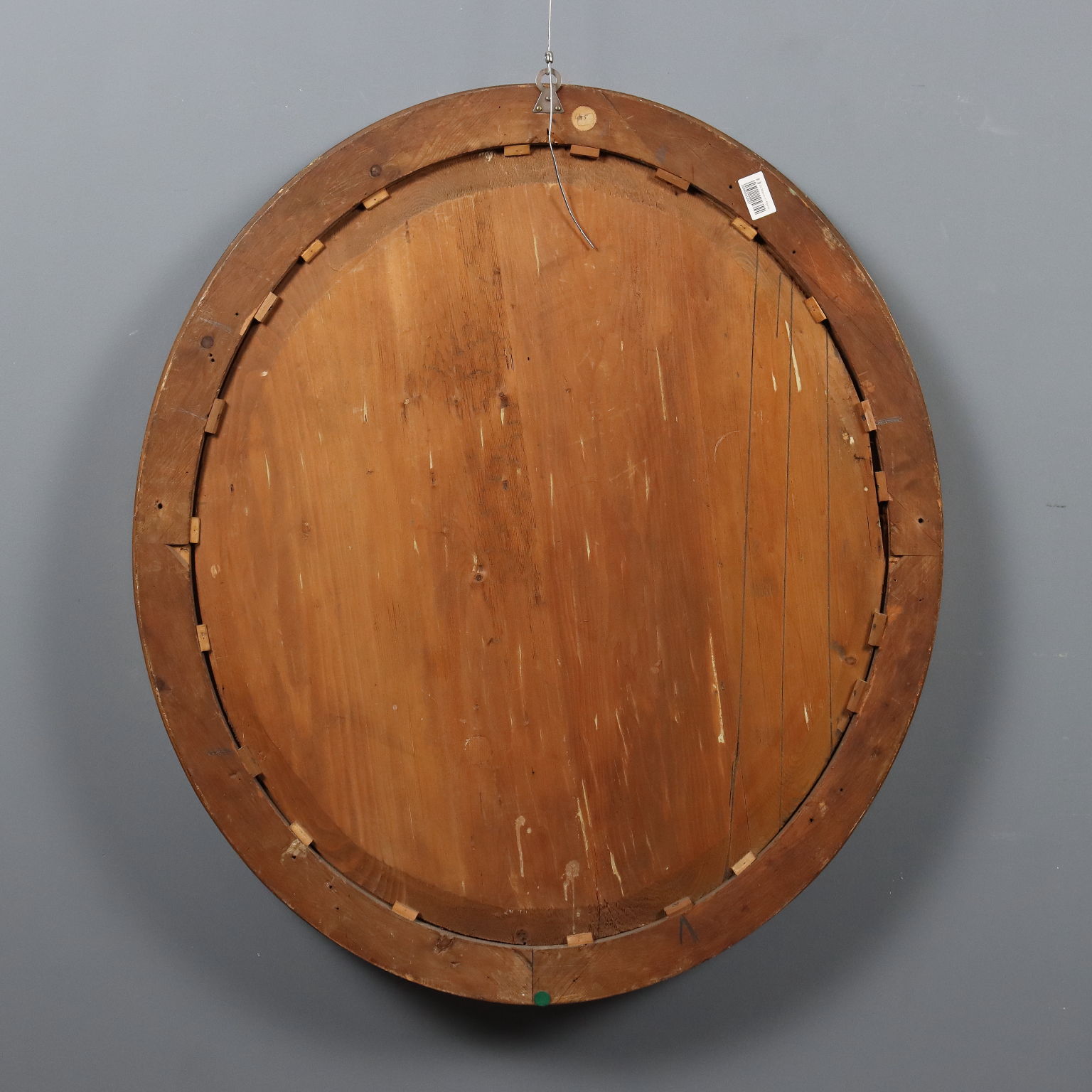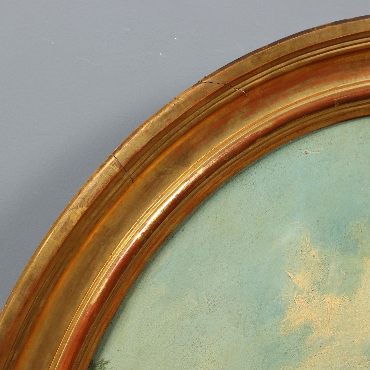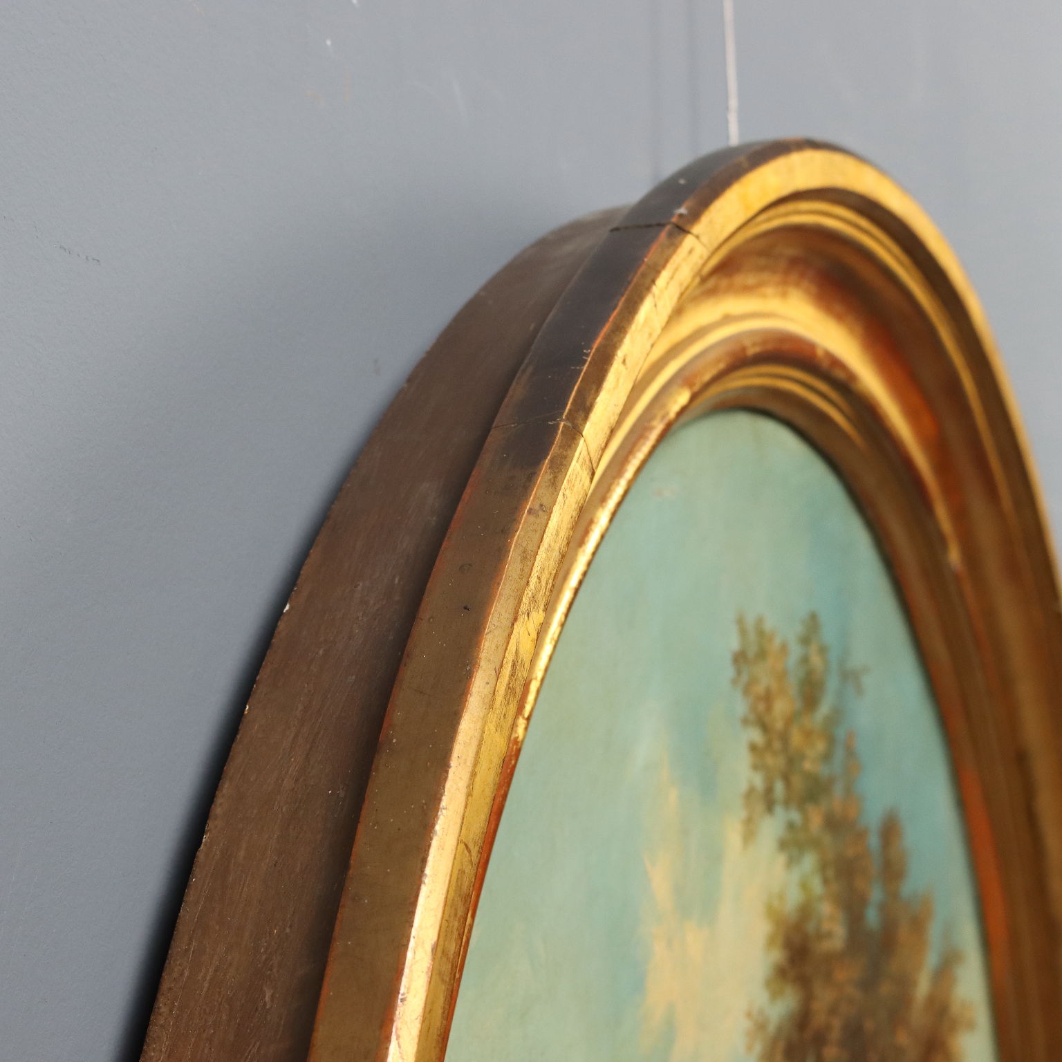Oil on oval panel. The painting reflects 18th-century pictorial styles: in a broad landscape with mountain peaks in the background, a river flows, flanked by houses; at the center of the scene, a stone bridge spans it, over which several figures walk, while other characters go about their daily tasks on the path or along the river itself. The painting is presented in a contemporary gilded wooden frame.