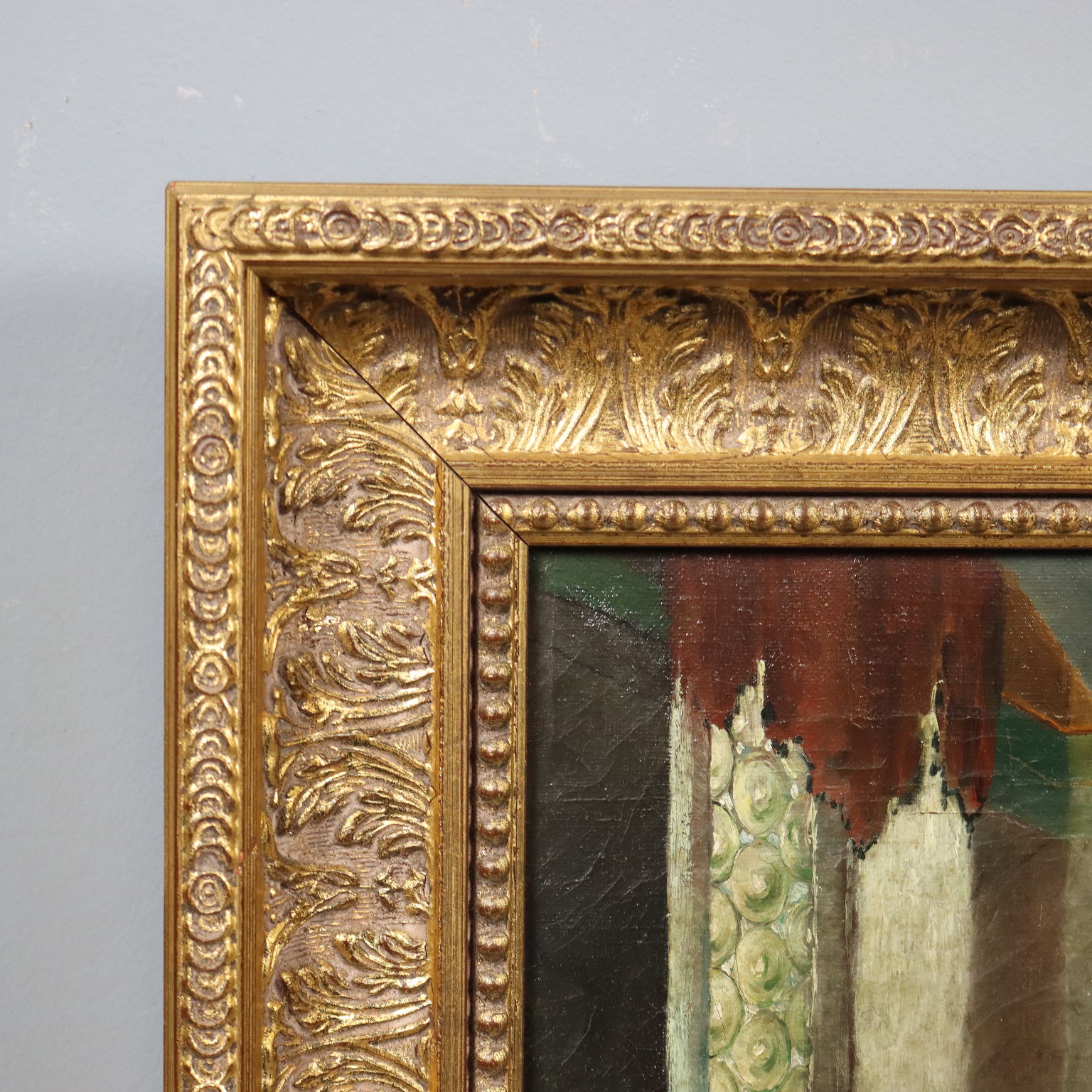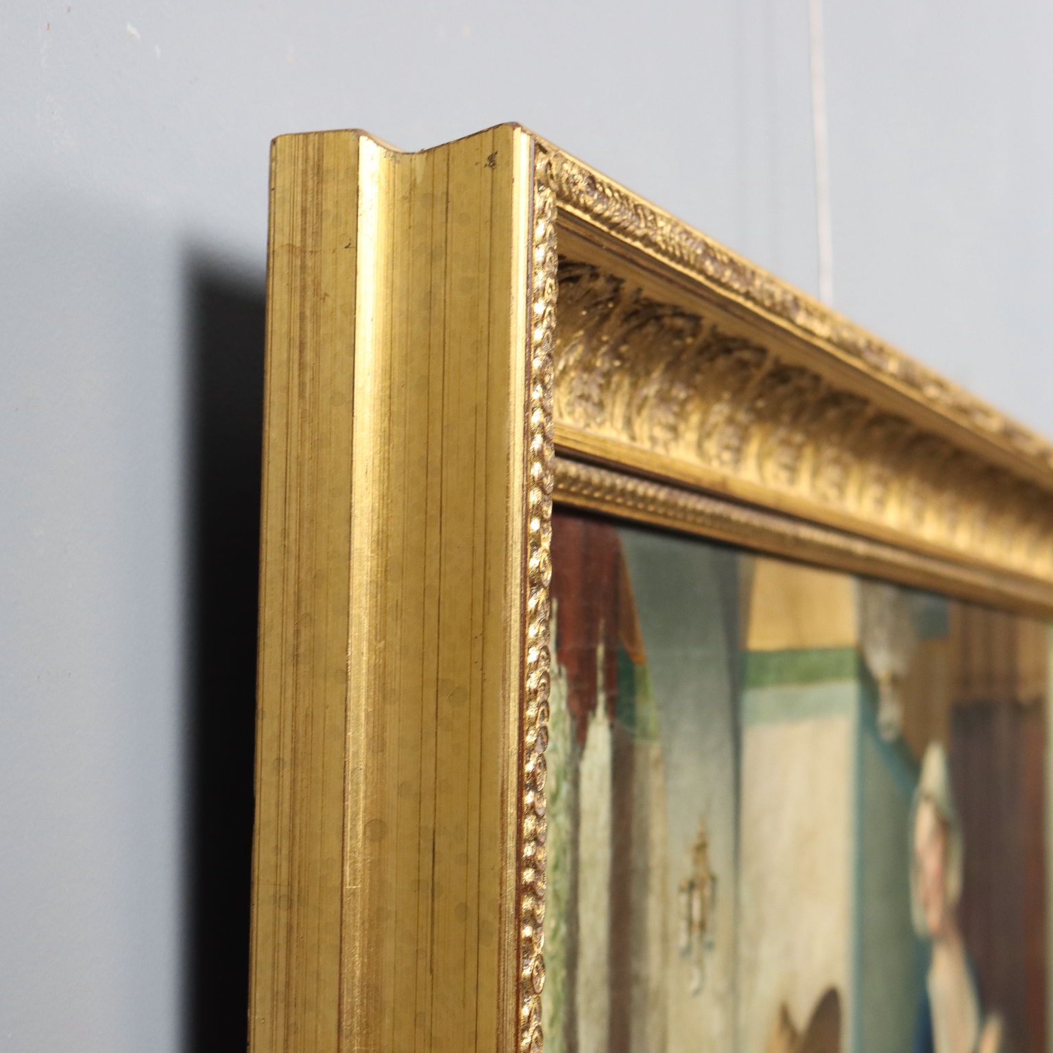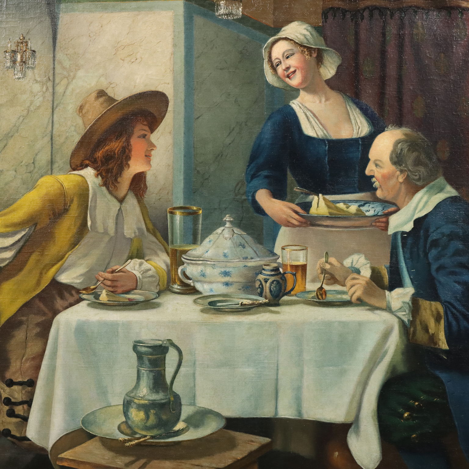 Oil on canvas. The signature G. Freye appears at the bottom left, which may attribute the work to Georg Hermann Freye (1844-1921), a Dresden artist known primarily for his religious and historical works. The genre scene draws on subjects and styles from 17th- and 18th-century Dutch painting. Set in a private home, it depicts a family meal, with the stern father speaking to his more light-hearted son, under the smiling and complicit gaze of his mother. The work is presented in a period frame.