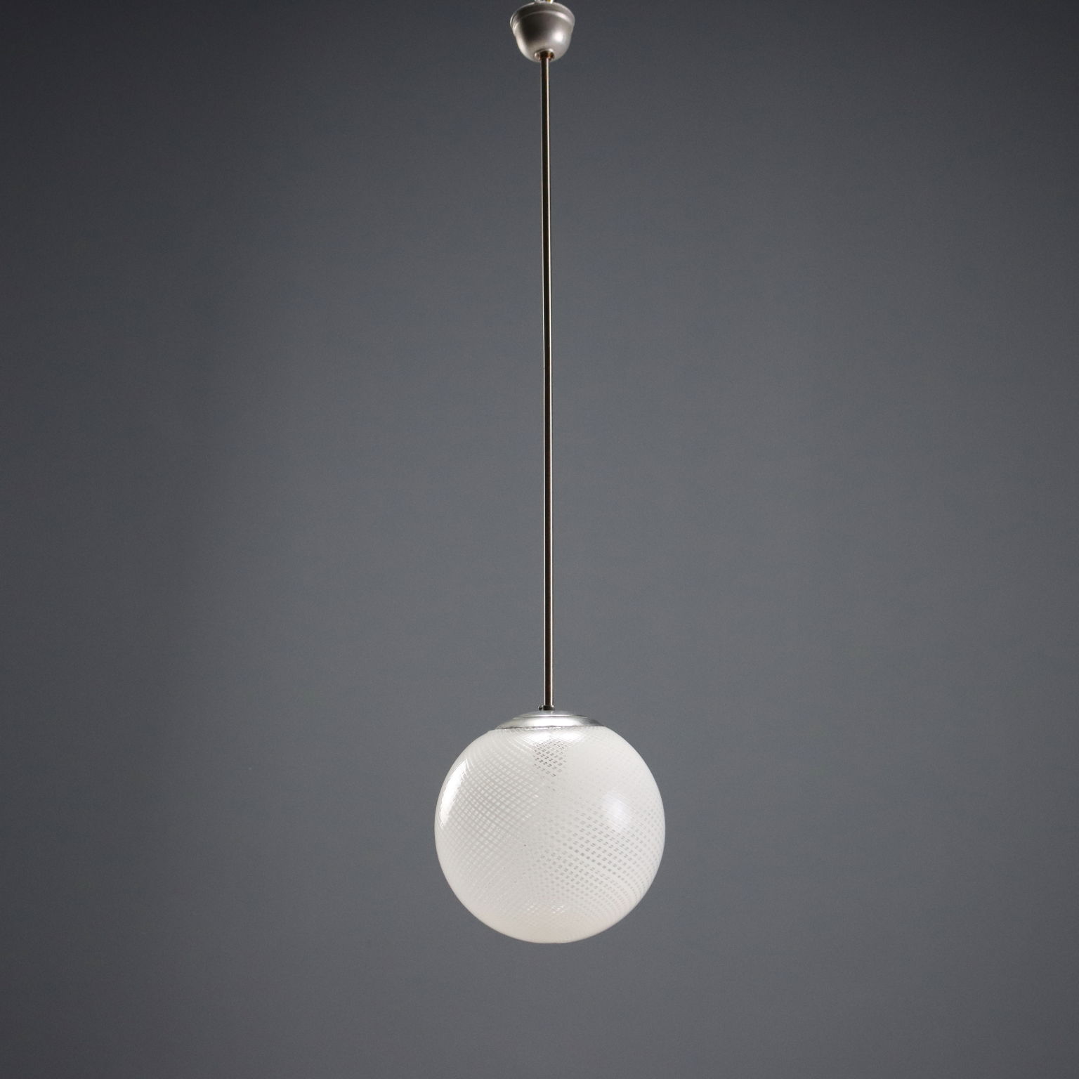 Lamp with aluminum base and stem, bowl-shaped diffuser in worked glass. It comes with one E27 bulb.