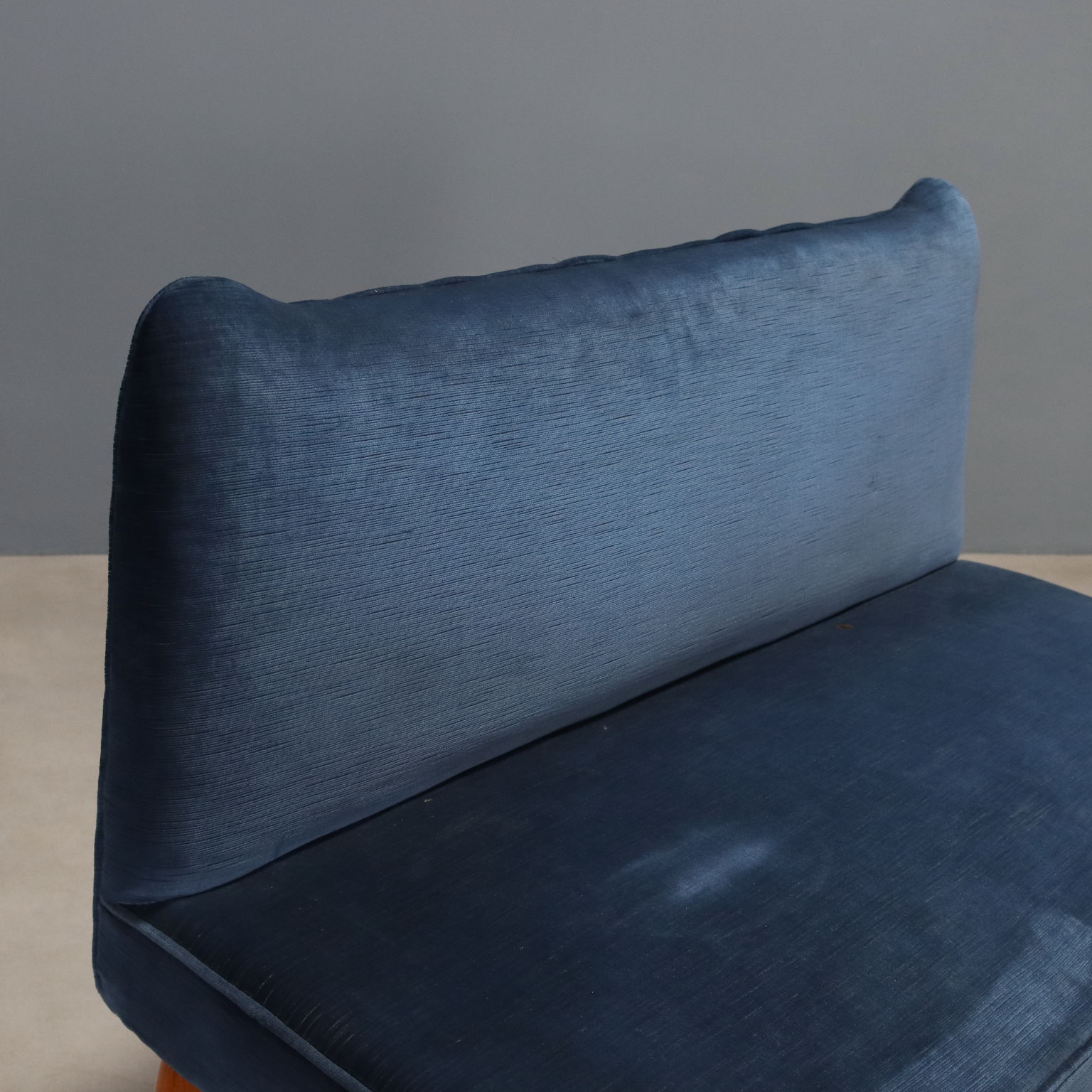 Elegant bench with sprung padding, with dralon velvet upholstery, turned beech wood legs with brass tips. Decent condition.