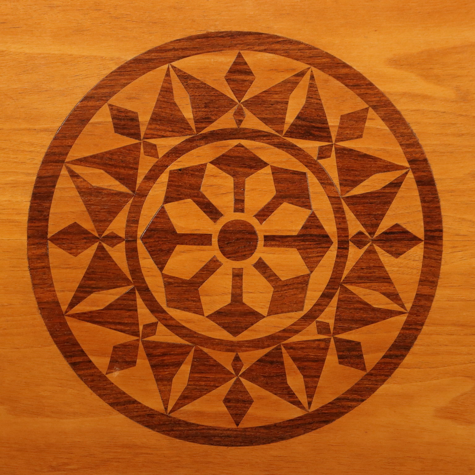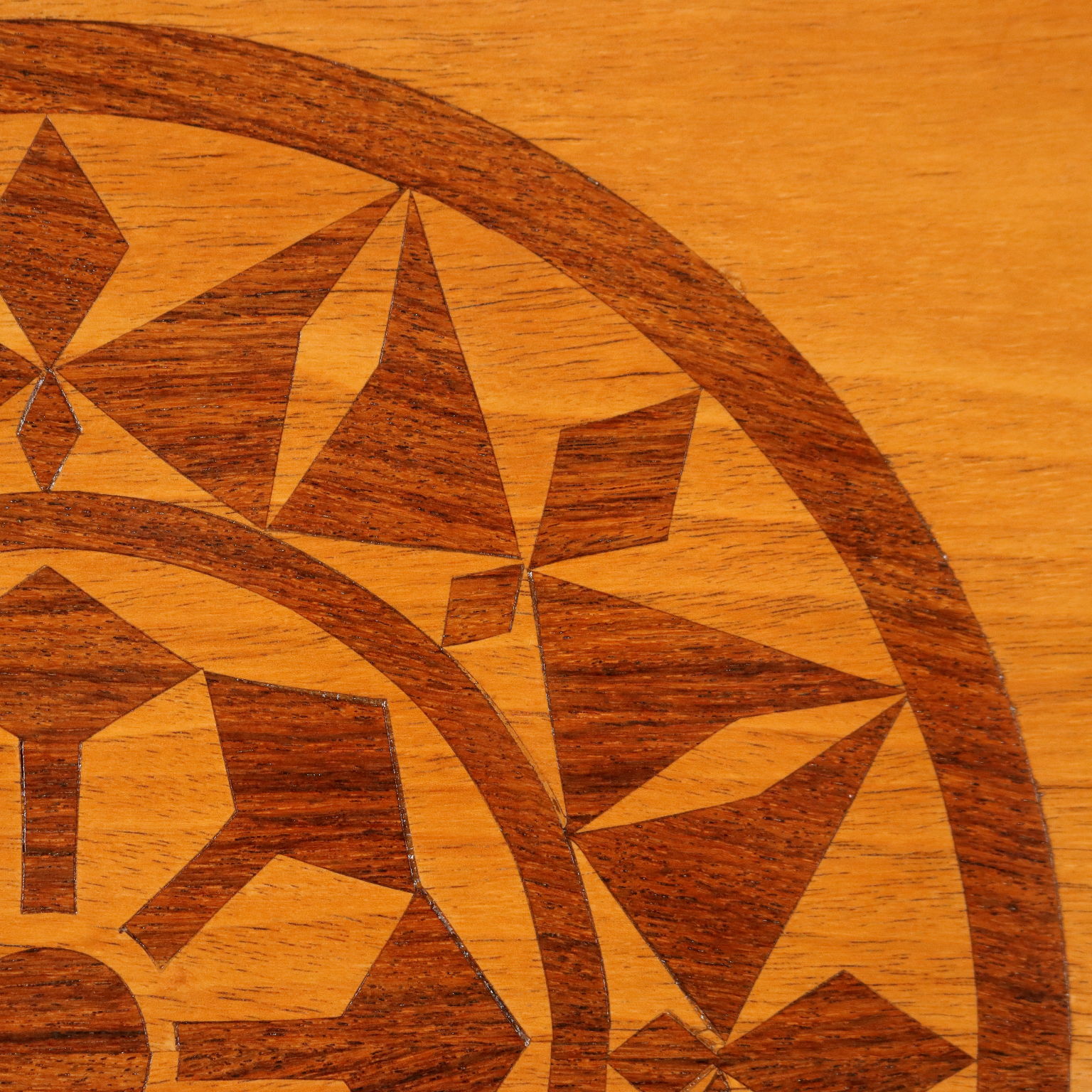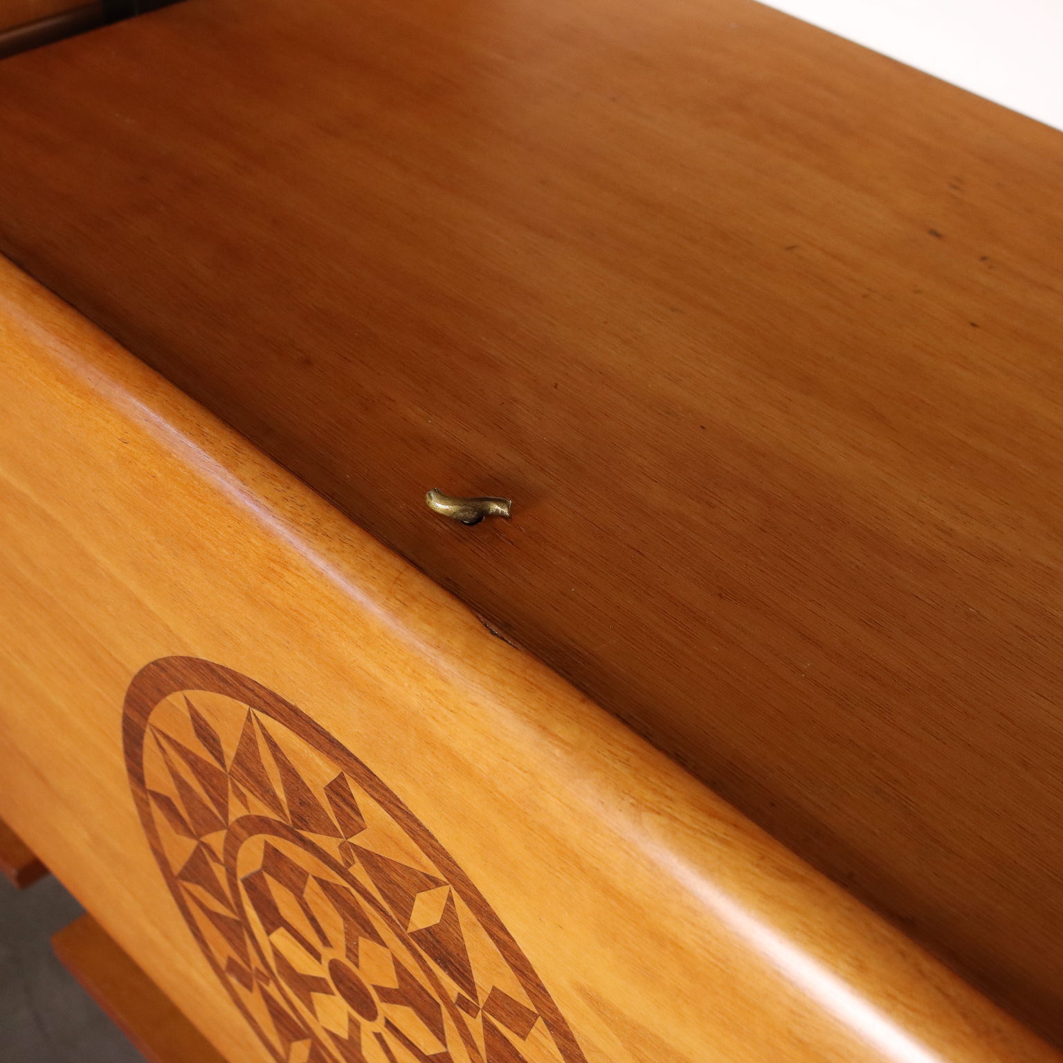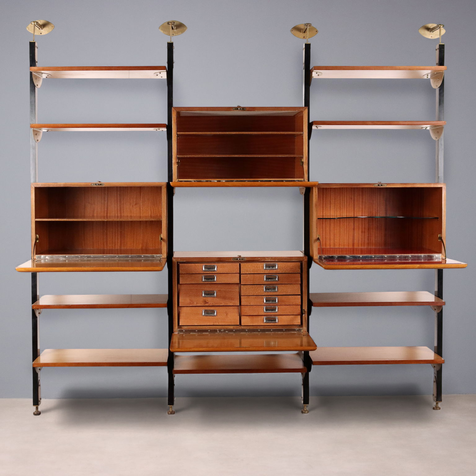 Vintage bookcase with wall anchoring system composed of stained wooden uprights with enamelled metal fixing elements, shelves and adjustable storage compartments with a rounded front embellished with an inlay motif.