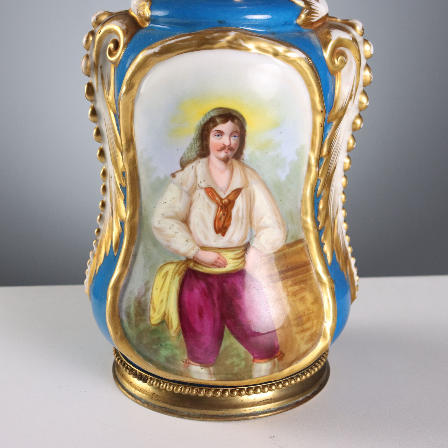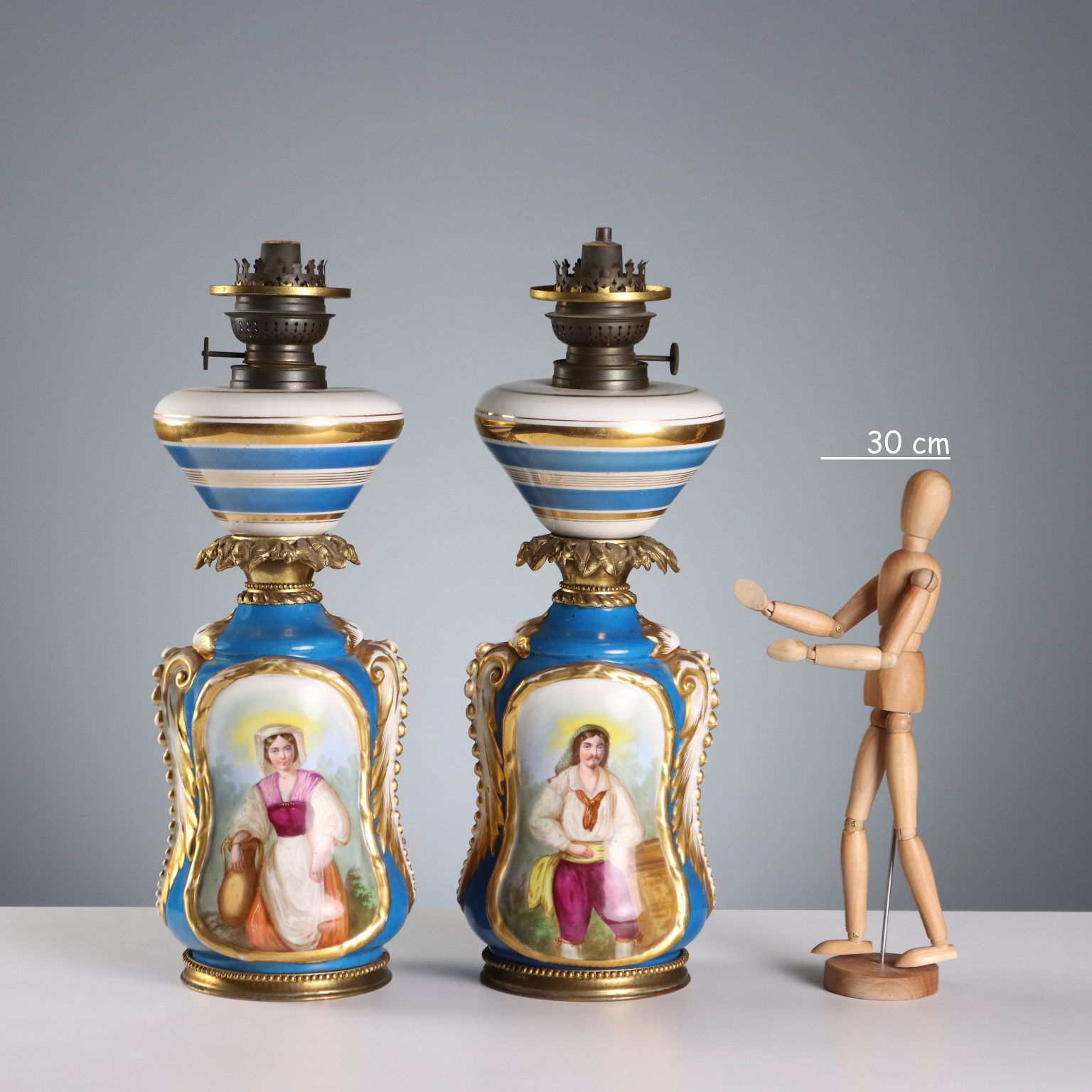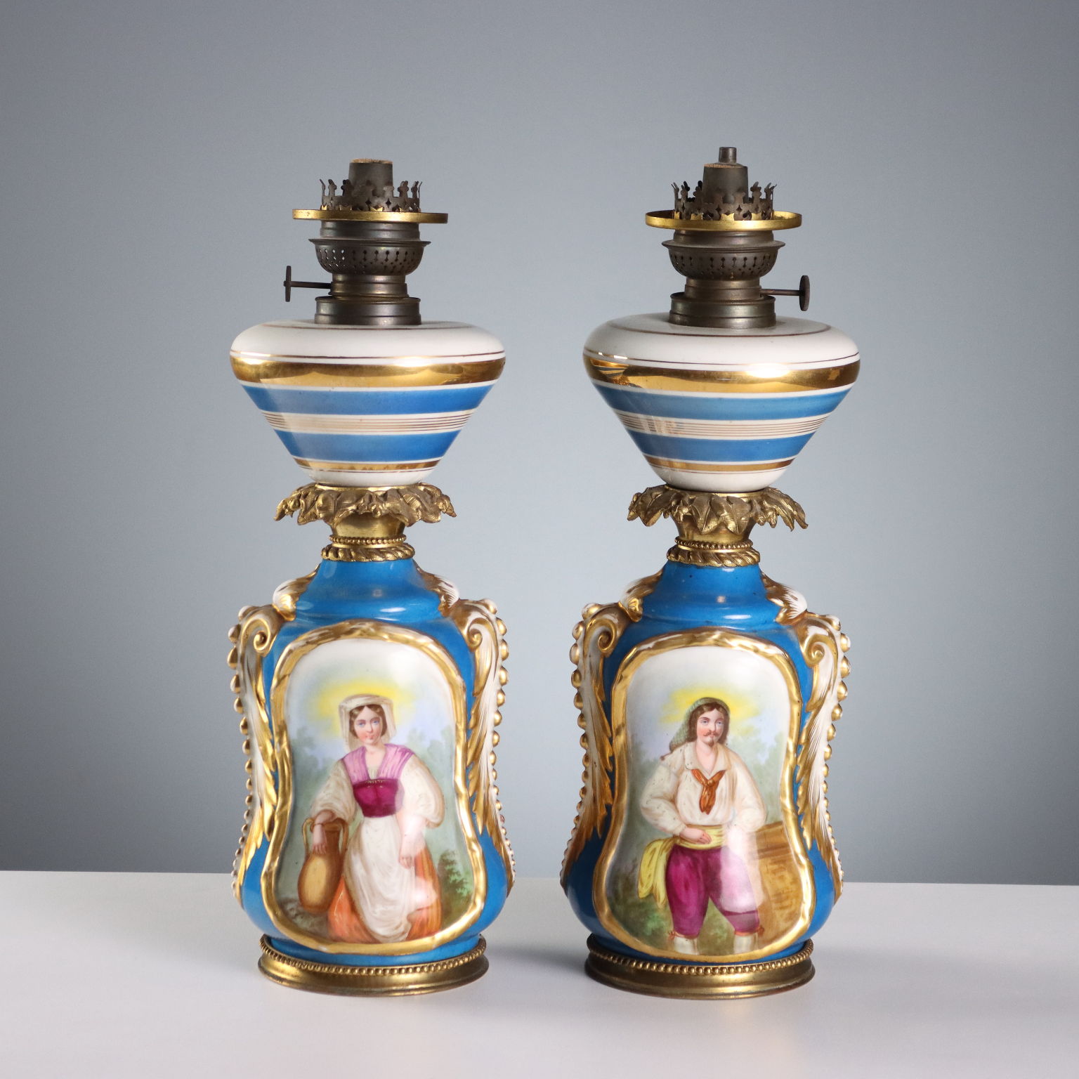 A pair of ceramic lamps painted in polychrome with bold gold highlights. The reserves feature floral arrangements and figures of common people. The rings are chiseled bronze with a plant theme. The boiler is marked Kosmos.