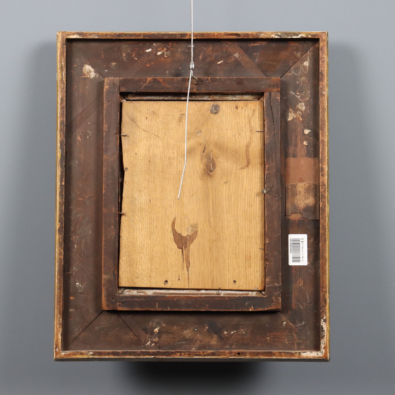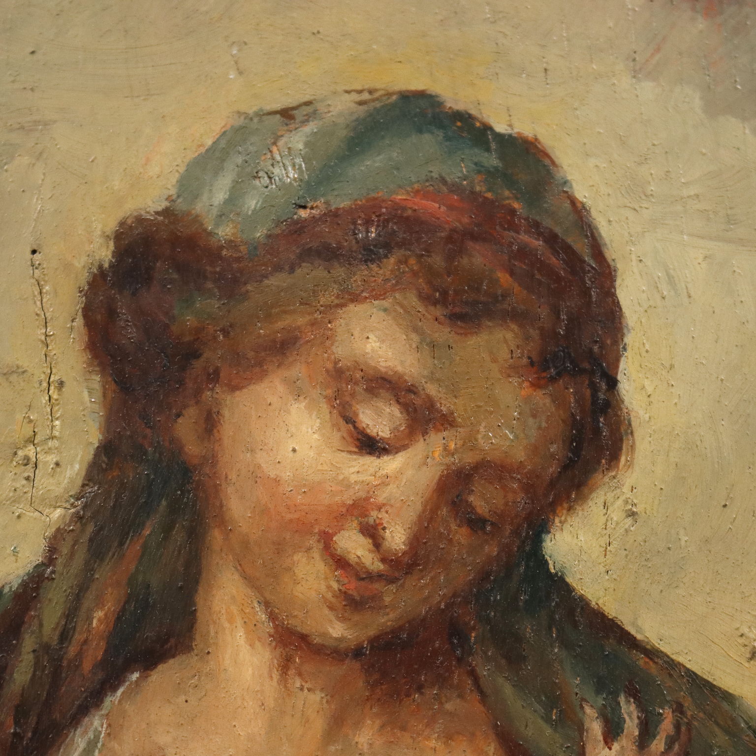Oil on panel. The painting harks back to 17th-century painting styles. The subject—the Virgin depicted bare-breasted, caught in the act of breastfeeding her Son—has always been widespread and a subject of devotion, as it emphasizes the human dimension and the strong bond between mother and child, even as Jesus' gaze directed toward the viewer reminds us that He came to save humanity. The painting is presented in a late 19th-century frame.