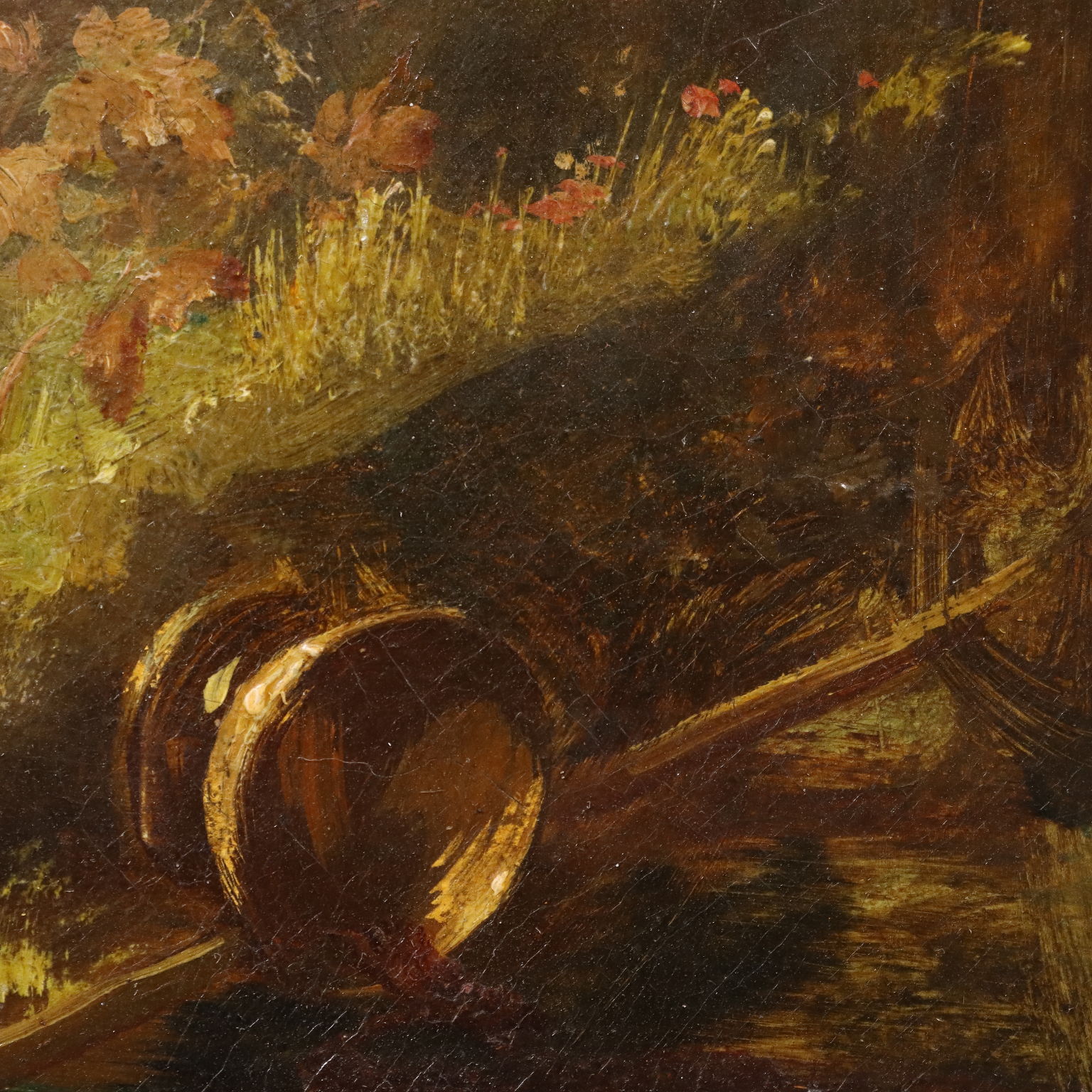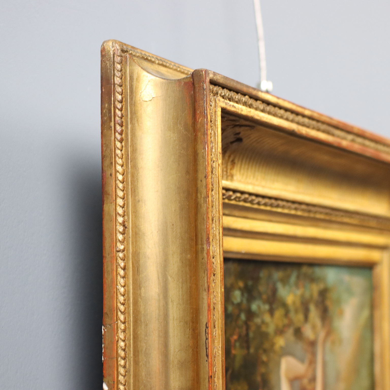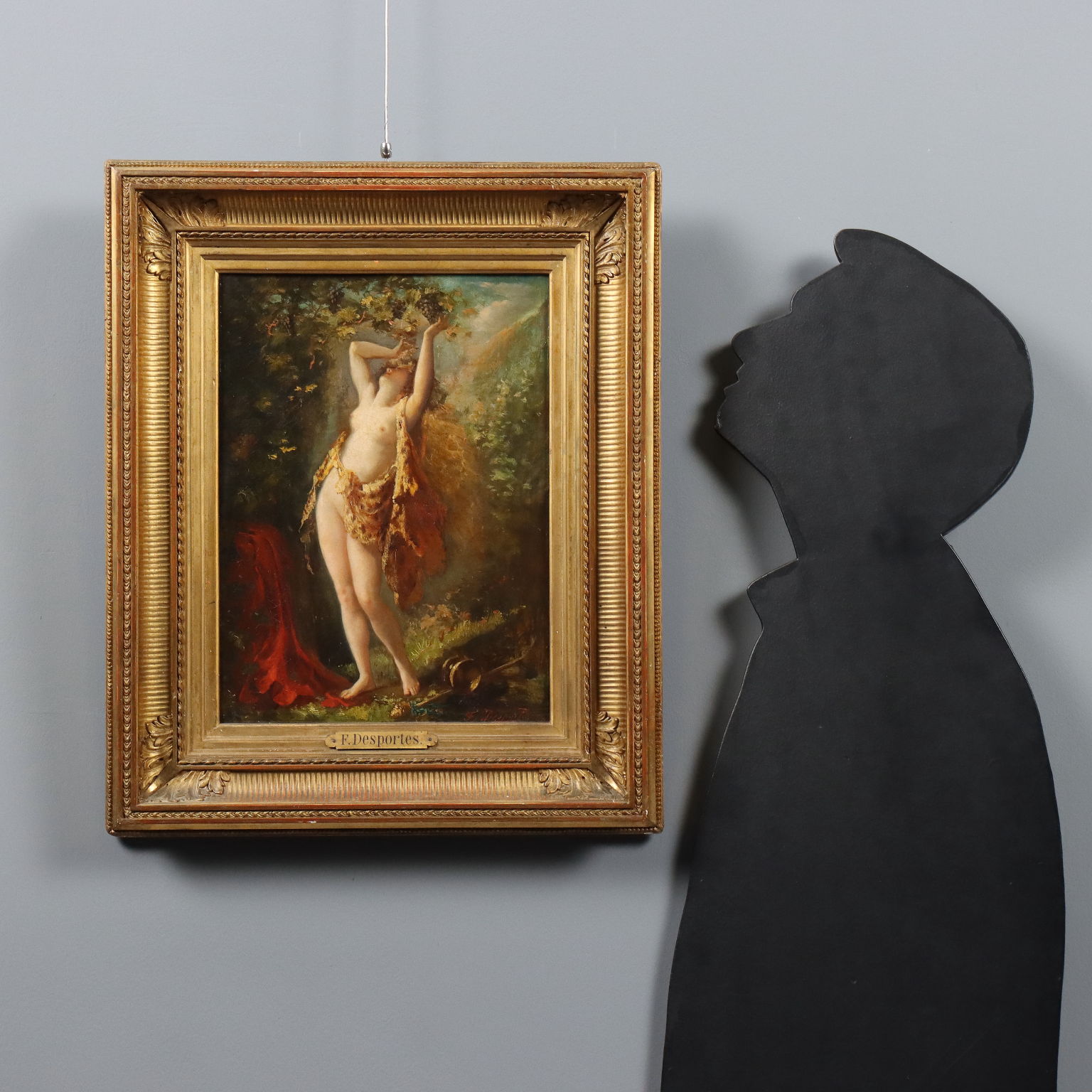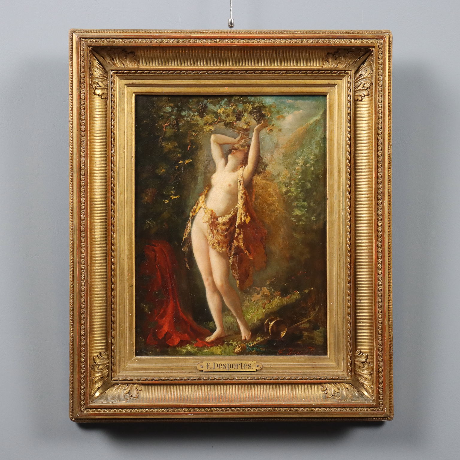 Oil on canvas. Signed lower right. The French painter Francisque Desportes created many genre scenes featuring female figures in allegorical-mythological garb, striking sensual poses, evoked by atmospheres and colors suffused with a romantic feel. In this case, the buxom girl, draped in an animal fleece that doesn't cover her nakedness, is identified as a maenad, one of the mythological figures who followed the god Bacchus. Dressed in animal skins and crowned with ivy, oak, or fir, they celebrated the god by singing, dancing, and wandering like animals through mountains and forests, intoxicating themselves with the fruits of the vine like him. This girl is portrayed in the act of reaching out to pluck bunches of grapes from above her head, a movement resembling a dance step. Resting on the ground at her feet are a jug and the rattle-topped staff that the maenad used, as an alternative to other instruments, to accompany her dance. Maenads traditionally danced in wild, open spaces, like the one in the background of our painting, and mostly alone, not in groups. The work is presented in a contemporary frame.