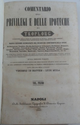 Comentario dei privilegi e delle ipoteche. Nuova edizione accresciuta nel Belgio nel confronto delle opere di Douranton, Toulier, Merlin, Rolland de Villargues, Zachariae, ..... ec.ec. che offre sotto ciascuno articolo del Codice il paragone della compilazione de' diversi progetti e i lavori preparatori, l'indicazione delle fonti e della legislazione straniera; completata dalla sinopsi e dalla bibliografia. Nuova versione italiana con note di confronto degli articoli del Codice Francese con quelli delle Due Sicilie ed una appendice risguardante la nostra legislazione e giurisprudenza fatta per cura degli avvocato Vincenzo De Matteis e Luigi Miola