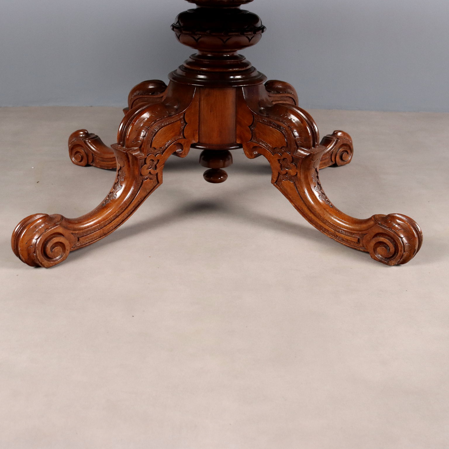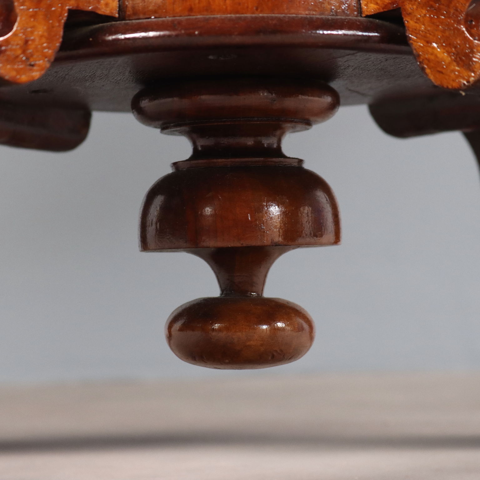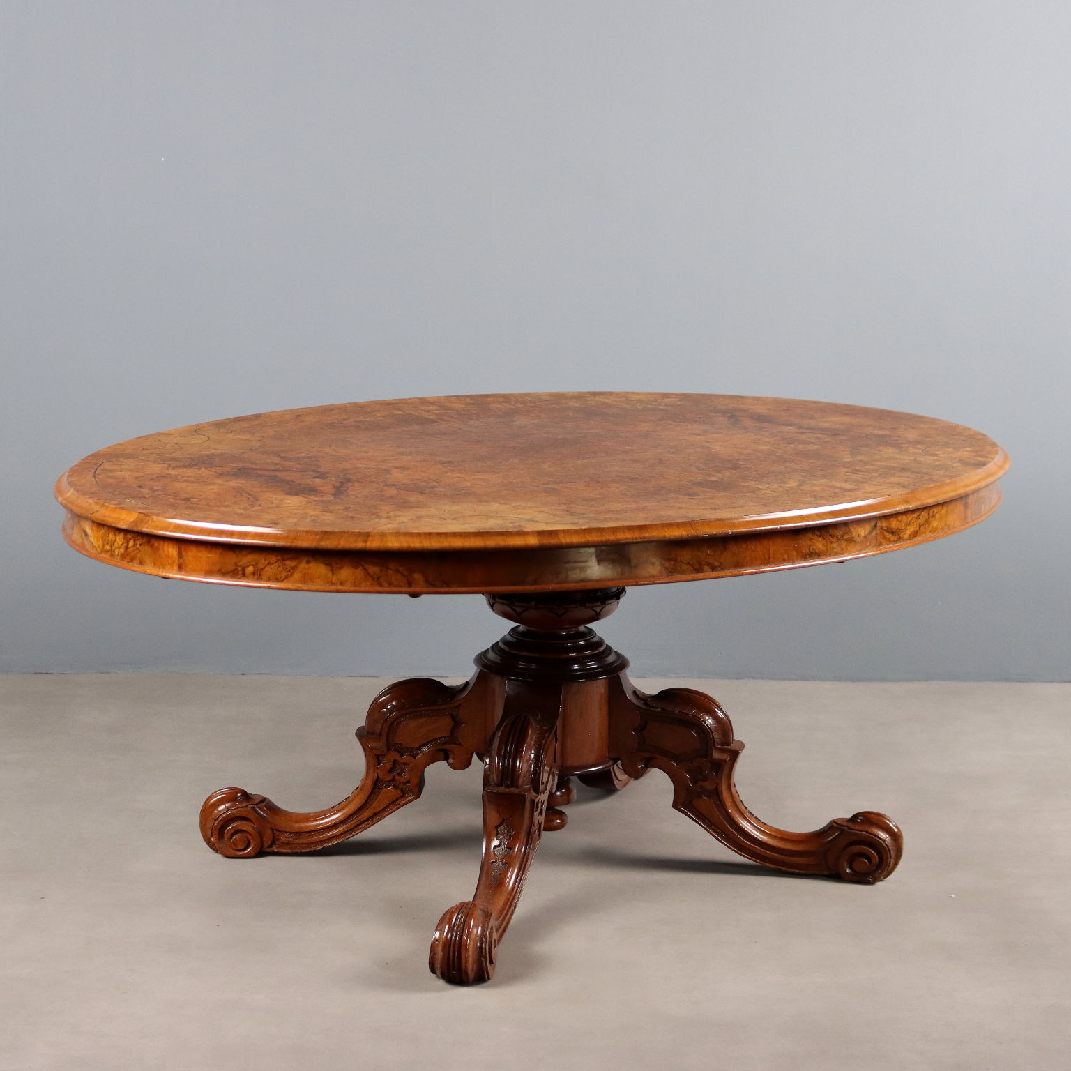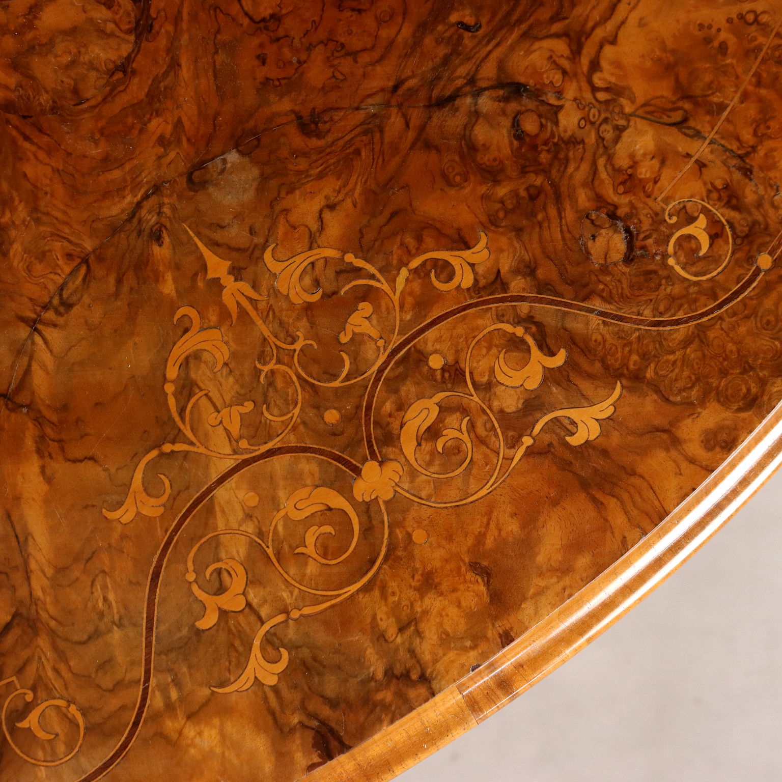 Mesa de centro de nogal y raíz de nogal. Tablero elíptico con detalles e incrustaciones de arce y nogal. Pata central torneada que descansa sobre cuatro patas curvas y talladas. Italia, finales del siglo XIX.