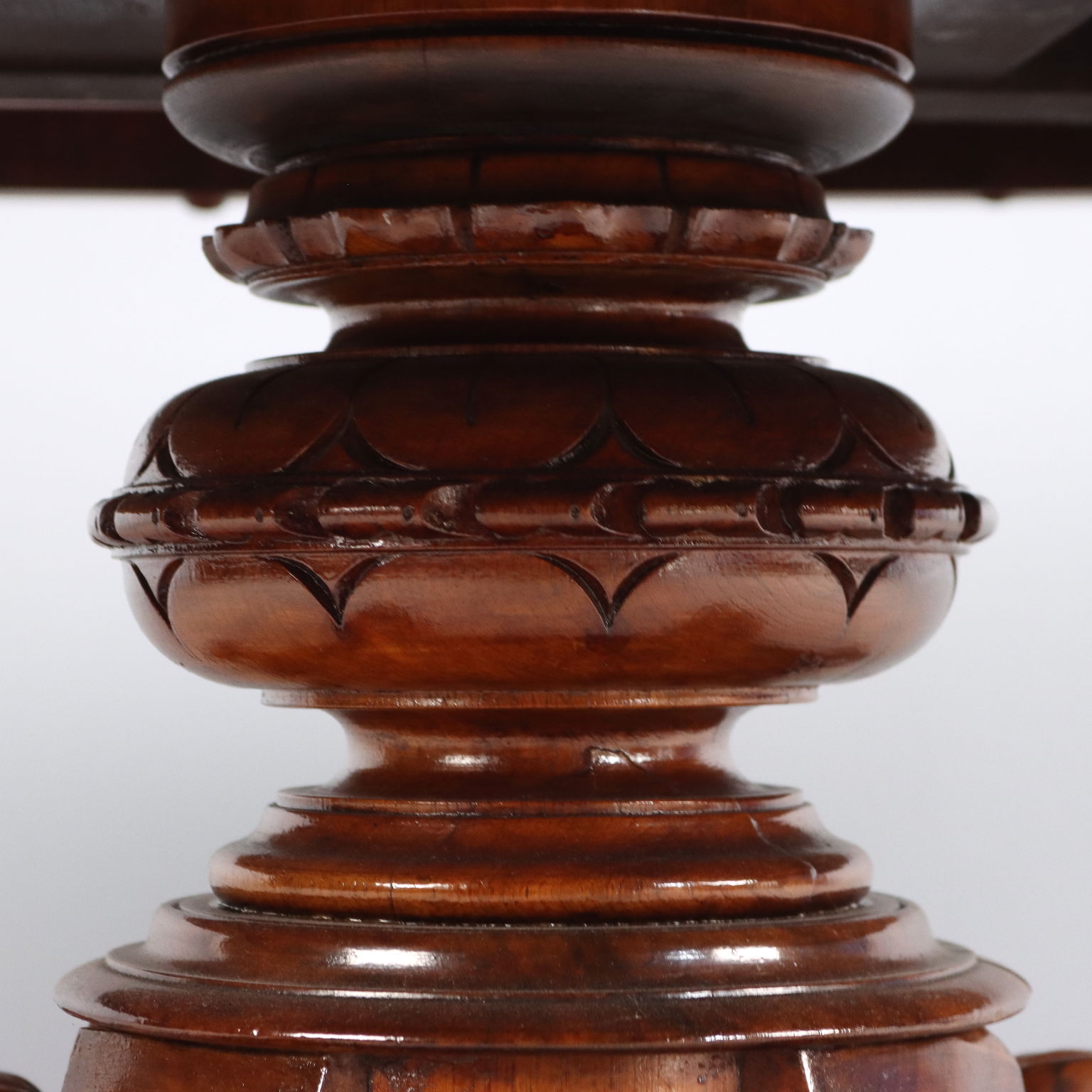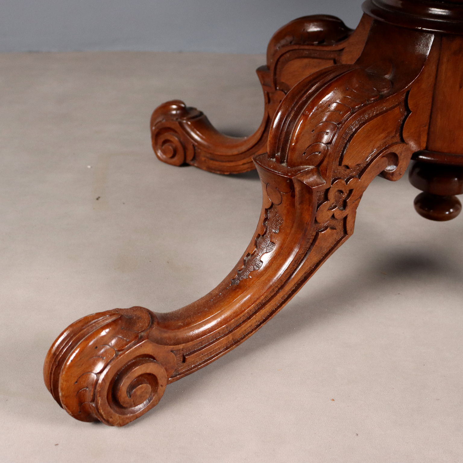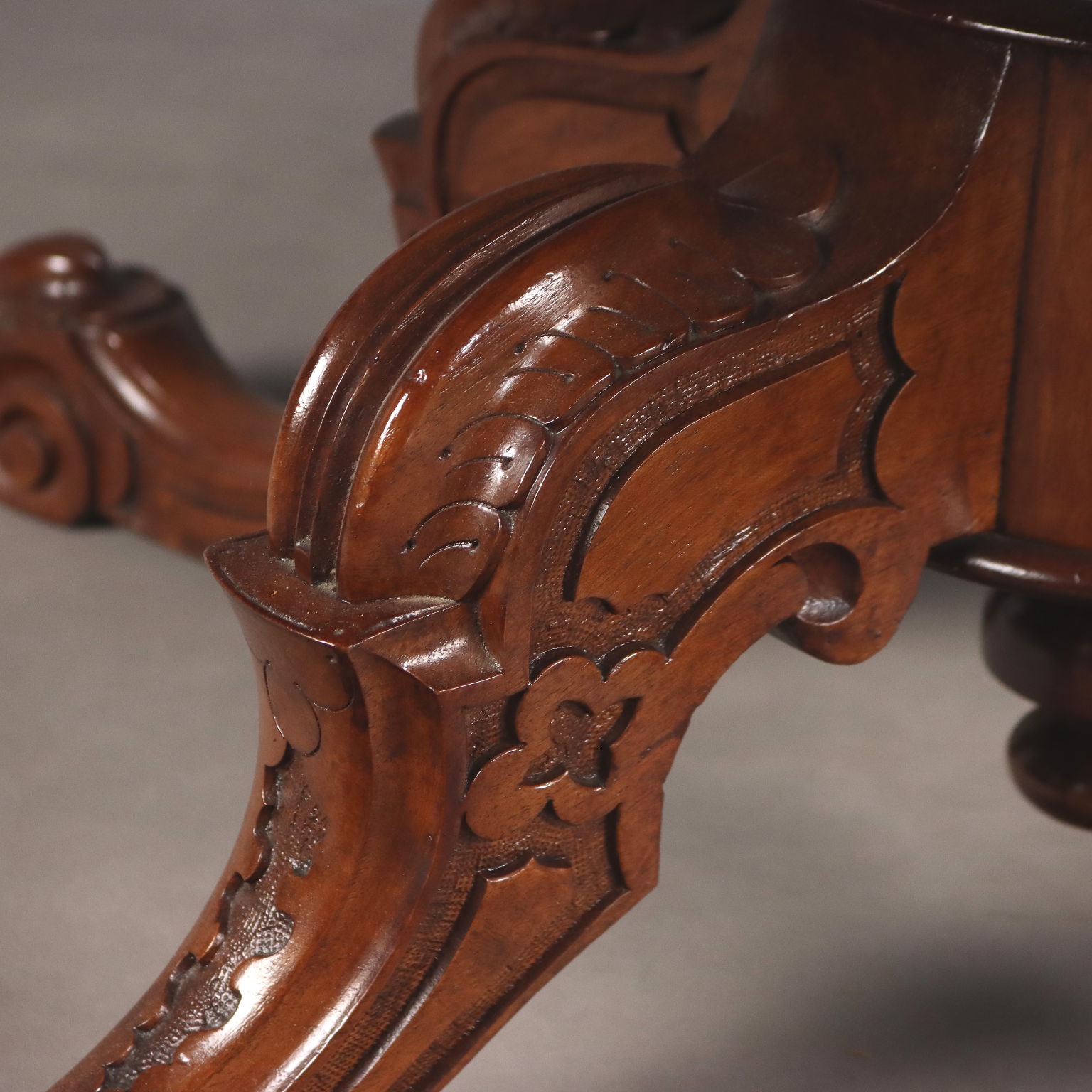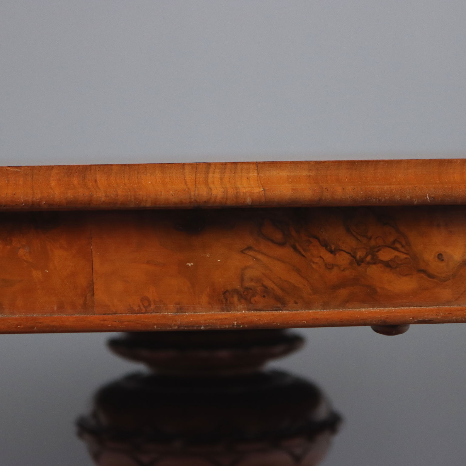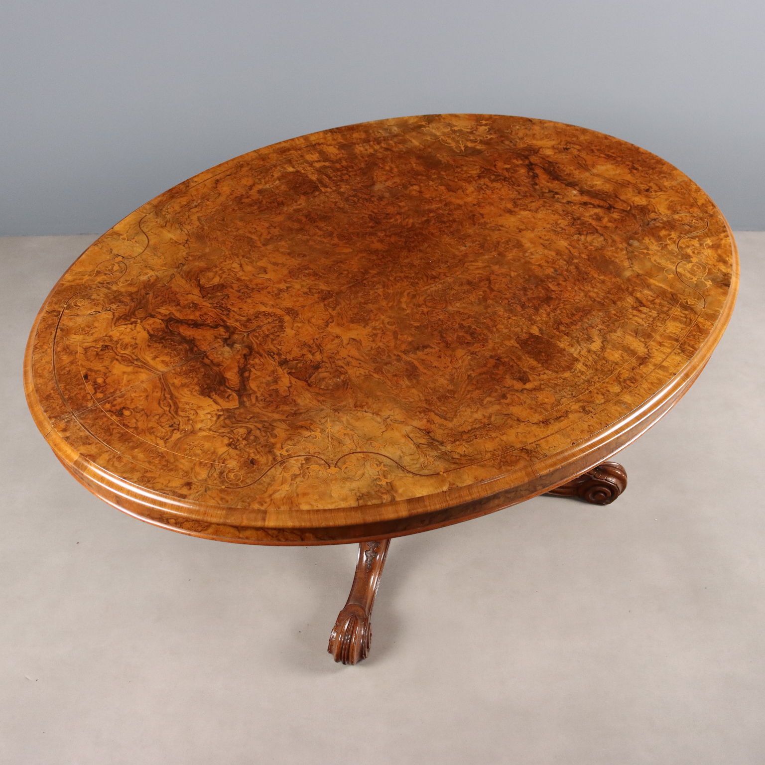 Mesa de centro de nogal y raíz de nogal. Tablero elíptico con detalles e incrustaciones de arce y nogal. Pata central torneada que descansa sobre cuatro patas curvas y talladas. Italia, finales del siglo XIX.