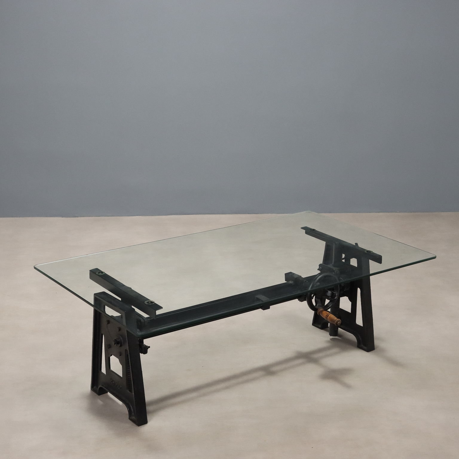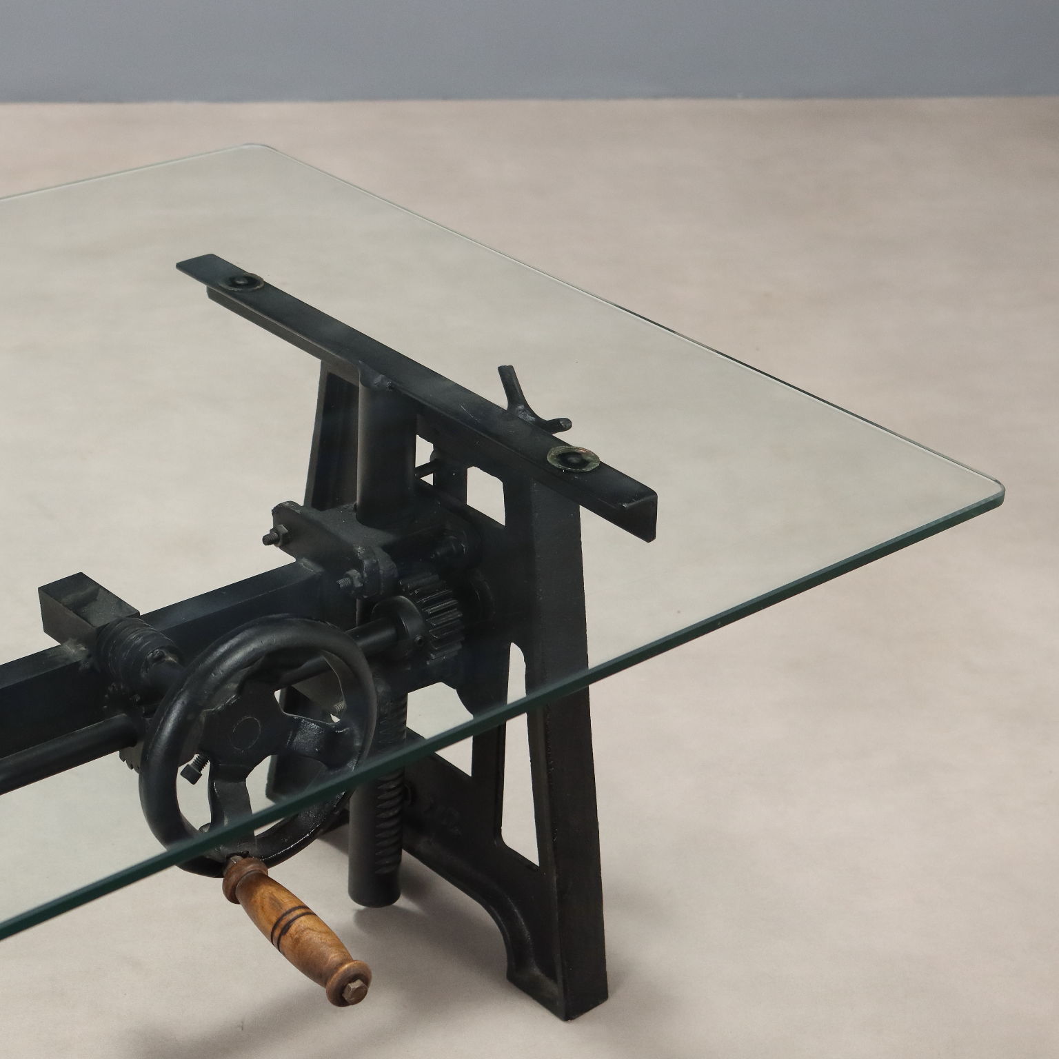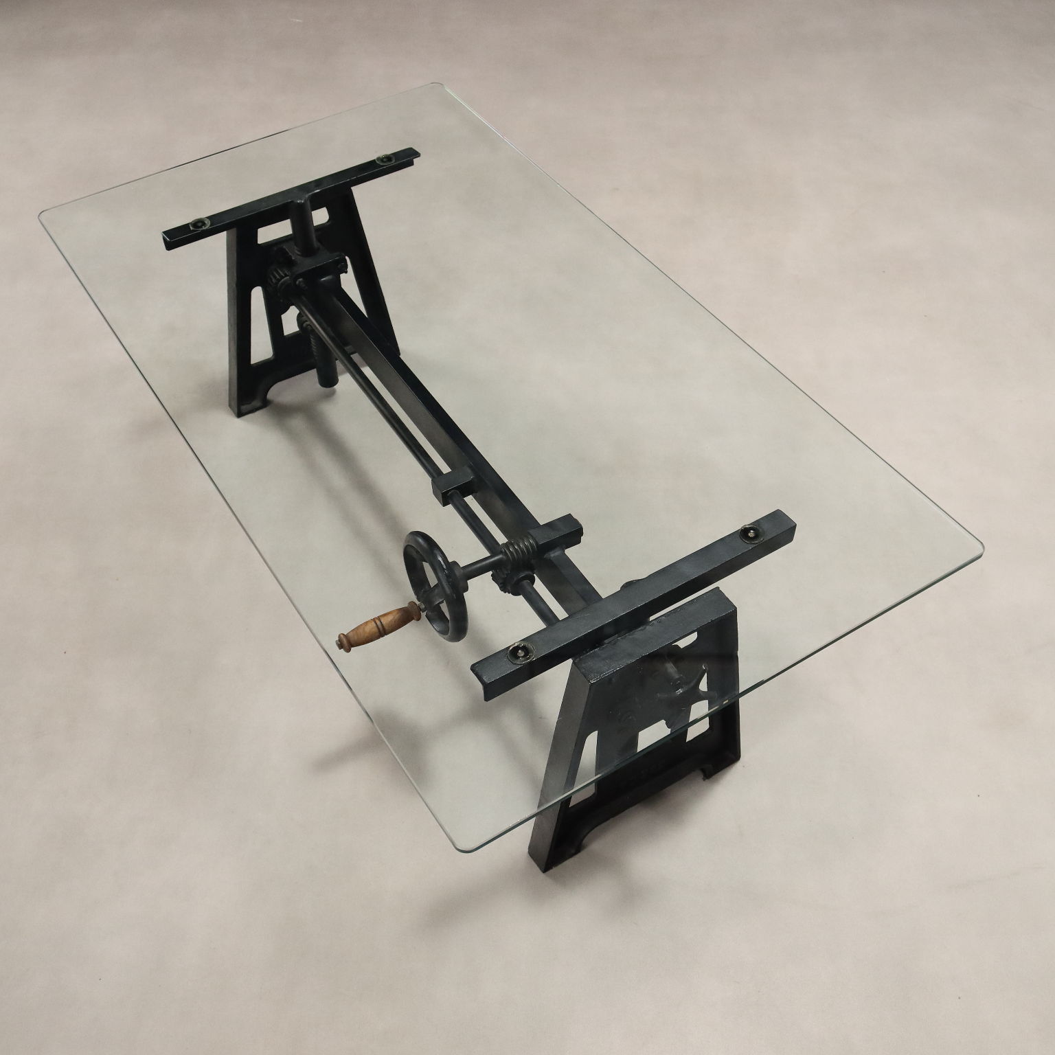 Mesa de centro de cristal, base de hierro con mecanismo de altura regulable. Italia, siglo XX.