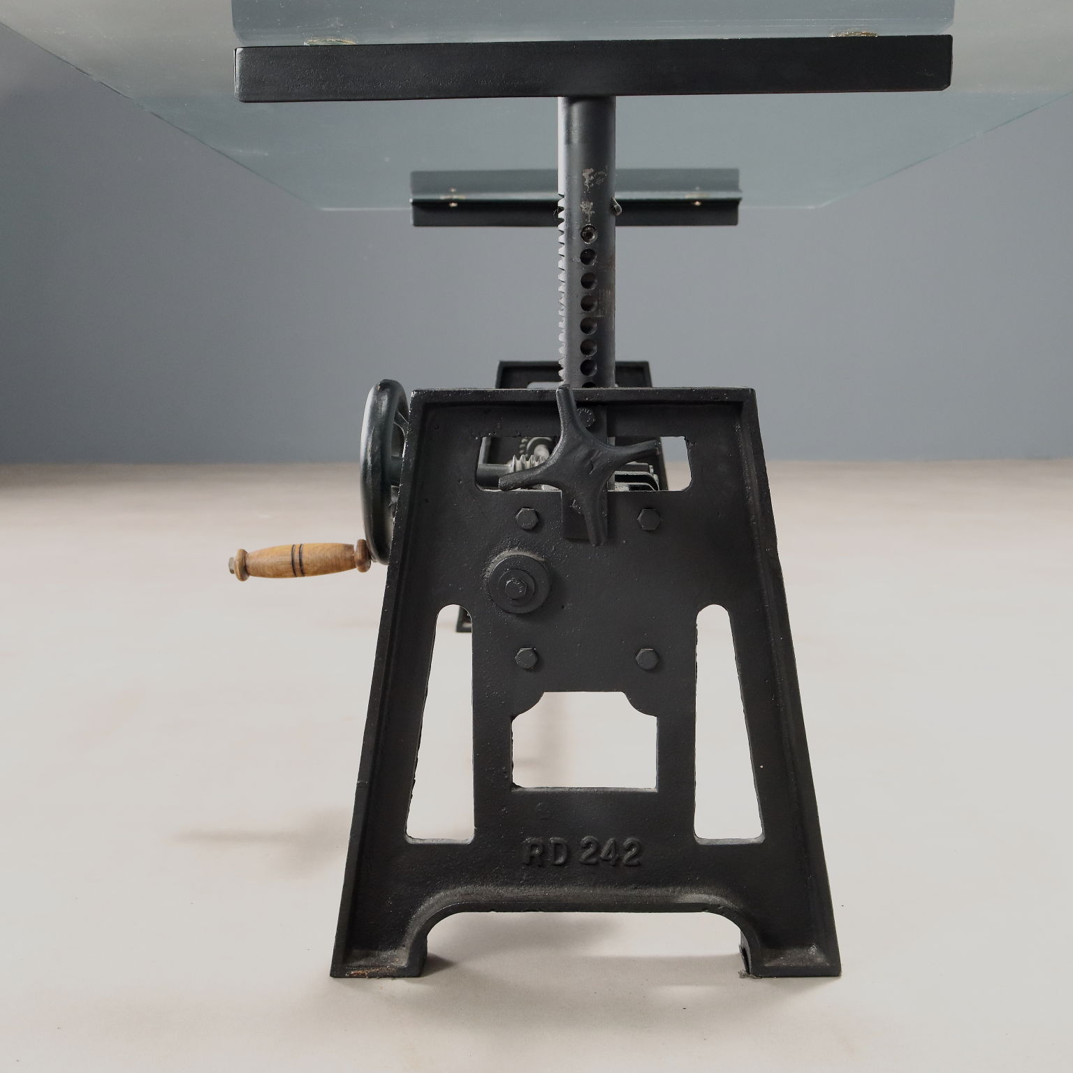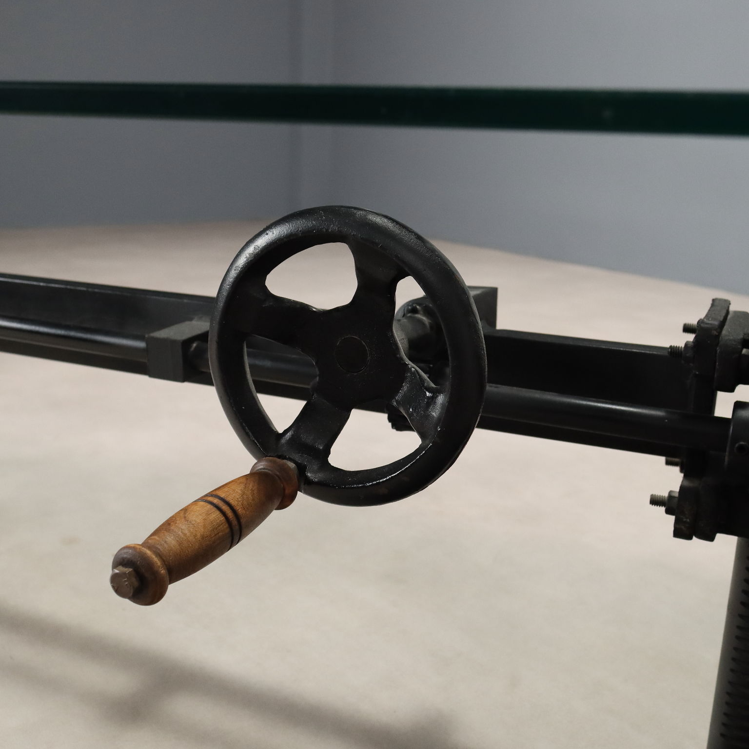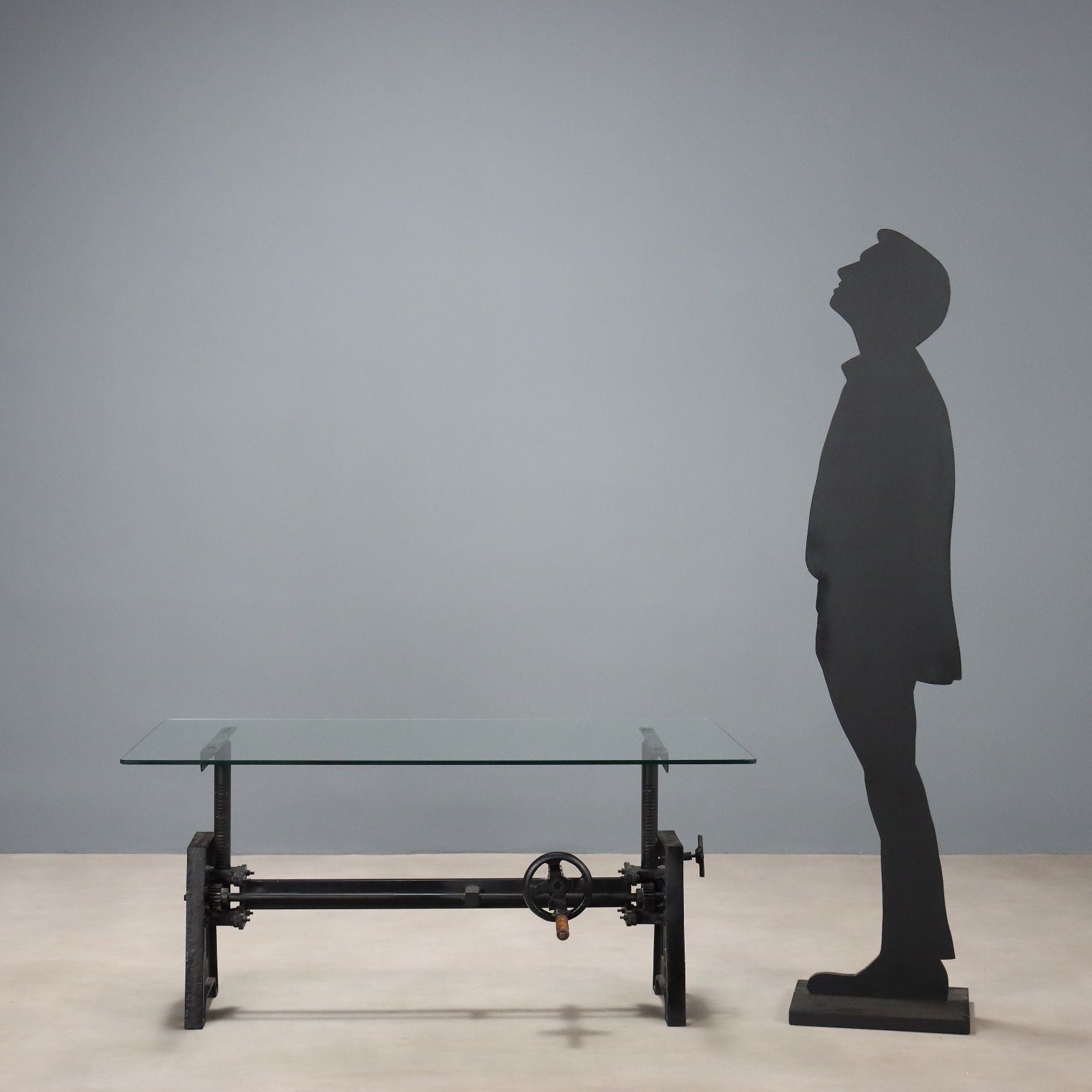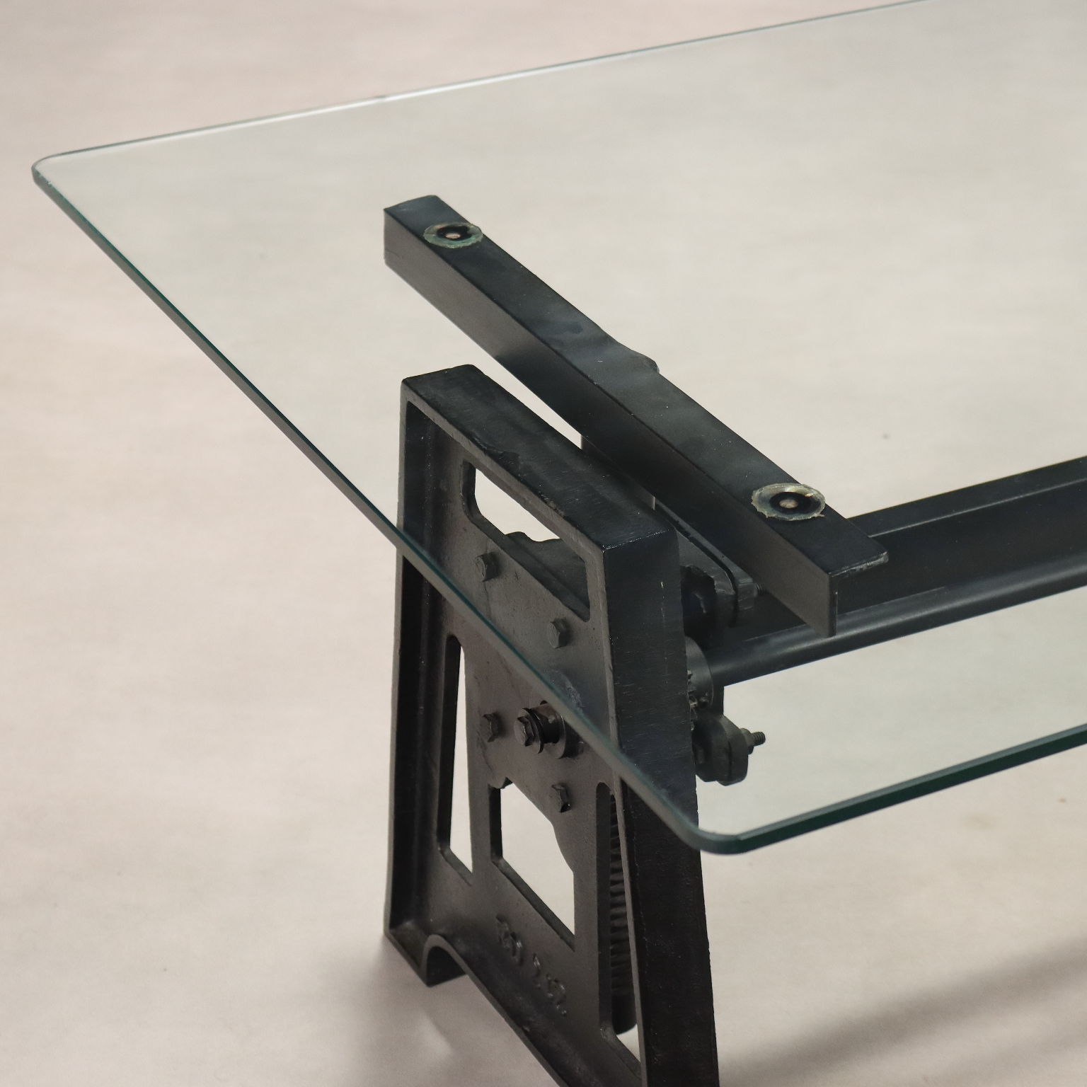 Mesa de centro de cristal, base de hierro con mecanismo de altura regulable. Italia, siglo XX.