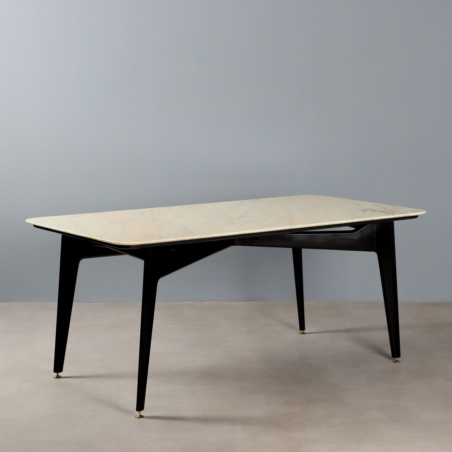 Elegante mesa de comedor de fabricación italiana con tapa rectangular de mármol y patas de madera de haya teñida de negro.