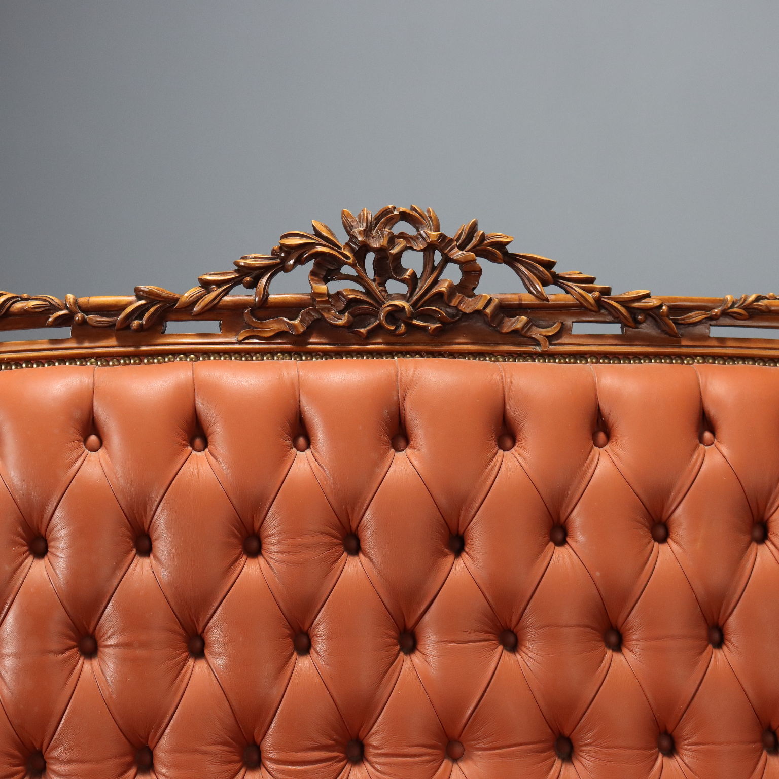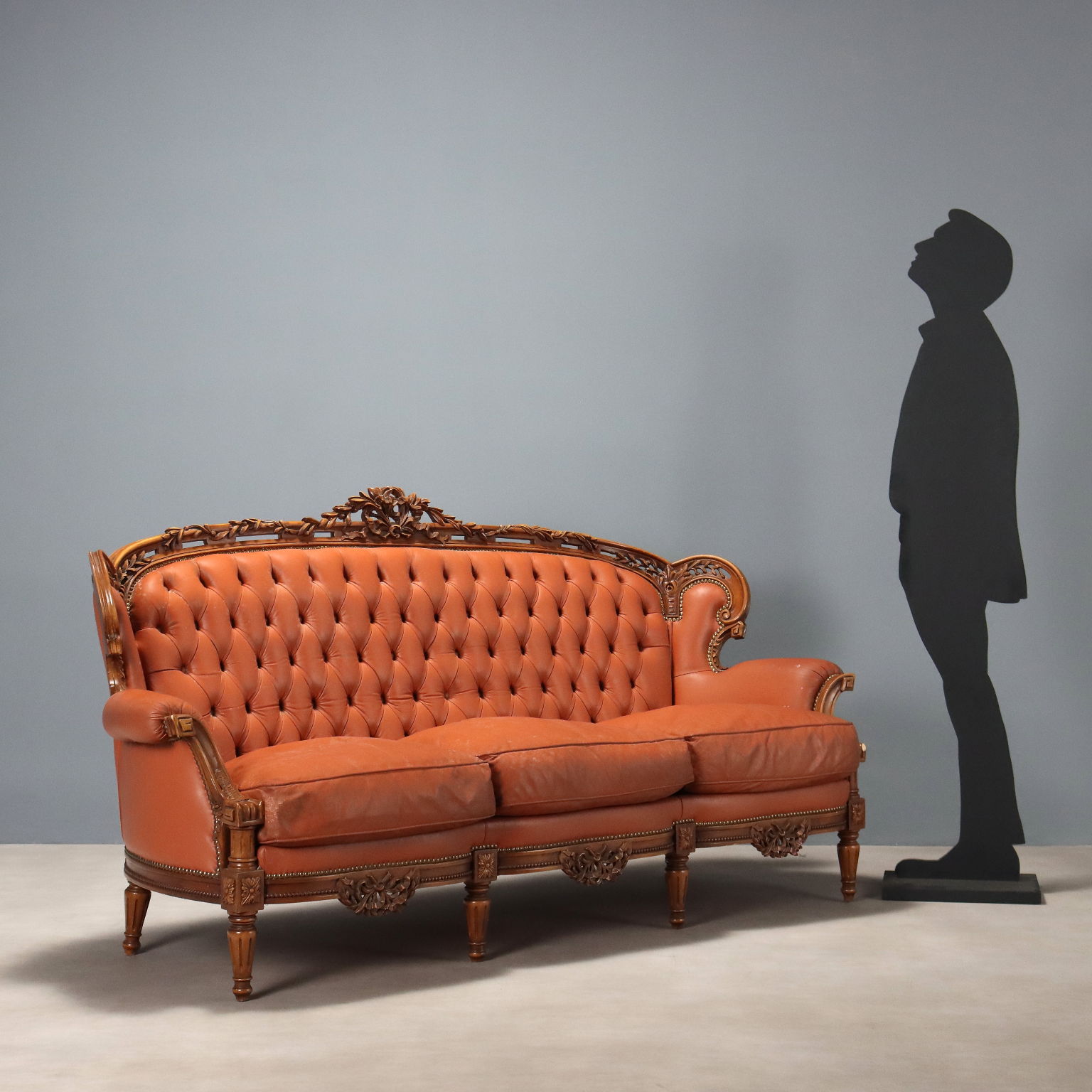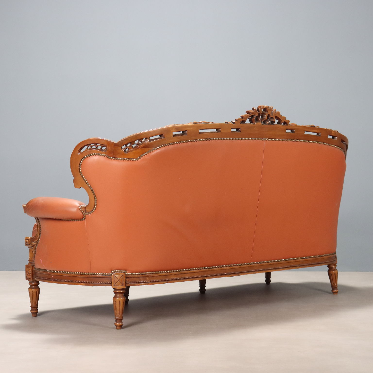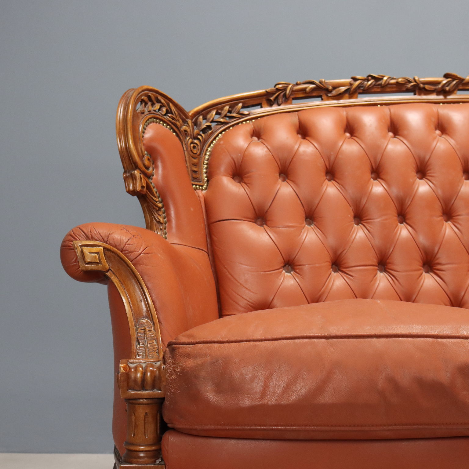 Sofá de nogal de estilo neoclásico, tallado con festones en el respaldo y el panel frontal. Respaldo capitoné, reposabrazos y asiento acolchados, patas cónicas. Italia, principios del siglo XX.