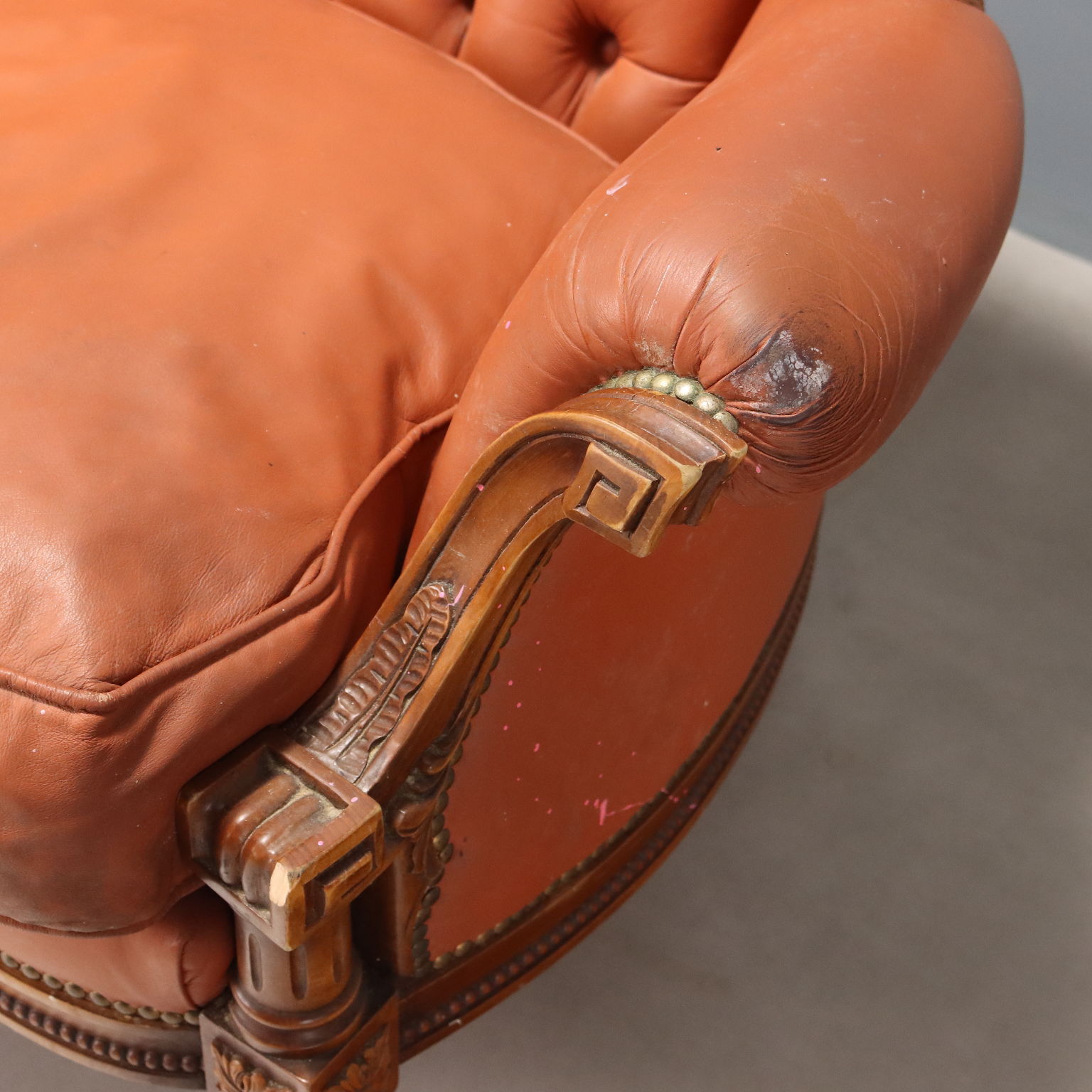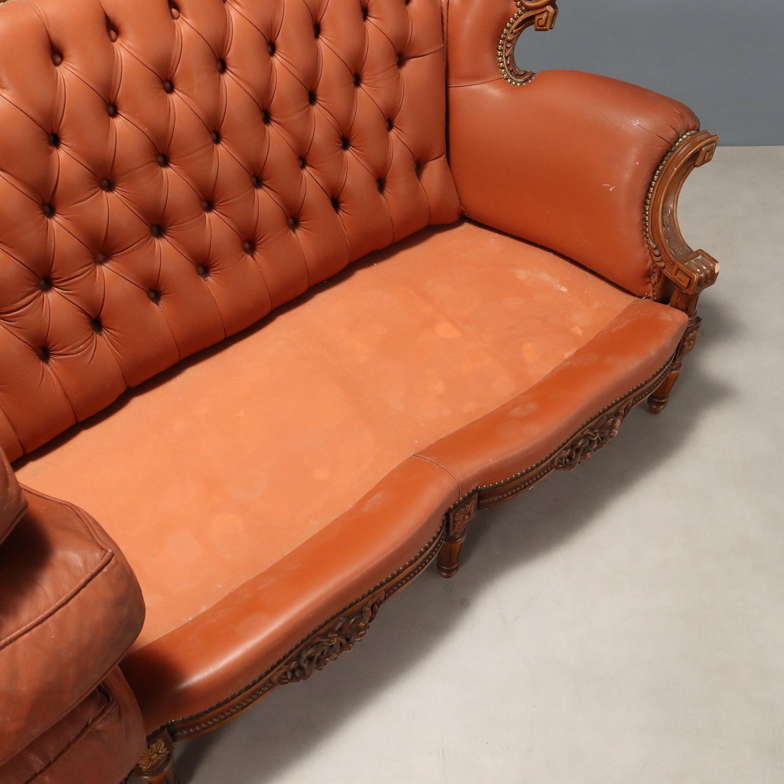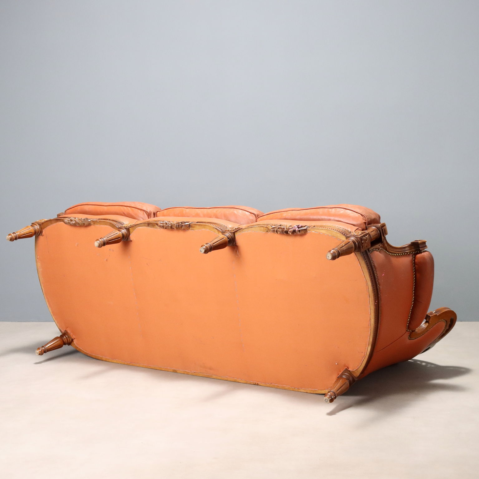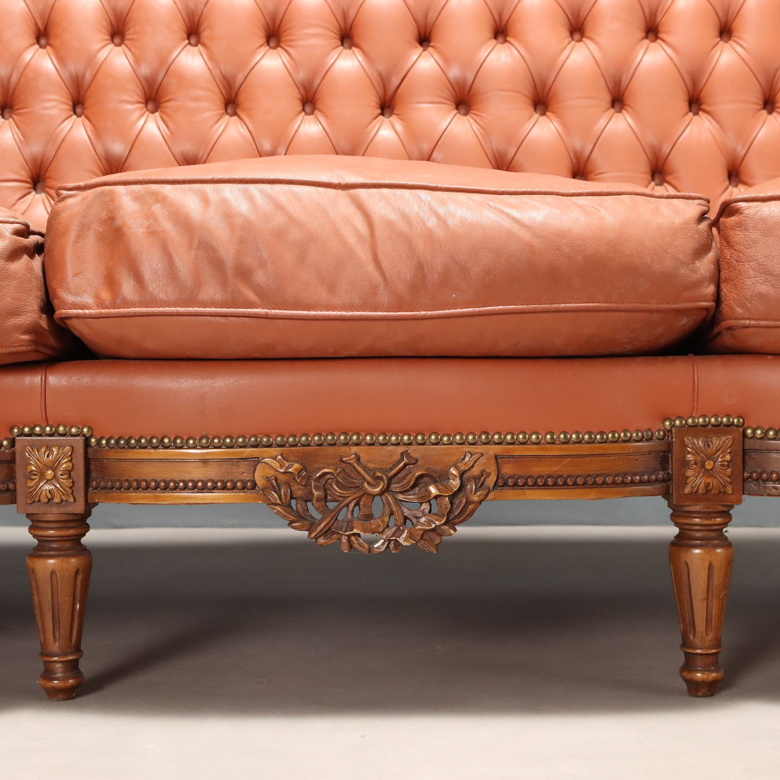 Sofá de nogal de estilo neoclásico, tallado con festones en el respaldo y el panel frontal. Respaldo capitoné, reposabrazos y asiento acolchados, patas cónicas. Italia, principios del siglo XX.