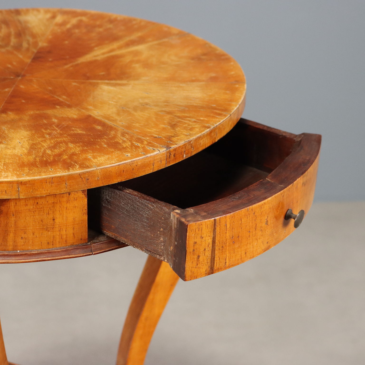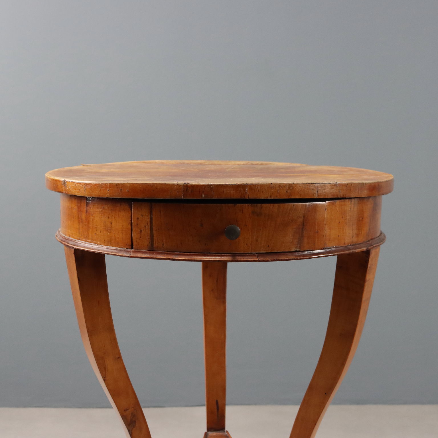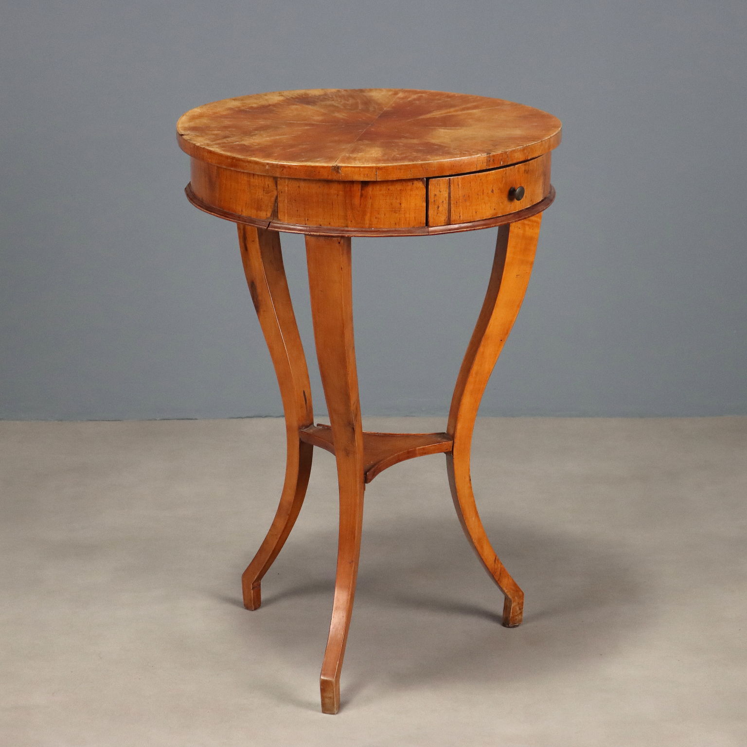 Mesa de centro de nogal. Tablero circular chapado con entrepierna de nogal, cajón en la parte inferior y tres patas curvas unidas por un estante central. Italia, siglo XIX.