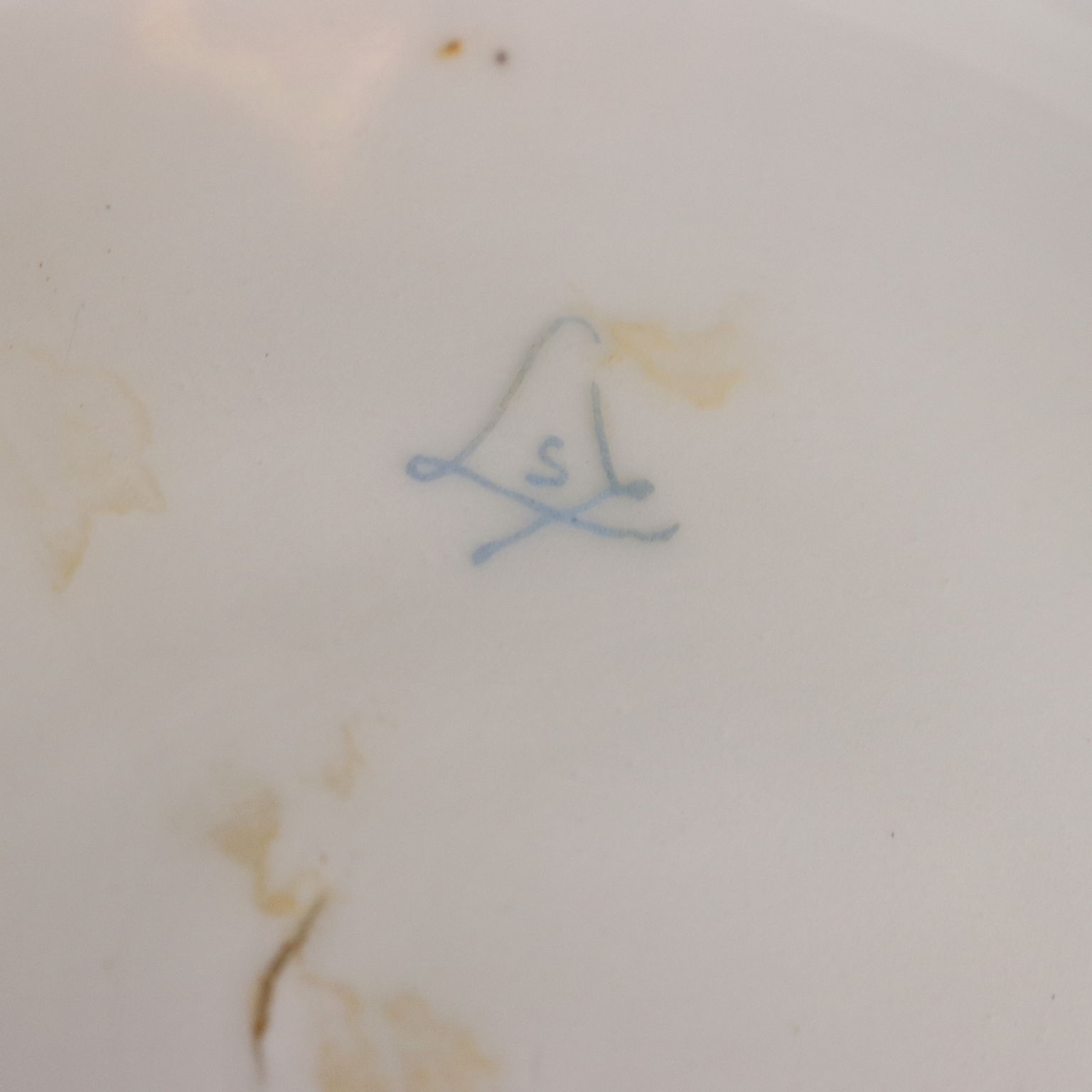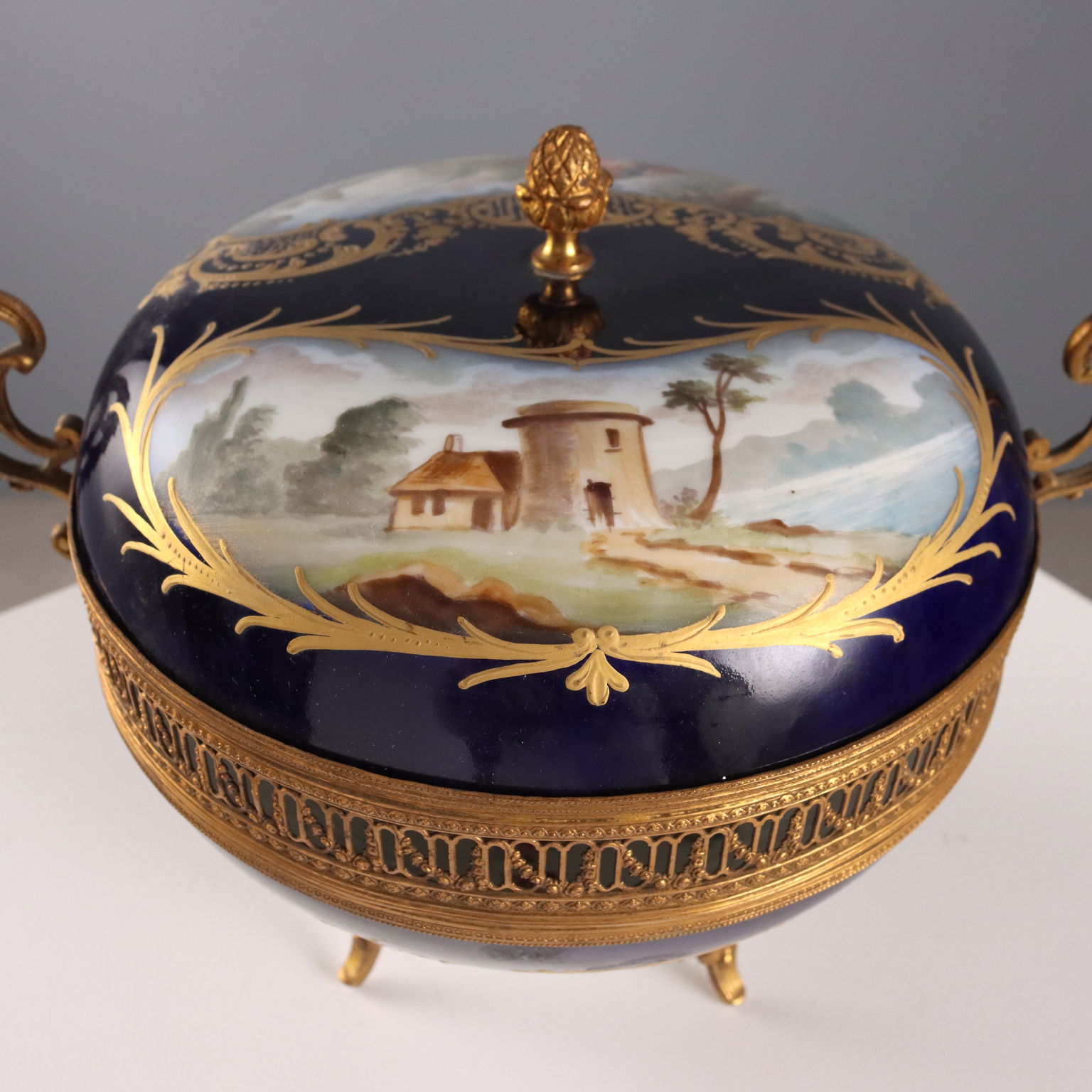 Caja de porcelana y bronce calado con patas y asas con volutas en forma de hoja. Tapa con reservas de oro que representa un paisaje lacustre y una escena romántica. Interior decorado con ramos de flores. Marca del fabricante francés bajo la base.
