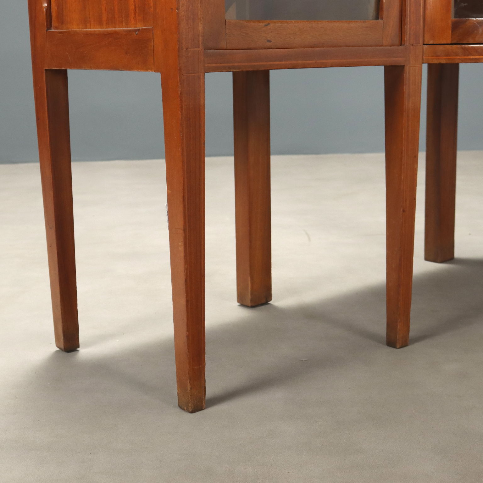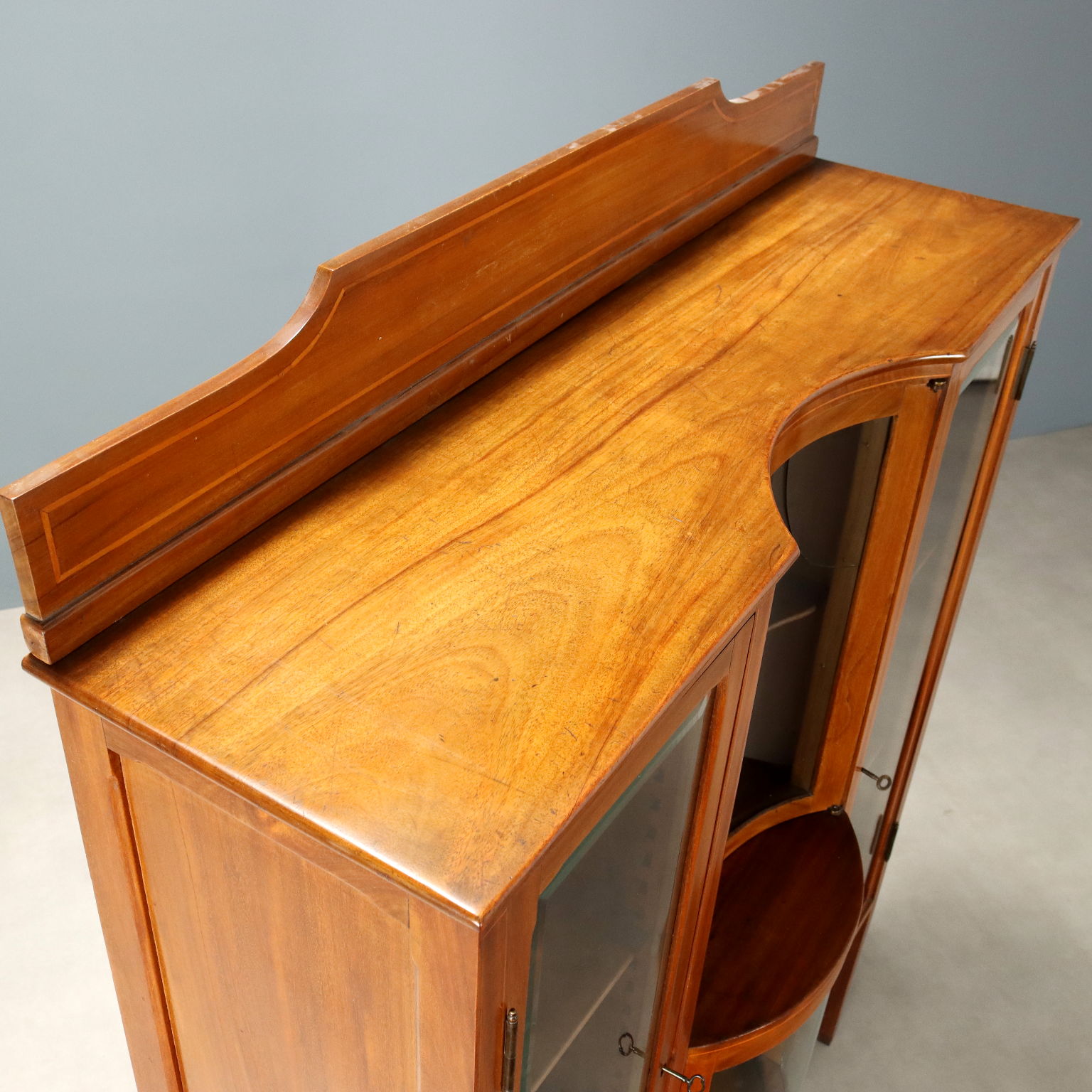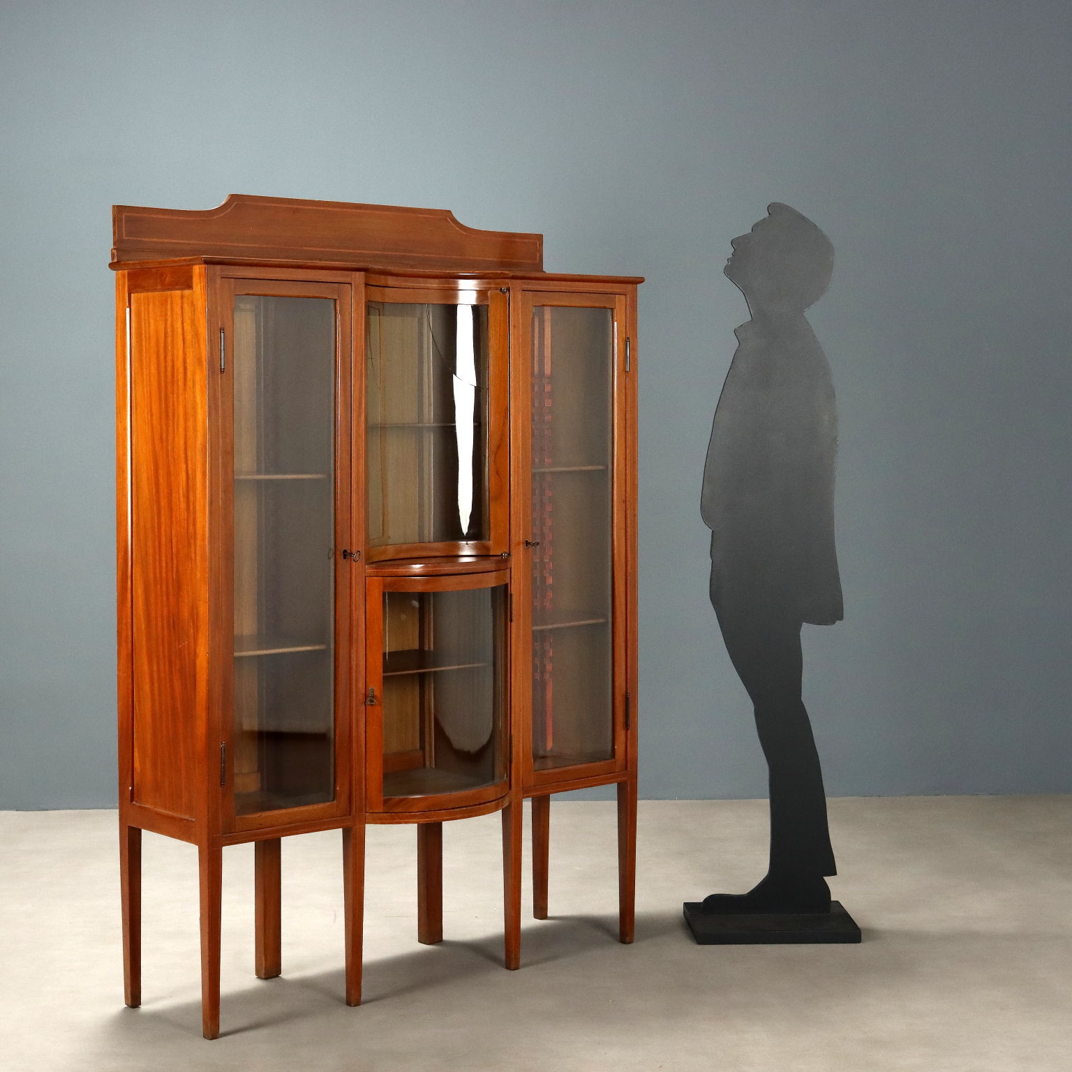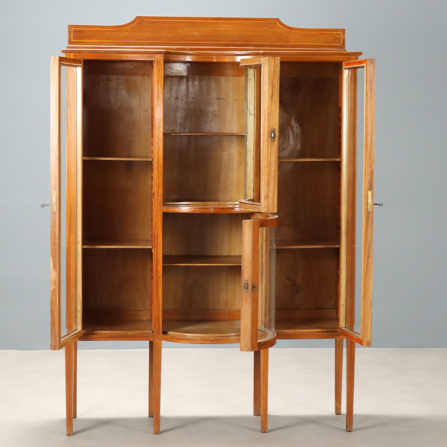 Vitrina Art Nouveau de caoba con detalles de arce. Frente con puertas laterales de vidrio biselado, elemento central compuesto por un par de puertas de vidrio curvado con movimiento contrarrotativo. Italia, finales del siglo XIX.