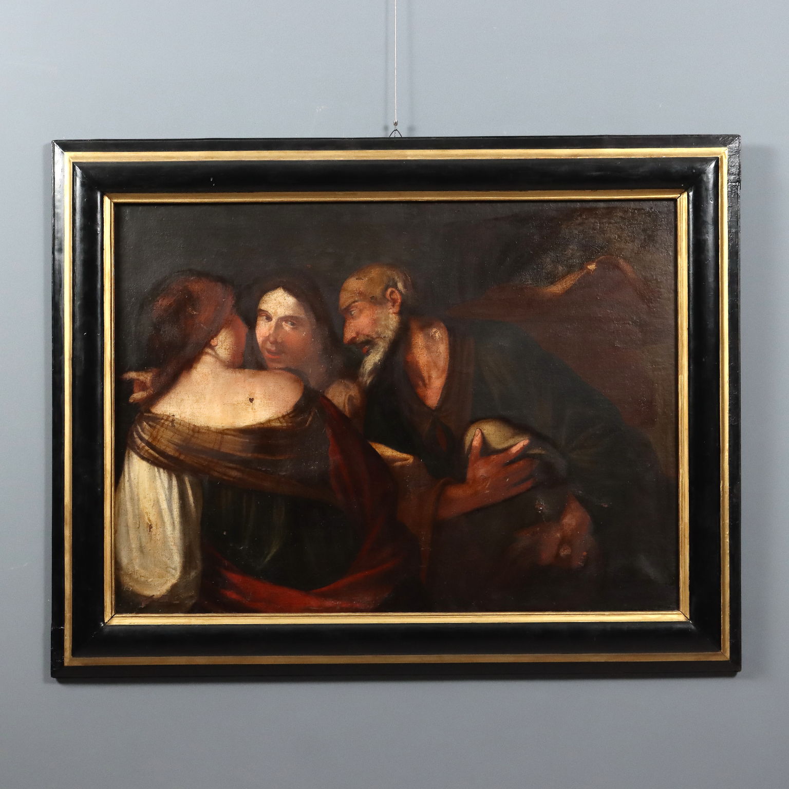 Óleo sobre lienzo. Escuela italiana del siglo XVII. El episodio del Antiguo Testamento de Lot y sus hijas ha sido ampliamente representado en pinturas, aunque en diferentes momentos de la historia. En este caso, el hombre y las dos niñas huyen de Sodoma, ciudad destruida por Dios para castigar la depravación de sus habitantes; por su rectitud, un ángel advierte a Lot que huya con su familia. Las tres figuras aparecen en primer plano, de medio cuerpo, con el padre mirando hacia adelante, instando a sus hijas a hacer lo mismo, para que no sufran el castigo divino que ya había recaído sobre su esposa, convertida en estatua de sal por desobedecer el mandato divino de no mirar atrás. El lienzo, previamente reentelado, presenta varias pérdidas de pintura, lo que requiere restauración. Se presenta en un marco de madera de principios del siglo XX.