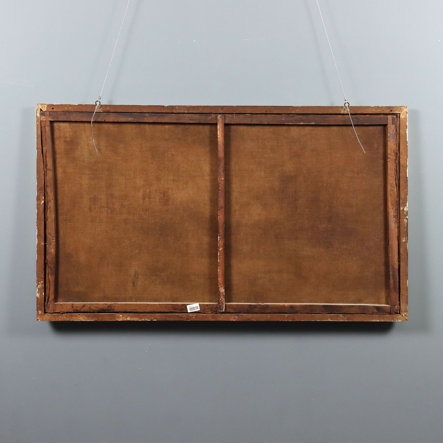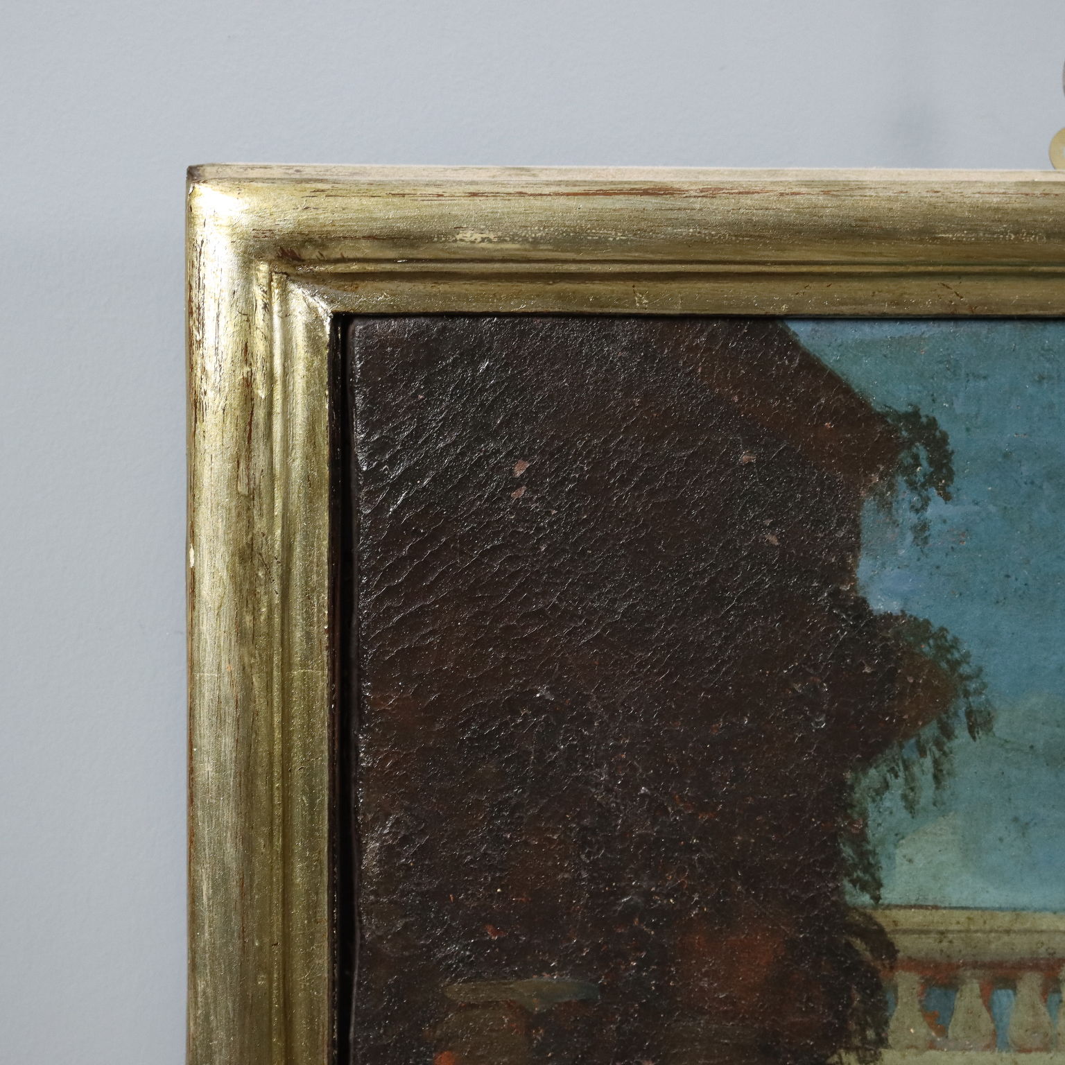 Óleo sobre lienzo. Se trata de un capricho arquitectónico clásico, un paisaje que muestra estructuras arquitectónicas, a menudo ruinas, de imponentes edificios clásicos, junto con figuras populares de la época. La pintura se conserva sobre su lienzo original y se presenta enmarcada en un marco de época.