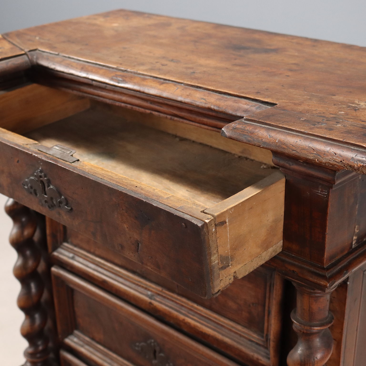 Mesita de noche barroca de nogal. Frente de cuatro cajones, el primero bajo el tablero, y dos columnas retorcidas que descansan sobre patas de ménsula. Interior de álamo.