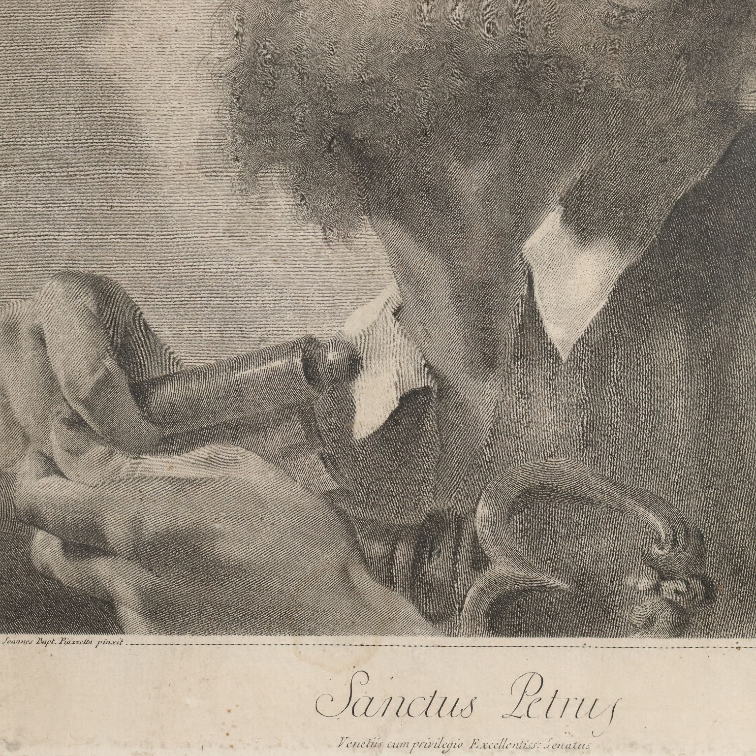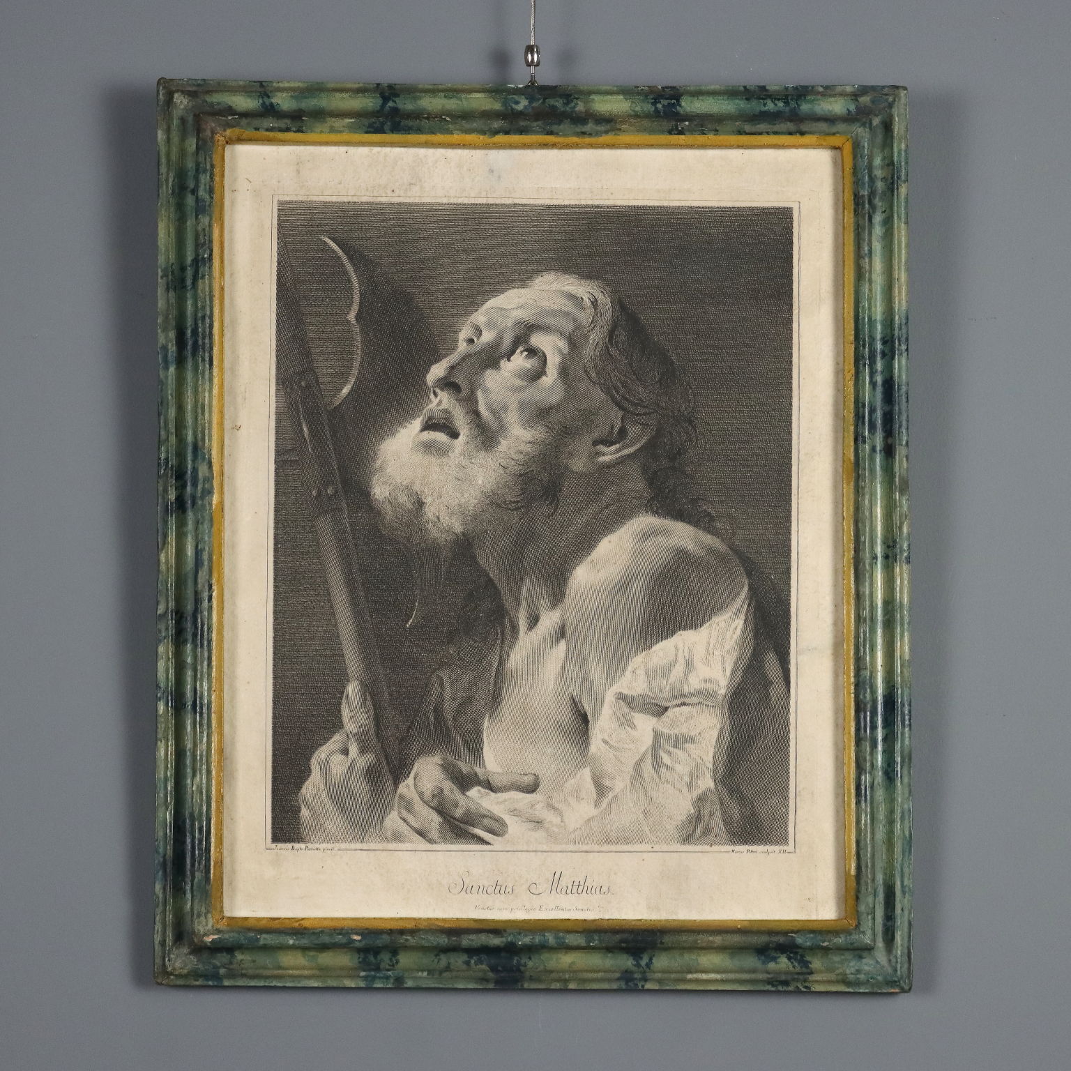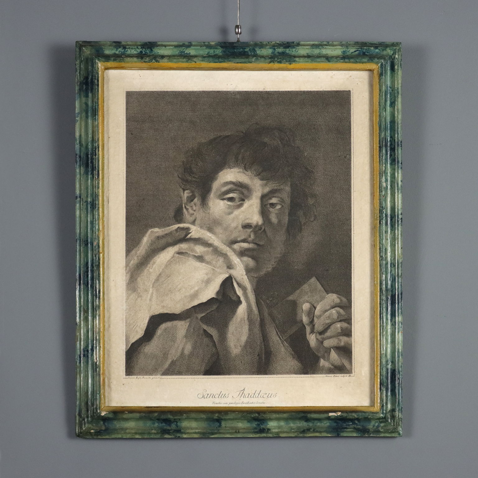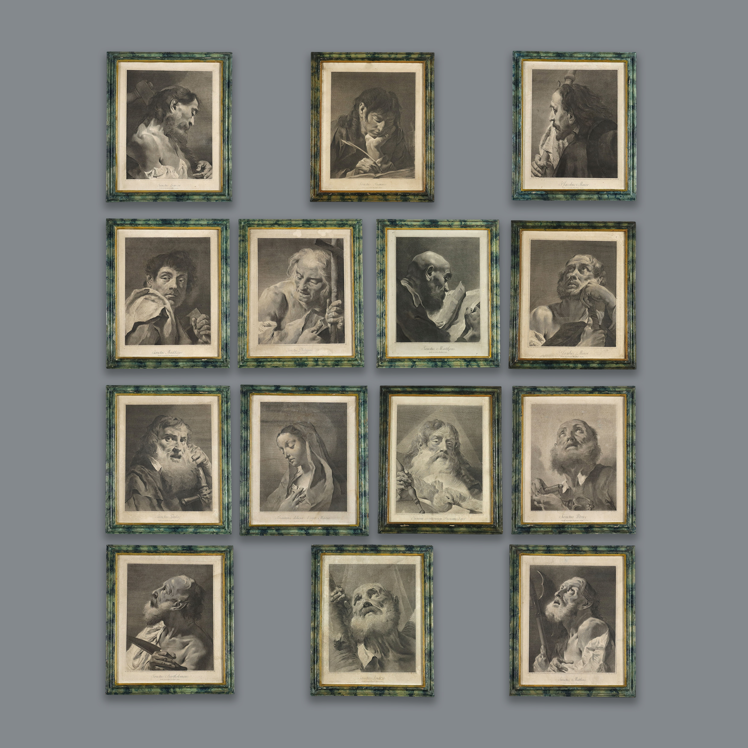Grabados. Los nombres del grabador y del pintor aparecen en la parte inferior. La serie, basada en dibujos de Giovanni Battista Piazzetta (1682-1754), incluía quince grabados y se titulaba "Los Doce Apóstoles u Obra pintada por Giambattista Piazzetta (1683-1754) grabada por Marco Pitteri Veneto con Privilegio del Excelentísimo Senado". A los once apóstoles (excluyendo al traidor Judas) se unían el rostro de María, la imagen del Padre con el Espíritu Santo y San Pablo. Esta serie carece de la representación de Cristo. Los grabados presentan manchas y marcas de agua. Se presentan en marcos de madera lacada del siglo XVIII con cristal contemporáneo.