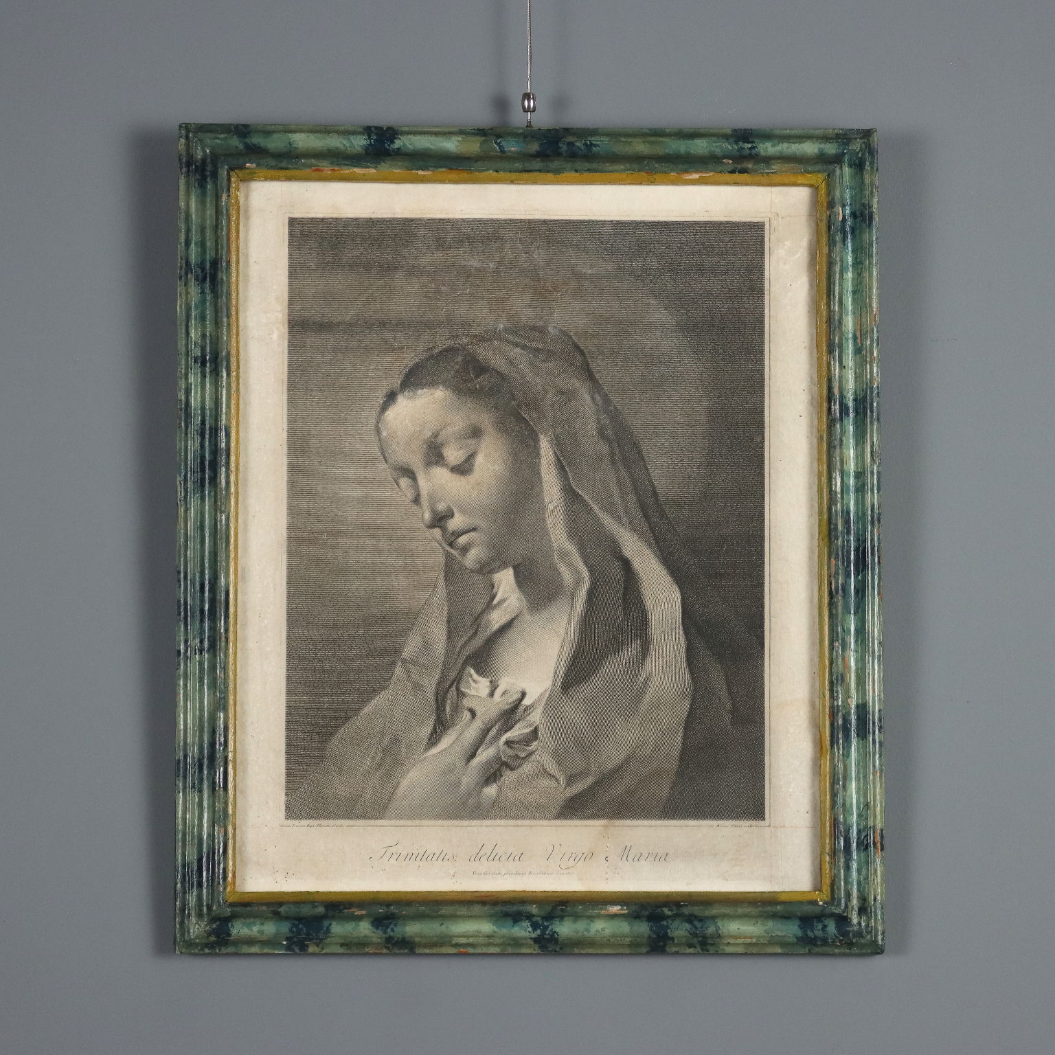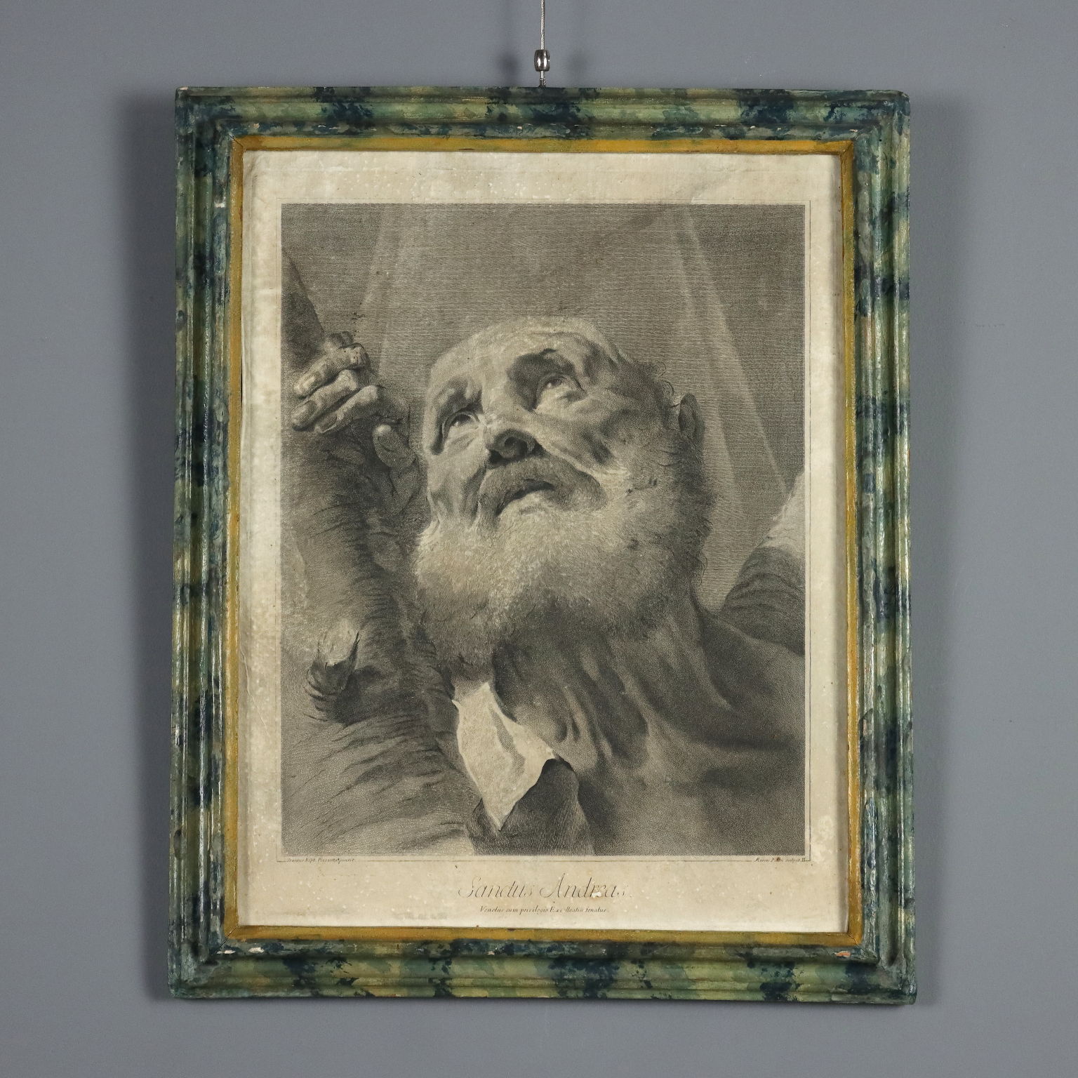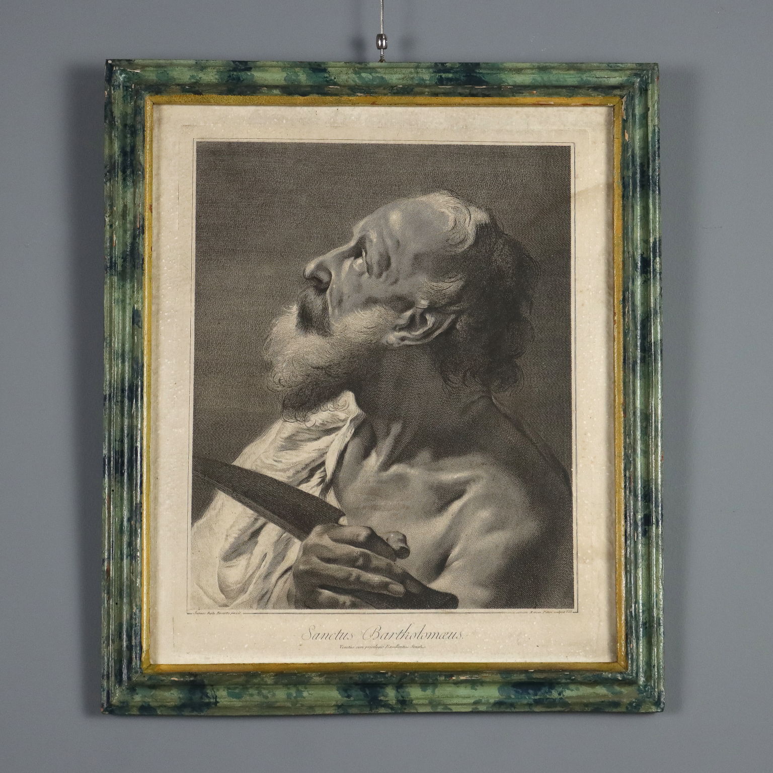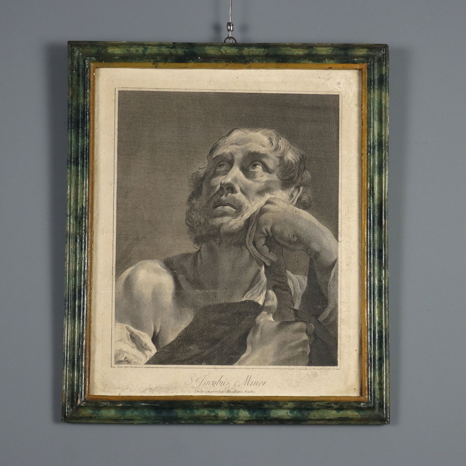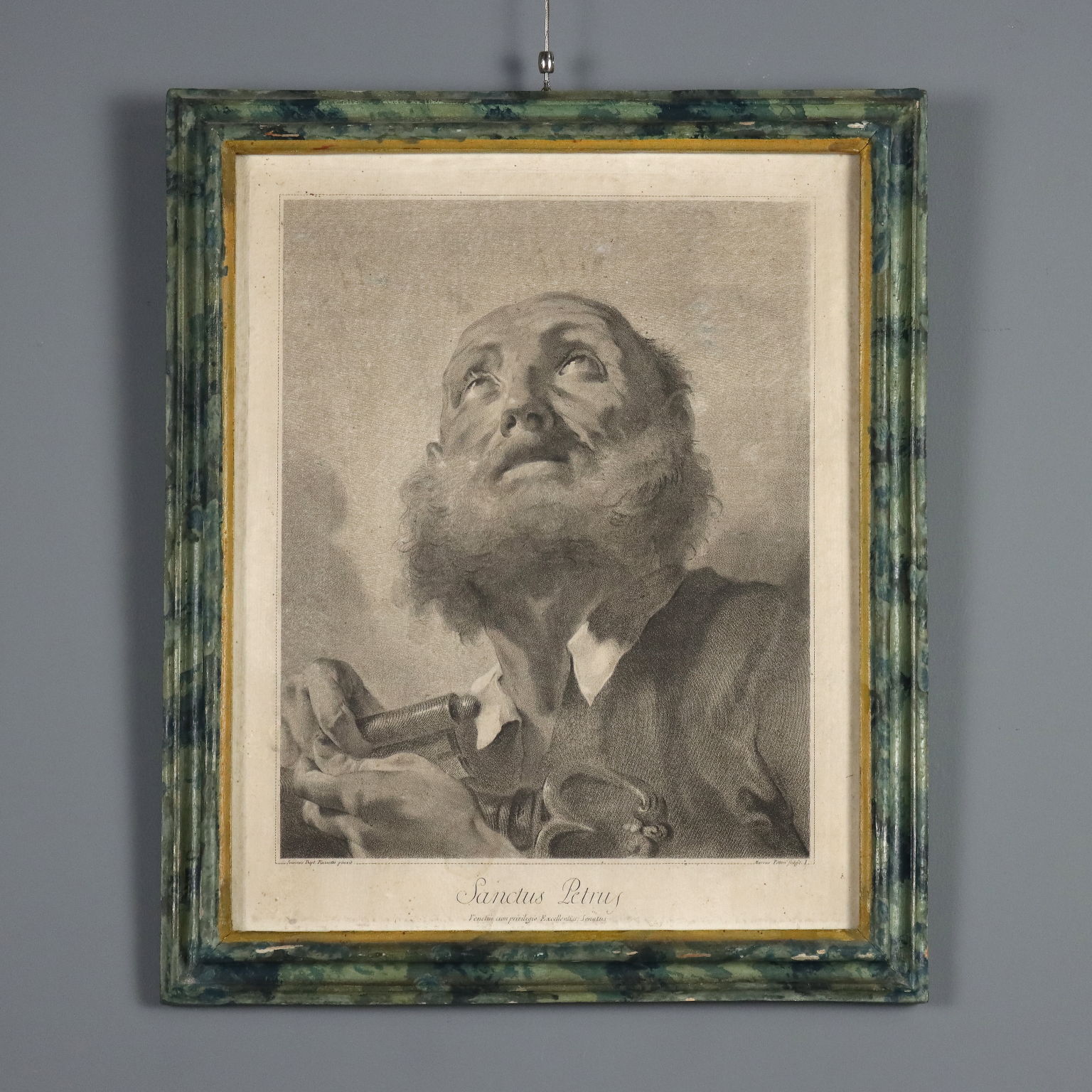 Grabados. Los nombres del grabador y del pintor aparecen en la parte inferior. La serie, basada en dibujos de Giovanni Battista Piazzetta (1682-1754), incluía quince grabados y se titulaba "Los Doce Apóstoles u Obra pintada por Giambattista Piazzetta (1683-1754) grabada por Marco Pitteri Veneto con Privilegio del Excelentísimo Senado". A los once apóstoles (excluyendo al traidor Judas) se unían el rostro de María, la imagen del Padre con el Espíritu Santo y San Pablo. Esta serie carece de la representación de Cristo. Los grabados presentan manchas y marcas de agua. Se presentan en marcos de madera lacada del siglo XVIII con cristal contemporáneo.