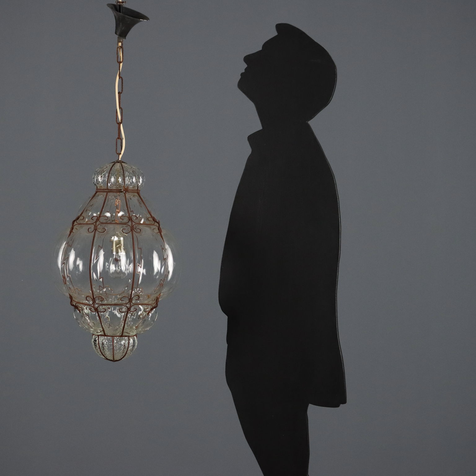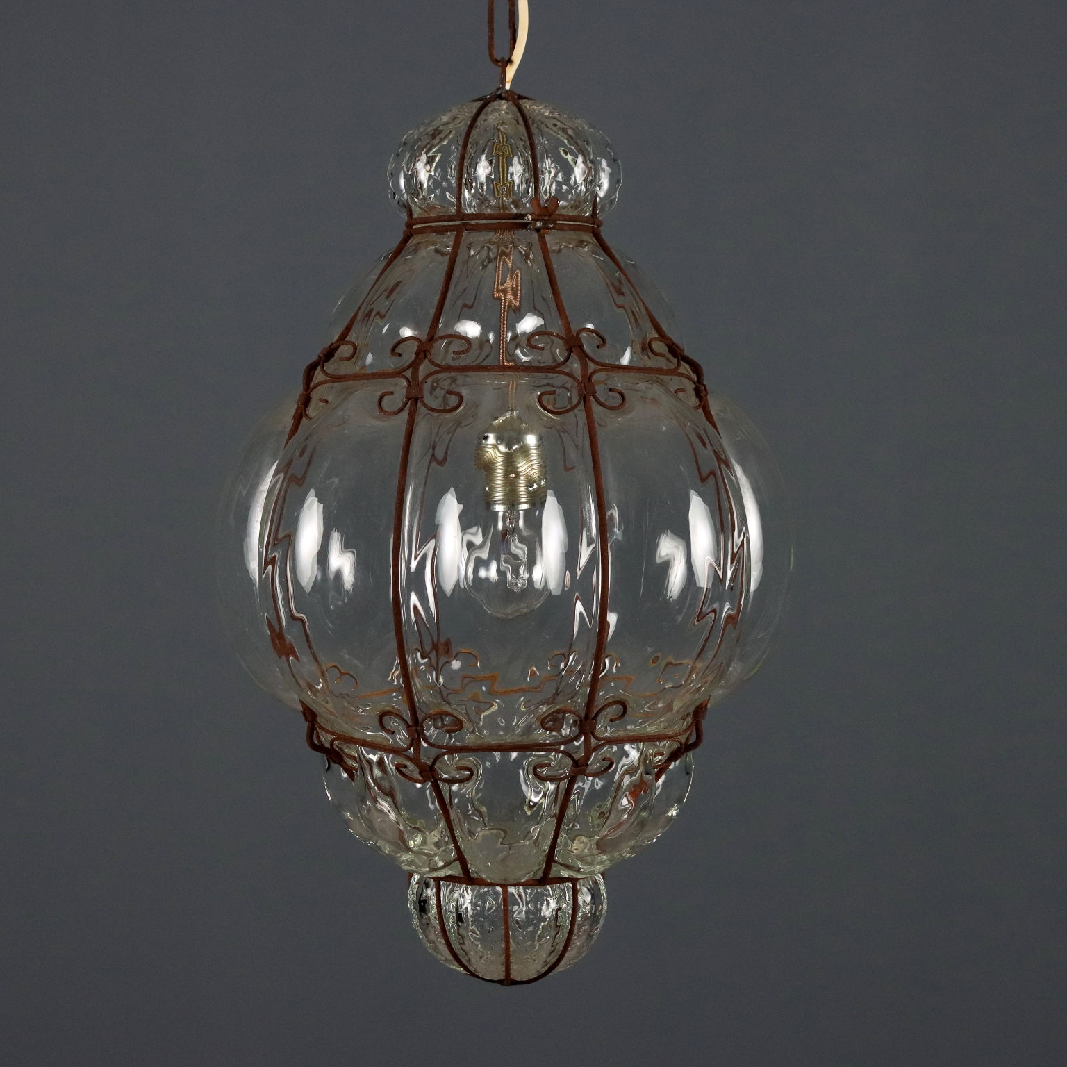 Lámpara de araña tipo farol de cristal soplado transparente. La copa de cristal está soplada sobre una estructura de hierro forjado. Una luz central. Italia, principios del siglo XX.