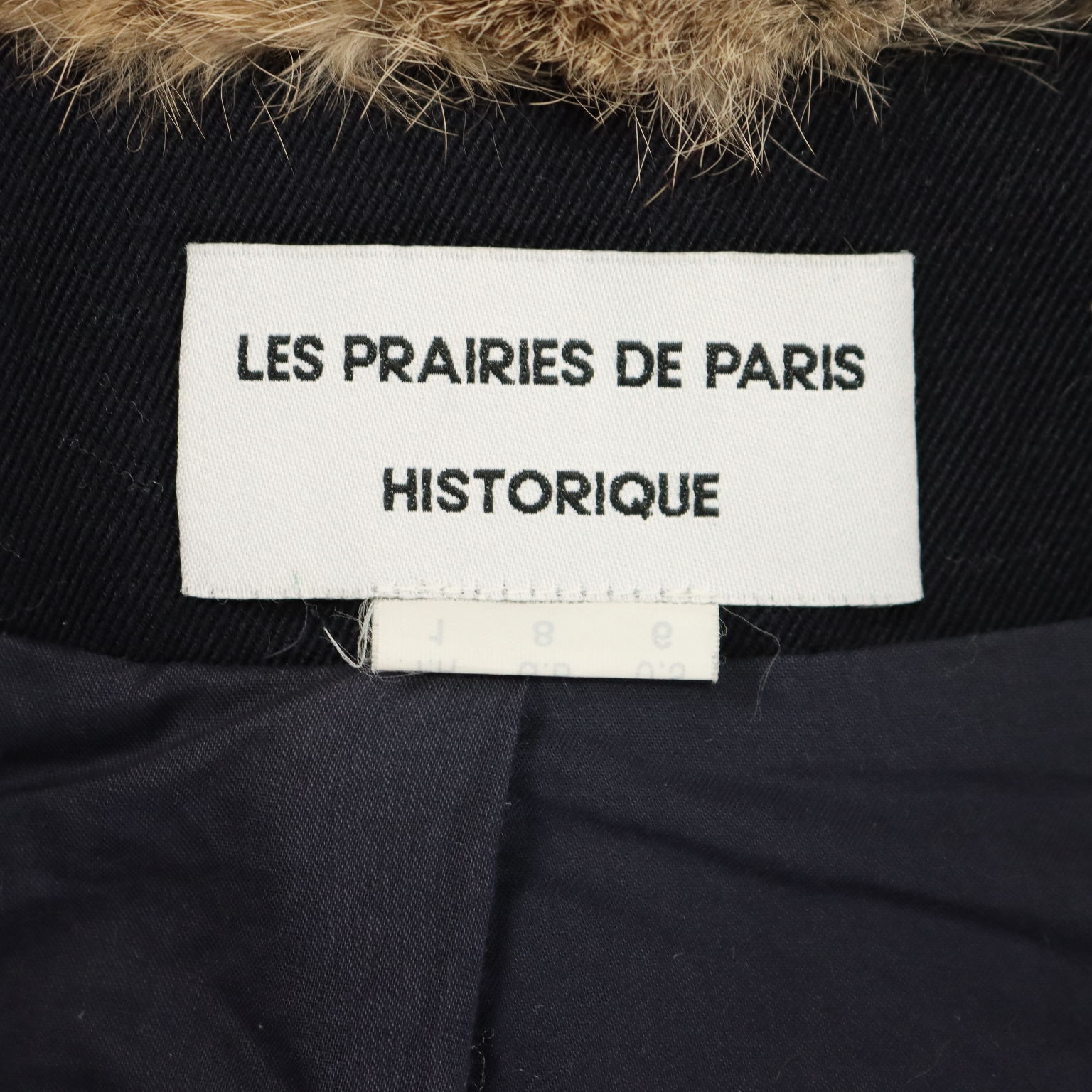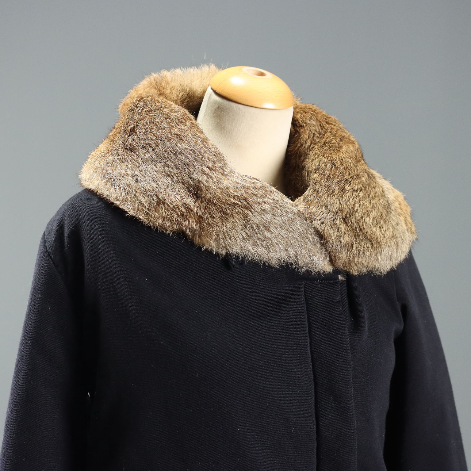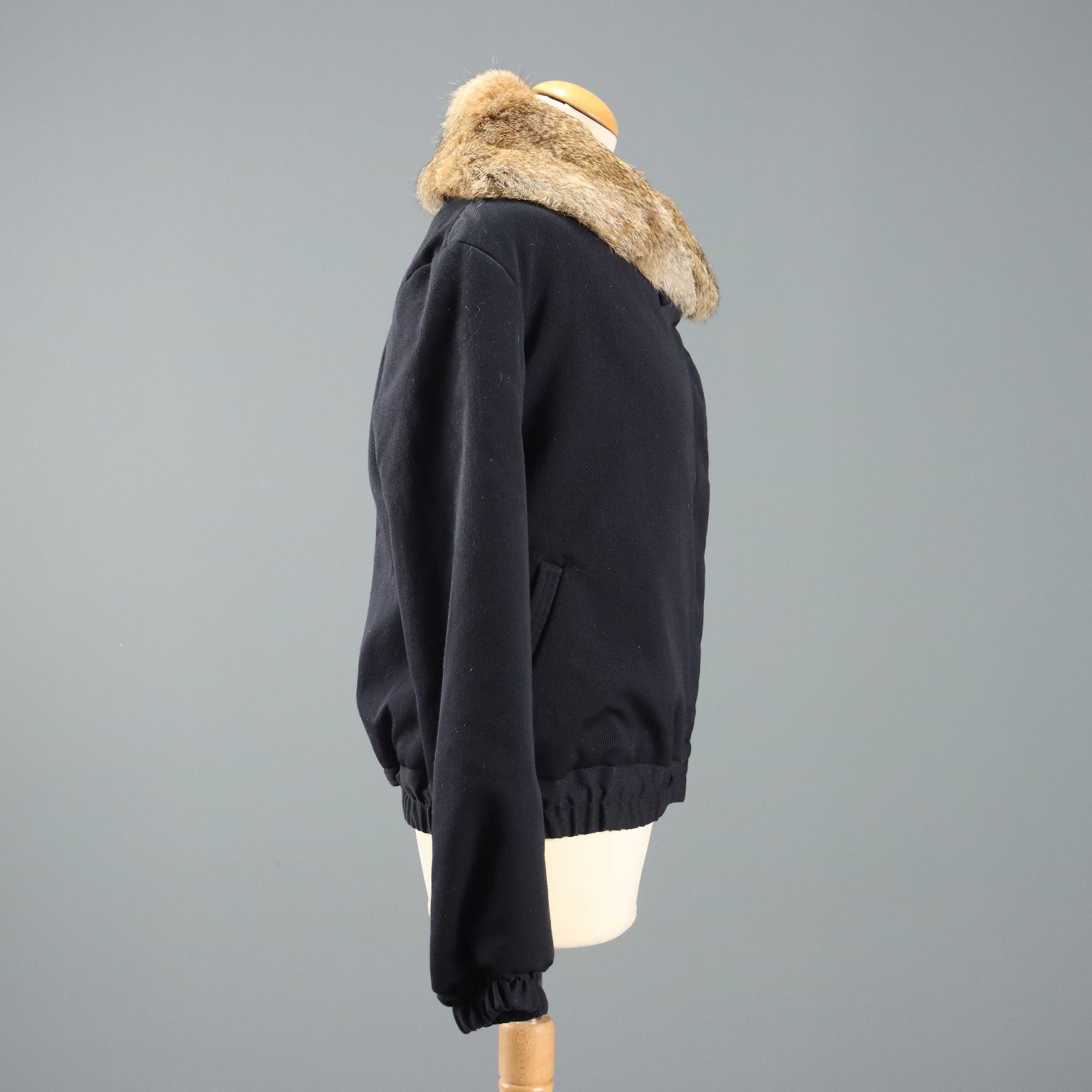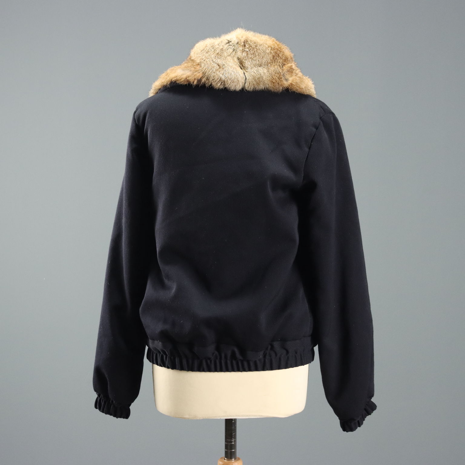 Chaqueta de mezcla de lana azul medianoche con botonadura oculta, dos bolsillos insertados y cuello de piel. Talla M; la etiqueta indica talla 1 francesa y talla 6 estadounidense. A continuación se muestran algunas medidas. Largo de manga: 64 cm. Sisa: 51 cm. Ancho de hombros: 40 cm. Pecho: 48 cm.