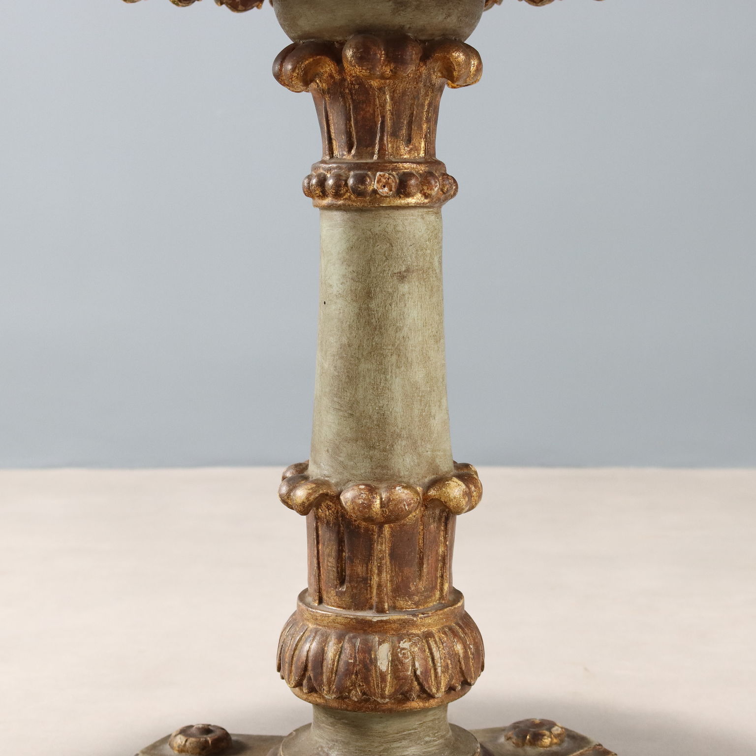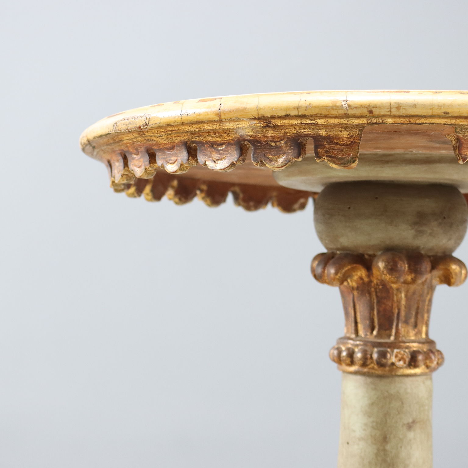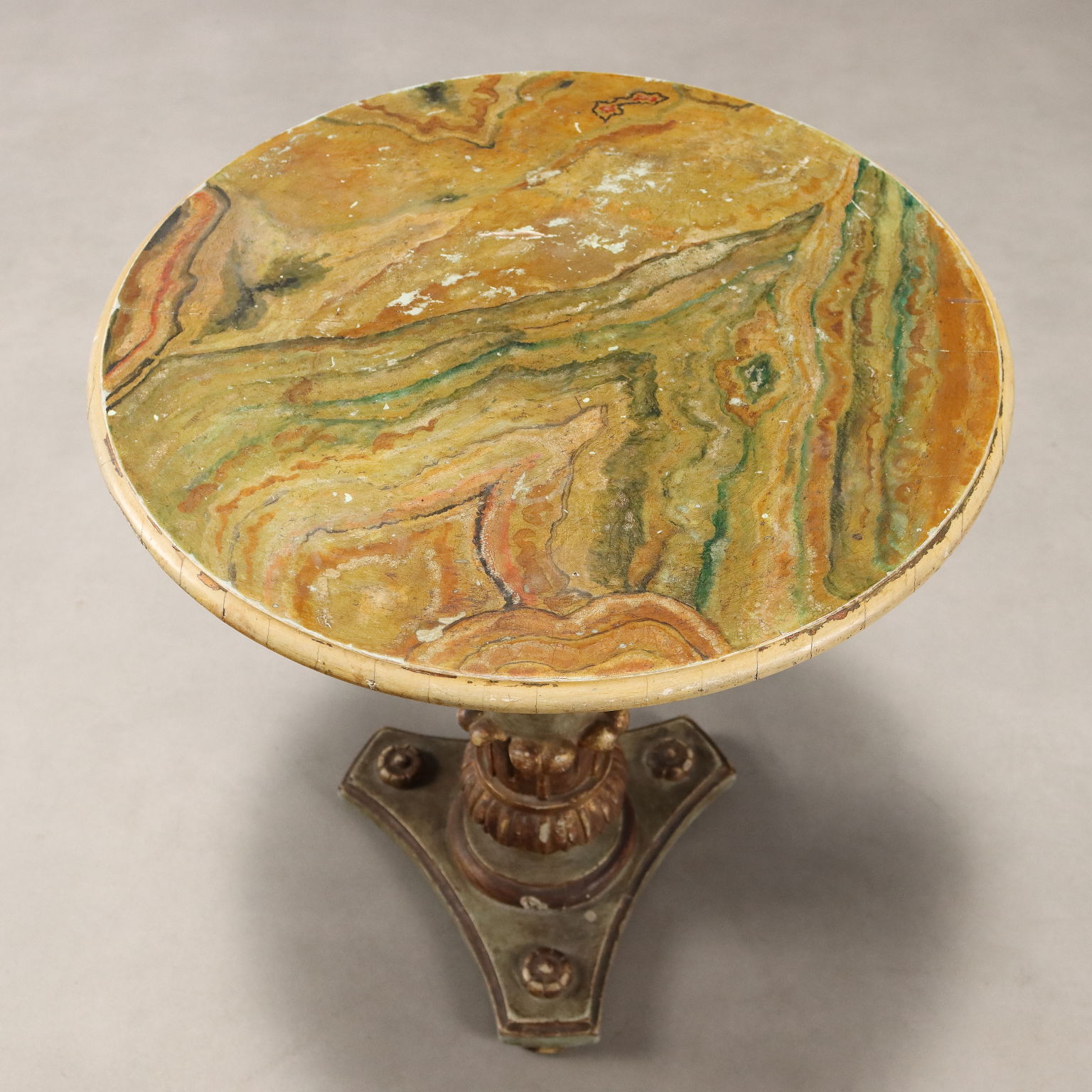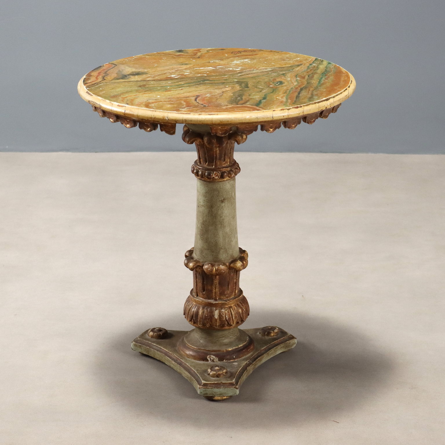 Mesa de centro de madera lacada. Tablero redondo con acabado imitación mármol, sostenido por una pata torneada y tallada que descansa sobre una base perfilada con tallas doradas. Italia, principios del siglo XX.