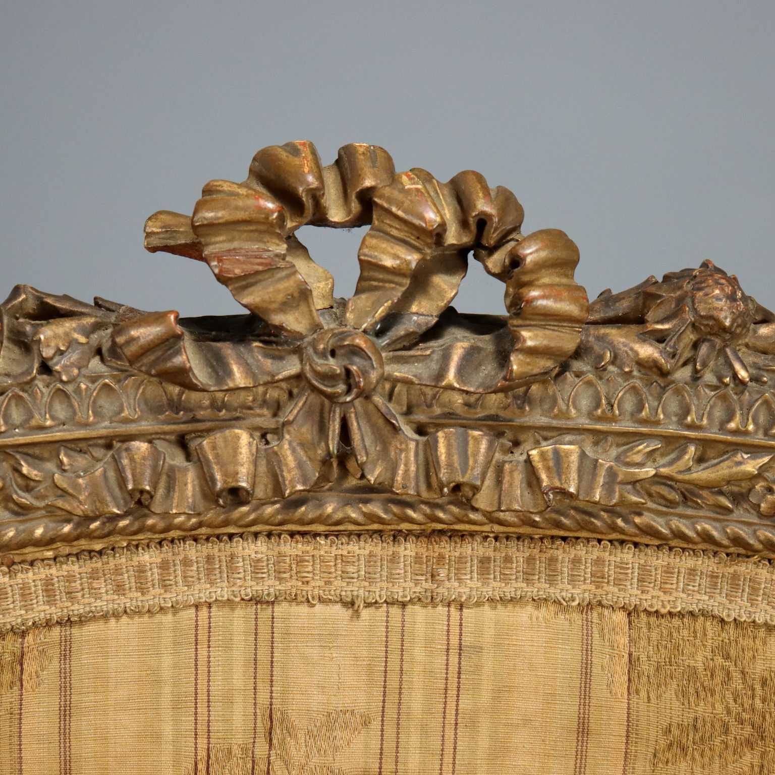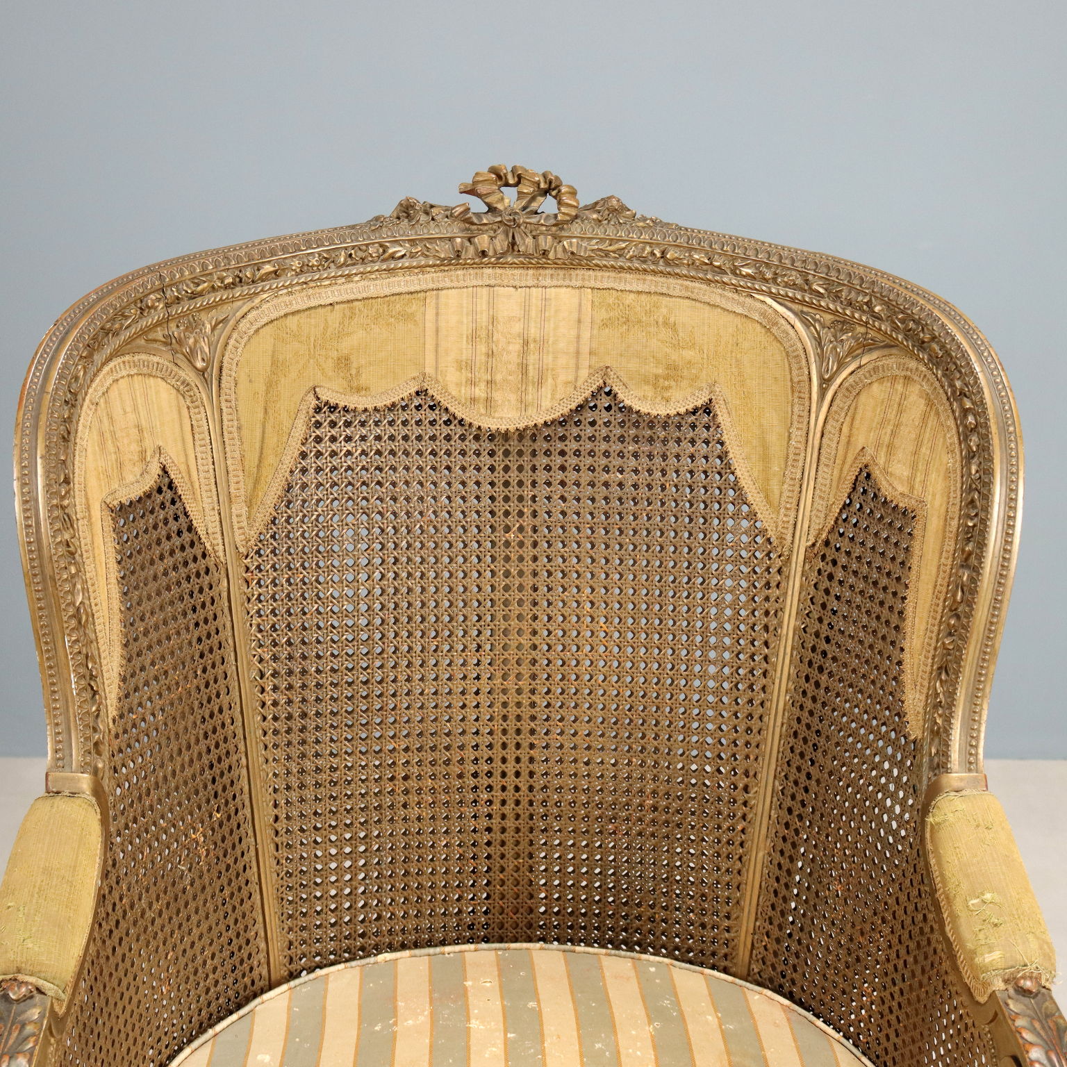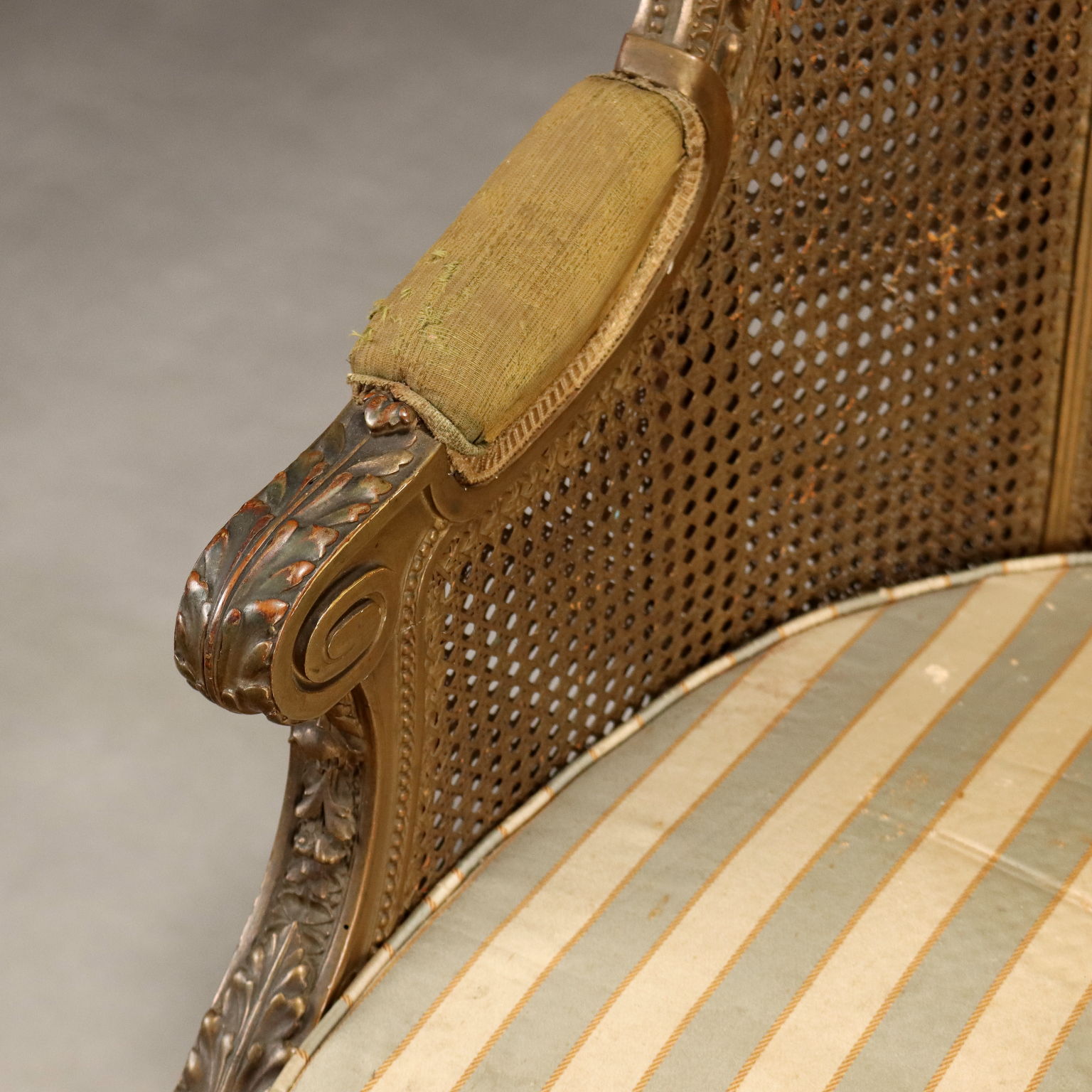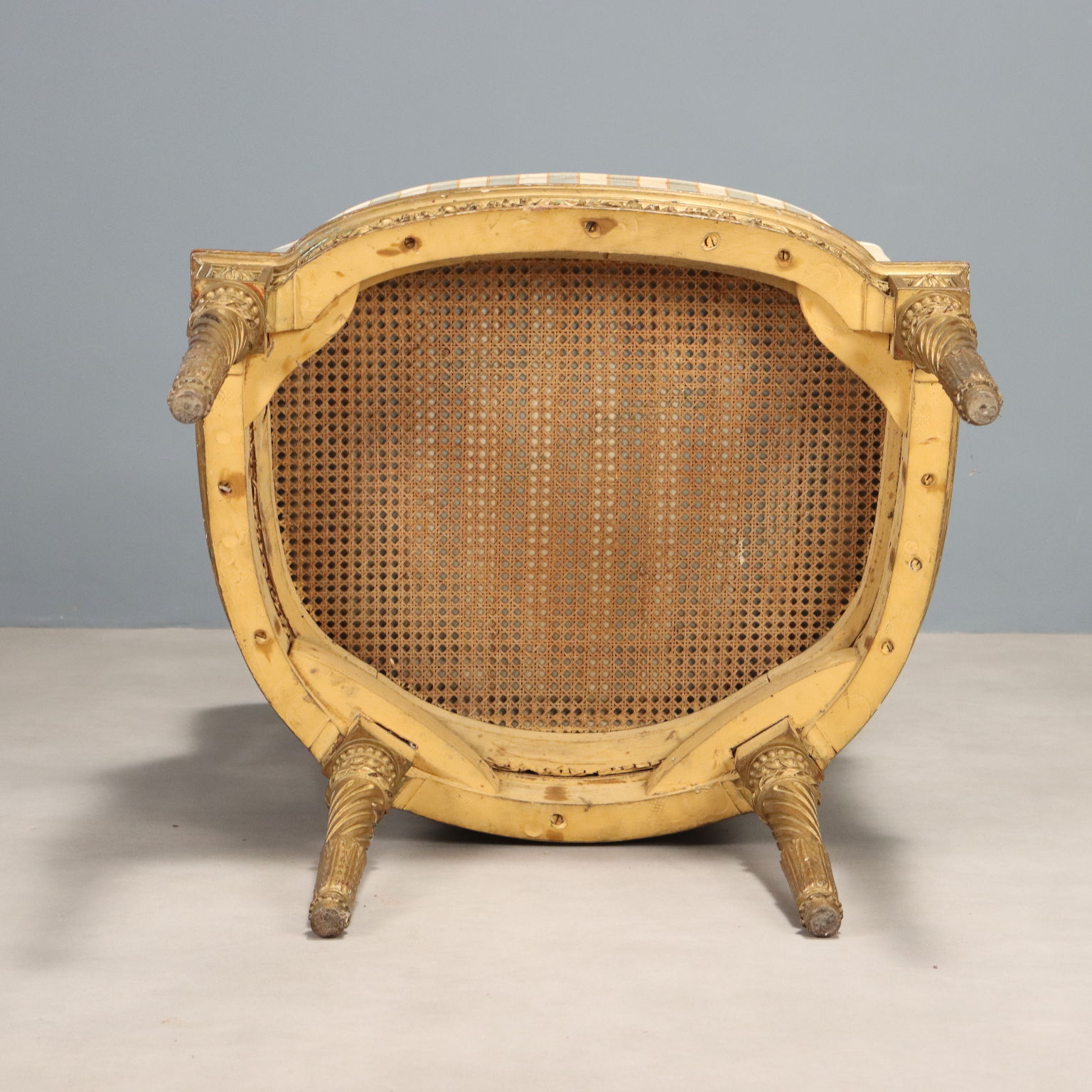 Sillón neoclásico. Respaldo envolvente con doble entramado dorado y tapizado en tela, tallado con hojas, flores, cuentas y una cinta central. Patas cónicas truncadas, asiento de mimbre con cojín, reposabrazos acolchados. Italia, finales del siglo XIX.